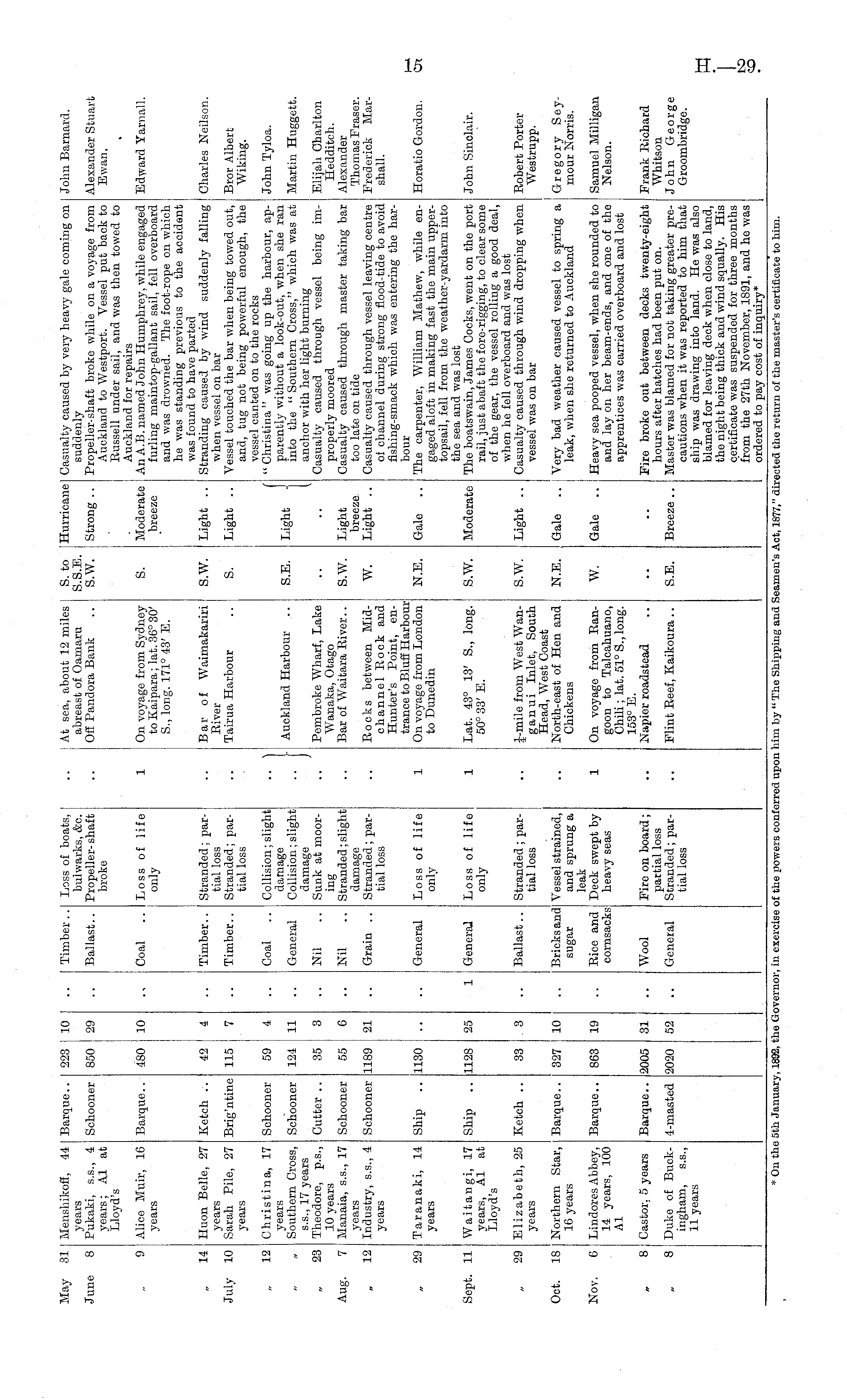 May Menshikofi, 44 Barque.. zzo 10 Timber .. Loss of boats, bulwarks, &c. Propeller- shaft broke At sea, about 12 miles abreast of Oamaru Off Pandora Bank S. to S.S.E. S.W. Hurricane Casualty caused by very heavy gale coming on suddenly Propeller-shaft broke while on a voyage from Auckland to Westport. Vessel put back to Russell under sail, and was then towed to Auckland for repairs An A.B. named John Humphrey, while engaged furling maintop-gallant sail, fell overboard and was drowned. The foot-rope on which he was standing previous to the accident was found to have parted Stranding caused by wind suddenly falling when vessel on bar Vessel touched the bar when being towed out, and, tug not being powerful enough, the vessel canted on to the rocks " Christina" was going up the harbour, apparently without a look-out, when she ran into the " Southern Cross," which was at anchor with her light burning Casualty caused through vessel being improperly moored Casualty caused through master taking bar too late on tide Casualty caused through vessel leaving centre ol channel during strong flood-tide to avoid fishing-smack which was entering the harbour The carpenter, William Mathew, while engaged aloft in making fast the main uppertopsail, fell from the weather-yardarm into the sea and was lost The boatswain, James Cocks, went on the port rail, just abaft the fore-rigging, to clear some of the gear, the vessel rolling a good deal, when he fell overboard and was lost Casualty caused through wind dropping when vessel was on bar John Barnard. June 8 years Pukaki, s.s., 4 years; Al at Lloyd's Schooner 850 29 Ballast.. Strong .. Alexander Stuart Ewan. 9 Alice Muir, 16 years Barque.. Coal .. Loss of life only 1 On voyage from Sydney to Kaipara; lat. 36° 30' S., long. 171° 43' E. s. Moderate breeze Edward Yarn all. 480 10 Huon Belle, 27 Ketch .. Timber.. Stranded; partial loss Stranded; partial loss Bar of Waimakariri River Tairua Harbour Light .. Charles Neilson. 14 42 4 S.W. July 10 years Sarah Pile, 27 years Brig'ntine 115 7 Timber.. S. Light .. Bror Albert Wiking. 12 Christina, 17 years Southern Cross, s.s., 17 years Theodore, p.s., 10 years Manaia, s.s., 17 years Industry, s.s., 4 years Schooner Schooner 59 124 4 11 Coal .. General Collision; slight damage Collision; slight damage Sunk at mooring Stranded; slight damage Stranded; partial loss ;i Auckland Harbour .. S.E. Light J John Tyloa. Martin Huggett. 23 Cutter .. 35 3 Nil Pembroke Wharf, Lake Wanaka, Otago Bar of Waitara Biver.. Elijah Charlton Hedditch. Alexander Thomas Fraser. Frederick Marshall. Aug. 7 Schooner 55 6 Nil S.W. Light breeze Light .. 12 29 Taranaki, 14 years Schooner Ship 1189 21 Grain .. General Loss of life only i E o c k s between Midchannel Eoek and Hunter's Point, entrance to Bluff Harbour On voyage from London to Dunedin W. N.E. Gale .. Horatio Gordon. 1130 Sept. 11 Waitangi, 17 years, Al at Lloyd's Ship 1128 25 General Loss of life only i Lat. 43° 13' S., long. 50°33'E. S.W. Moderate John Sinclair. 29 Elizabeth, 25 Ketch .. 33 3 Ballast.. Stranded; partial loss J-mile from West Wanganui Inlet, South Head, West Coast North-east of Hen and Chickens S.W. Light .. Robert Porter Westrupp. years Oct. 18 Northern Star, 16 years Barque.. 327 10 Bricks and sugar Vessel strained, and sprung a leak Deck swept by heavy seas N.E. Gale .. Very bad weather caused vessel to spring a leak, when she returned to Auckland Gregory Seymour Norris. Nov. G Lindores Abbey, 14 years, 100 Al Barque.. 863 19 Eice and cornsacks i On voyage from Rangoon to Talcahuano, Chili; lat. 51° S., long. 153° E. Napier roadstead W. Gale .. Heavy sea pooped vessel, when she rounded to and lay on her beam-ends, and one of the apprentices was carried overboard and lost Samuel Milligan Nelson. 8 Castor. 5 years Barque.. Wool Fire on board; partial loss Stranded; partial loss Fire broke out between decks twenty-eight hours after hatches had been put on. Master was blamed for not taking greater precautions when it was reported to him that ship was drawing into land. He was also blamed for leaving deck when close to land, the night being thick and wind squally. His certificate was suspended for three months from the 27th November, 1891, and he was ordered to pay cost of inquiry* Frank Richard Whitson John George Groombridge. 2005 31 8 Duke of Buckingham, s.s., 11 years 4-masted 2020 52 General Flint Eeef, Kaikoura .. S.E. Breeze .. * On the 5th January, 1892, the Governor, in exercise of the powers conferred upon him by " The Shipping and Seamen's Act, 1877," directed the return of the master's certificate to him.