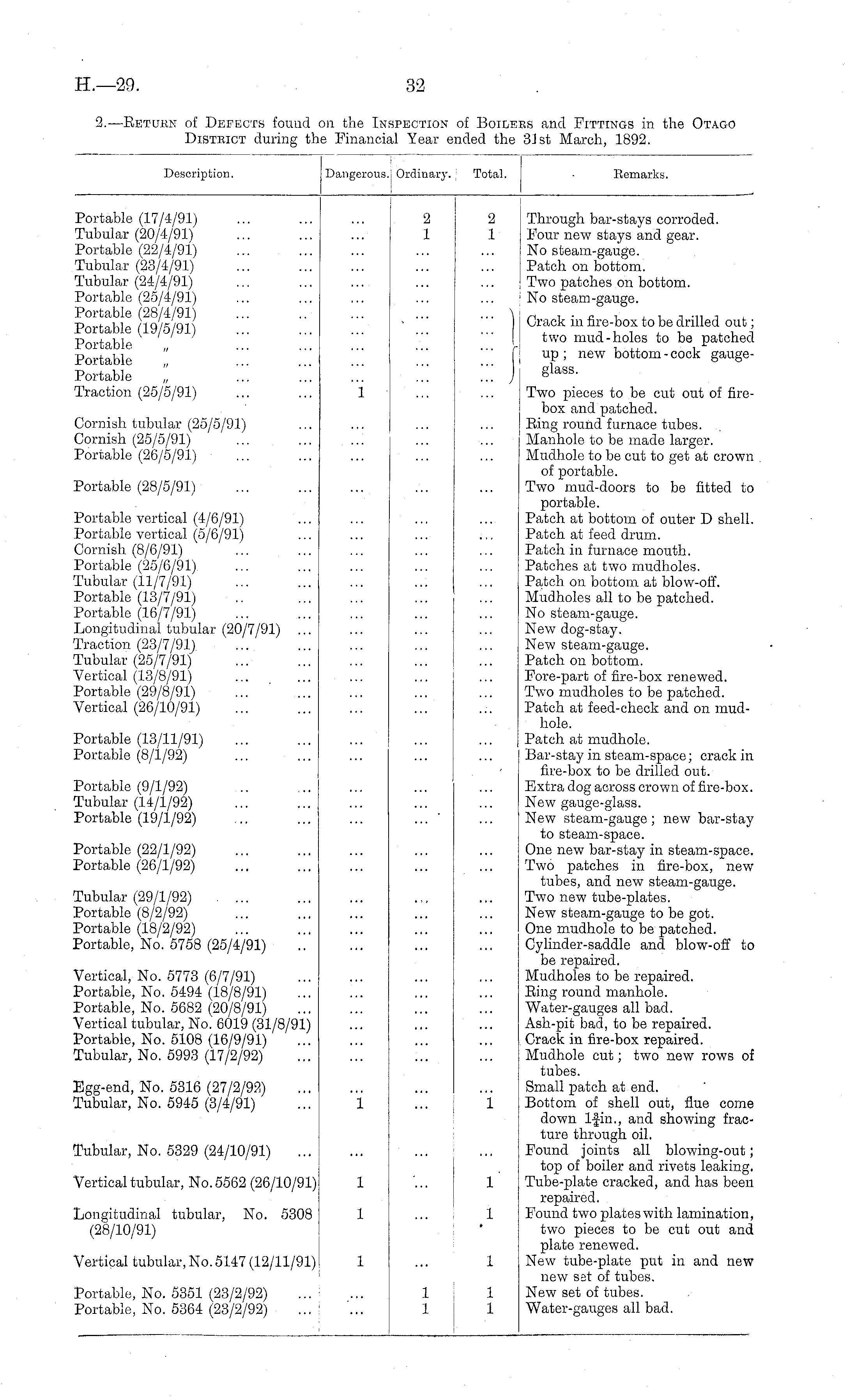 2.— Return of Defects found on the Inspection of Boilers and Fittings in the Otago District during the Financial Year ended the 31st March, 1892.