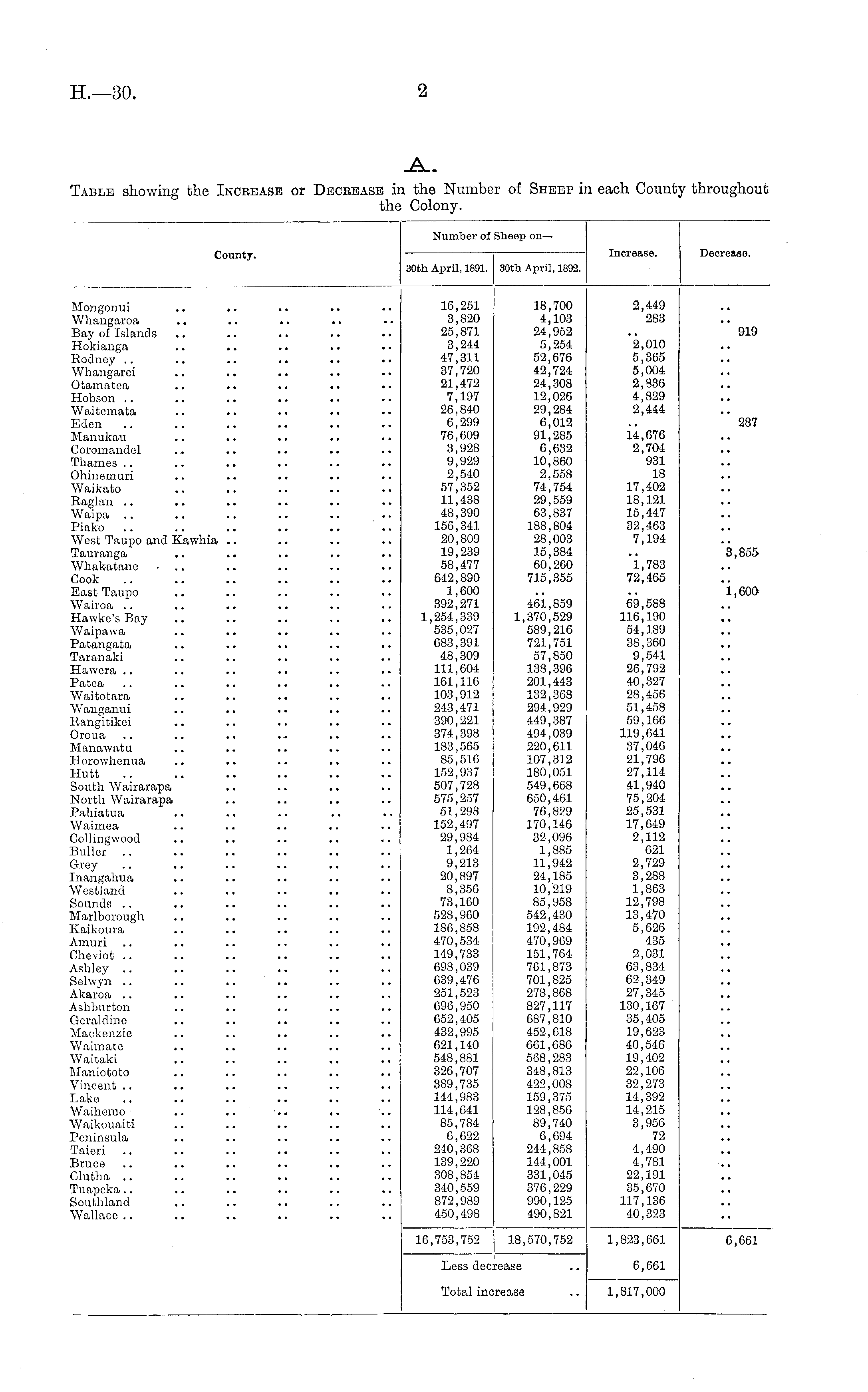 fuml >er oj ieep on— ■ County. 30th April, 1891. 30th April, 1892. Increase. Decrease. Mongonui .. .. Whangaroa Bay of Islands Hokianga Rodney Whangarei Otamatea Hobson .. Waitemata Eden Manukau Coromandol Thames Ohinemuri Waikato Raglan Wai pa Piako West Taupo and Kawhia .. Tauranga Whakatane • Cook East Taupo Wairoa Hawke's Bay Waipawa Patangata Taranaki Hawora Patoa Waitotara Wanganui Rangitikoi Oroua Manawatu Horowhonua Hutt South Wairarapa North Wairarapa Pahiatua Waimea Collingwood Bullcr .. Grey Inangahua Westland Sounds .. Marlborougli Kaikoura Amuri Cheviot Ashley Selwyn Akaroa Ashburton Geraldine Mackenzie Waimate Waitaki Maniototo Vincent Lake Wailiomo Waikouaiti Peninsula Taiori Bruce Clutha Tuapeka Southland Wallace 16,251 3,820 25,871 3,244 47,311 37,720 21,472 7,197 26,840 6,299 76,609 3,928 9,929 2,540 57,352 11,438 48,390 156,341 20,809 19,239 58,477 642,890 1,600 392,271 1,254,339 535,027 683,391 48,309 111,604 161,116 103,912 243,471 390,221 374,398 183,565 85,516 152,937 507,728 575,257 51,298 152,497 29,984 1,264 9,213 20,897 8,356 73,160 528,960 186,858 470,534 149,733 698,039 639,476 251,523 696,950 652,405 432,995 621,140 548,881 326,707 389,735 144,983 114,641 85,784 6,622 240,368 139,220 308,854 340,559 872,989 450,498 18,700 4,103 24,952 5,254 52,676 42,724 24,308 12,026 29,284 6,012 91,285 6,632 10,860 2,558 74,754 29,559 63,837 188,804 28,003 15,384 60,260 715,355 461,859 1,370,529 589,216 721,751 57,850 138,396 201,443 132,368 294,929 449,387 494,039 220,611 107,312 180,051 549,668 650,461 76,8?9 170,146 32,096 1,885 11,942 24,185 10,219 85,958 542,430 192,484 470,969 151,764 761,873 701,825 278,868 827,117 687,810 452,618 661,686 568,283 348,813 422,008 159,375 128,856 89,740 6,694 244,858 144,001 331,045 376,229 990,125 490,821 2,449 283 2,010 5,365 5,004 2,S36 4,829 2,444 14,676 2,704 931 18 17,402 18,121 15,447 32,463 7,194 1,783 72,465 69,588 116,190 54,189 38,360 9,541 26,792 40,327 28,456 51,458 59,166 119,641 37,046 21,796 27,114 41,940 75,204 25,531 17,649 2,112 621 2,729 3,288 1,863 12,798 13,470 5,626 435 2,031 63,834 62,349 27,345 130,167 35,405 19,623 40,546 19,402 22,106 32,273 14,392 14,215 3,956 72 4,490 4,781 22,191 35,670 117,136 40,323 919 28T 3,855 i>600 16,753,752 18,570,752 1,823,661 6,661 Less dec! 6,661 rease Total inc irease 1,817,000
