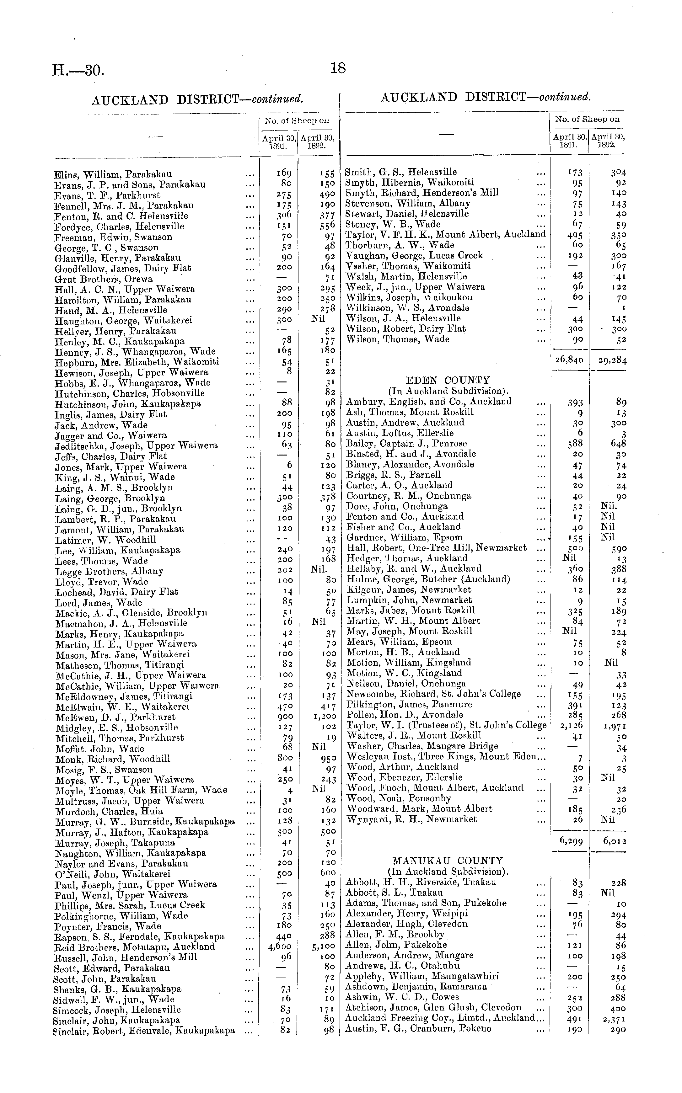 No. ol Sheep on Ajiril 30, 1891. April 30, 1882. Smith, G. S., Helensville Smyth, Hibernia, Waikomiti Smyth, Bichard, Henderson's Mill Stevenson, William, Albany Stewart, Daniel, Helensville Stoney, W. B., Wade Taylor, V. F. H. K., Mount Albert, Auckland Thorburn, A. W., Wade Vaughan, George, Lucas Creek Vssher, Thomas, Waikomiti Walsh, Martin, Helensville Week, J., jun., Upper Waiwera Wilkins, Joseph, v\ aikoukou Wilkinson, W. S., Avondale Wilson, J. A., Helensville Wilson, Robert, Dairy Flat Wilson, Thomas, Wade 173 95 97 75 12 67 495 60 3°4 02 140 i« 40 59 35O 65 300 167 4i 122 7° 1 192 43 96 60 44 300 90 26,840 MS 300 52 EDEN COUNTY (In Auckland Subdivision). Ambury, English, and Co., Auckland Ash, Thomas, Mount Boskill Austin, Andrew, Auckland Austin, Loffcus, Ellerslie Bailey, Captain J., Penrose Binsted, H. and J., Avondale Blaney, Alexander, Avondale Briggs, B. S., Parnell Carter, A. O., Auckland Courtney, B. M., Onehunga Dore, John, Onehunga Fenton and Co., Auckland Fisher and Co., Auckland Gardner, William, Epsom Hall, Boberfc, One-Tree Hill, Newmarket ... Hedger, 'J homas, Auckland Hellaby, B. and W., Auckland Hulme, GreoJ'ge, Butcher (Auckland) Kilgour, James, Newmarket Lumpkin, John, Newmarket Marks, Jabez, Mount Boskill Martin, W. H., Mount Albert May, Joseph, Mount Boskill Mears, William, Epsom Morton, H. B., Auckland Motion, William, Ivingsland Motion, W. C, Kingsland Neilson, Dajiiel, Onehunga Newcombe, Bichard. St. John's College Pilkinglon, James, Panmure Pollen, Hon. D., Avondale Taylor, W. I. (Trusteesof), St. John's College Walters, J. B., Mount Boskill WaEher, Charles, Mangare Bridge Wesleyau Ijist., Three Kings, Mount Eden... Wood, Arthur, Auckland Wood, Ebenezer, Ellerslie Wood, Knoch, Mount Albert, Auckland Wood, Noah, Ponsonby Woodward, Mark, Mount Albert Wynyard, K. H., Newmarket 29,284 393 9 3° 6 588 20 89 300 47 44 20 3 648 3° 74 22 24 90 Nil. Nil Nil Nil 40 52 17 40 '55 c;0() Nil 360 "86 12 S9° '3 388 114 22 9 325 84 Nil 15 189 7 2 224 5 3 8 75 jo JO 49 ■55 39' 285 2,126 Nil 33 42 195 123 268 1,971 5° 34 3 25 Nil 41 7 5° 3° 32 i8S 26 32 20 236 Nil MANUKAU COUNTY (In Auckland Subdivision). Abbott, H. H., Biverside, Tuakau Abbott, S. Jμ, Tuakau Adams, Thomas, and Son, Pukekohe Alexander, Henry, Waipipi Alexander, Hugh, Clevedon Allen, F. M., Brookby Allen, John, Pukekohe Anderson, Andrew, Mangare Andrews, H. C, Otahuhu Appleby, William, Maungatawhiri Ashdown, Benjamin, Bamarama Ashwin, W. 0. D., Cowes Atchison, James, Glen Glush, Clevedon Auckland Coy., IJimtd., Auckland,., Austin, F. G-., Cranburn, Pokeno 6,299 6,012 83 83 228 Nil "95 76 10 294 80 1 21 100 44 86 198 15 2^0 64 288 200 2,52 300 491 190 400 2)37' 290