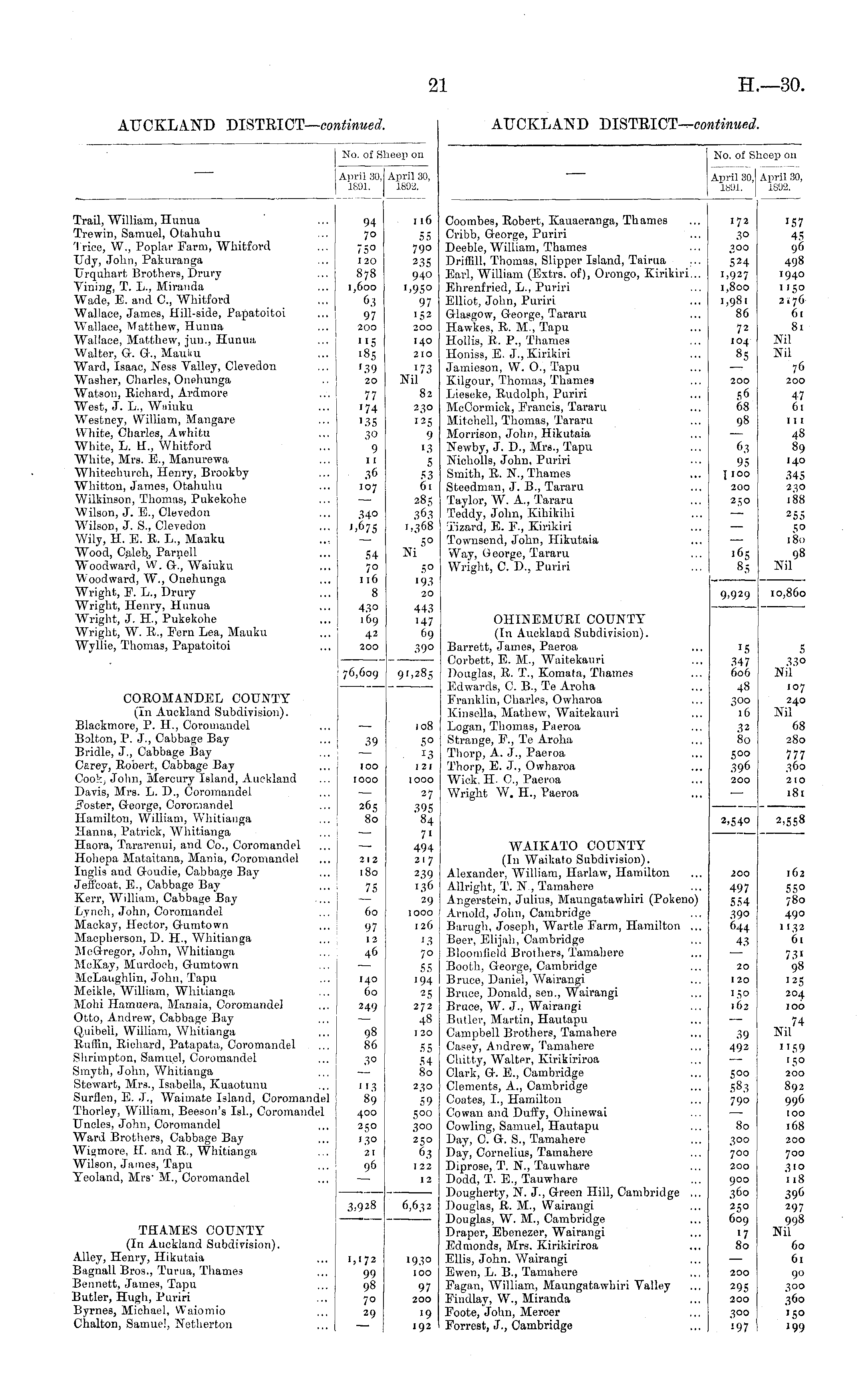 No. of Sheep 011 April 30, April 30, lbOi. 1SU2. Coombes, Robert, Kauaeranga, Thames Cribb, George, Puriri Deeble, William, Thames Driffill, Thomas, Slipper Island, Tairiia Earl, William (Extrs. of), Orongo, Kirikiri... Ehrenfried, L., Puriri Elliot, John, Puriri Glasgow, George, Tararu Hawkes, R. M., Tapu Hollis, R. P., Thames Honiss, E. J., Kirikiri Jamieson, W. 0., Tapu Kilgour, Thomas, Thames Lieseke, Rudolph, Puriri McCormick, Eraneis, Tararu Mitchell, Thomas, Tararu Morrison, John, Hikutaia Newby, J. D., Mrs., Tapu Nicholls, John, Puriri Smith, R. N., Thames Steedman, J. B., Tararu Taylor, W. A., Tararu Teddy, John, Kihikihi xizard, E. E., Kirikiri Townsend, John, Hikutaia Way, O eorge, Tararu Wright, C. D., Puriri 172 3° 300 524 1,927 1,800 i>981 86 72 104 _8S 200 S6 68 98 63 95 [ 100 200 1.57 45 96 498 1940 1150 2,76 61 81 Nil Nil 7 6 200 47 61 111 48 89 140 345 230 188 250 255 5° 180 98 Nil '65 85 9,929 10,860 OHINEMURI COUNTY (In Auckland Subdivision). Barrett, James, Paoroa Corbett, E. M., Waitekauri Douglas, R. T., Komala, Thames Edwards, C. B., Te Aroha Franklin, Charles, Owharoa Kinsella, Mathew, Waitekauri Logan, Thomas, Paeroa Strange, P., Te Aroha Thorp, A. J., Paeroa Thorp, E. tJ., Owharoa Wick. H. 0., Paeroa Wright W, H., Paeroa 15 347 606 48 300 16 32 80 500 396 200 5 33° Nil 107 240 Nil 68 280 777 360 210 181 WAIKATO COUNTY (In Waikato Subdivision). Alexander, William, Harlaw, Hamilton Allright, T. N , Tamahere Angerstein, Julius, Maungatawhiri (Pokeno) Arnold, John, Cambridge Barugh, Joseph, Wartle Farm, Hamilton ... Beer, Elijah, Cambridge Bloomfield Brothers, Tamahere Booth, George, Cambridge Bruce, Daniel, Wairangi Bruce, Donald, sen., Wairangi Bruce, W. J., Wairangi Butler, Martin, Hautapn Campbell Brothers, Tamahere Casey, Andrew, Tamahere Chitty, Walter, Kirikiriroa Clark, G. E., Cambridge Clements, A., Cambridge Coates, I., Hamilton Cowan and Duffy, Ohinewai Cowling, Samuel, Hautapu Day, C. G. S., Tamahere Day, Cornelius, Tamahere Diprose, T. N., Tauwhare Dodd, T. E., Tauwhare Dougherty, N. J., Green Hill, Cambridge ... Douglas, R. M., Wairangi Douglas, W. M., Cambridge Draper, Ebonezer, Wairangi Edmonds, Mrs. Kirikiriroa Ellis, John. Wairangi Ewen, L. B., Tamahere Fagan, William, Maungatawhiri Valley Findlay, W., Miranda Foote, John, Mercer Forrest, J., Cambridge 2.540 2,558 200 497 554 39° 644 43 162 55° 780 490 1 6! 20 120 150 j 162! - I 1 39 492 731 98 125 204 100 74 Nil "59 150 200 892 996 100 168 5°o 583 790 80 300 700 200 200 900 360 250 609 '7 80 700 3'° 118 396 297 998 Nil 60 61 200 295 200 90 300 360 'SO 199 300 197 I