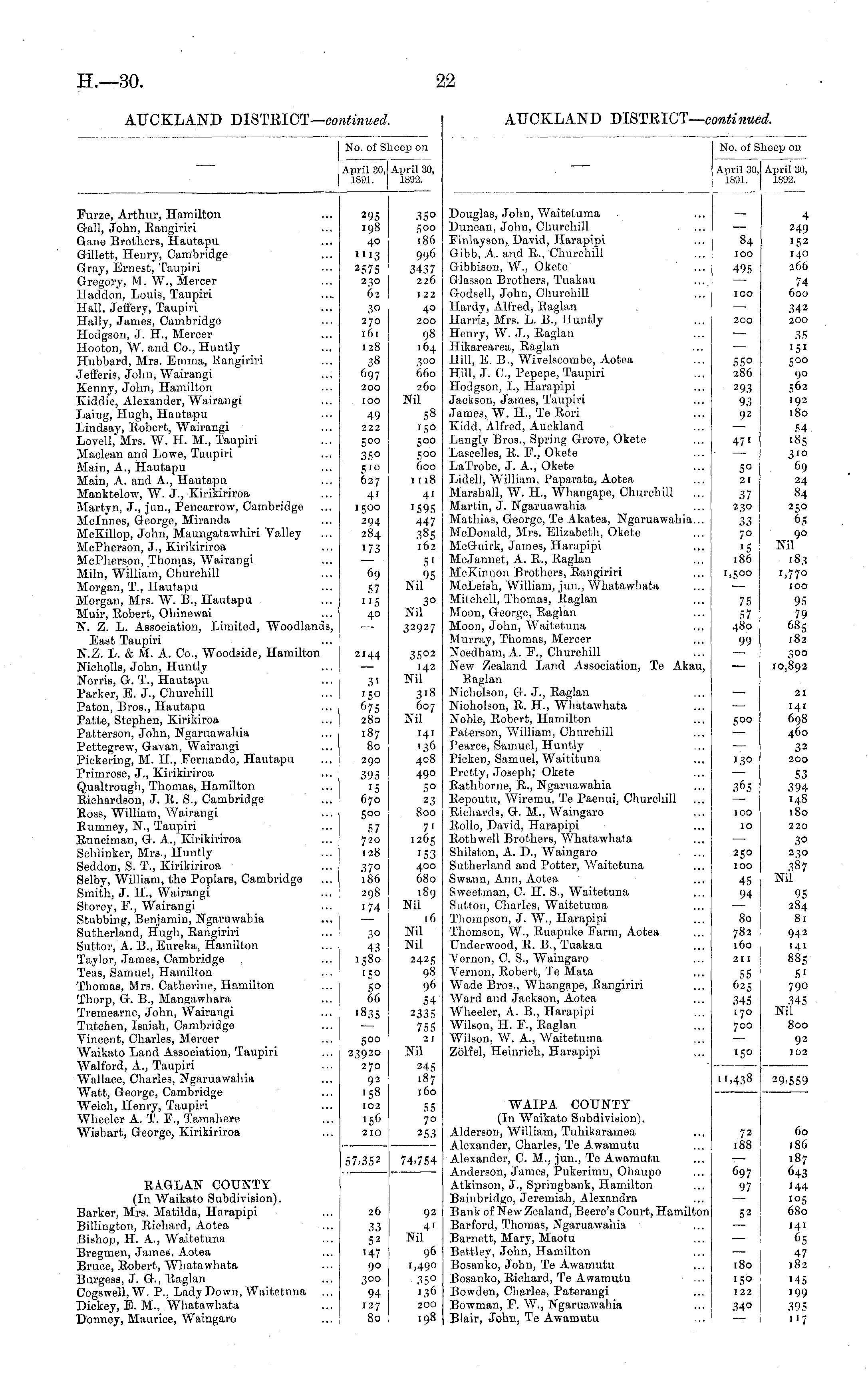 No. of Sheep on April 30, April 30, 1891. 1892. Furze, Arthur, Hamilton Gall, John, Kangiriri Gane Brothers, Hautapu Gillett, Henry, Cambridge Gray, Ernest, Taupiri Gregory, M. W., Mercer Haddon, Louis, Taupiri Hall, Jeffery, Taupiri llally, James, Cambridge Hodgson, J. H., Mercer Hooton, W. and Co., Huntly llubbard, Mrs. Emma, Kangiriri Jefferis, John, Wairangi Kenny, John, Hamilton Kiddie, Alexander, Wairangi Laing, Hugh, Hautapu Lindsay, Robert, Wairangi Lovell, Mrs. W. H. M., Taupiri Maclean and Lowe, Taupiri Main, A., Hautapu Main, A. and A., Hautapu Mankfcelow, W. J-, Kirikiriroa Martyn, J., jira., Pencarrow, Cambridge Mclnnes, George, Miranda McKillop, John, Maungatawhiri Valley MePherson, J., Kirikiriroa McPherson, Thomas, Wairangi Miln, William, Churchill Morgan, T., Hautapu Morgan, Mrs. W. B., Hautapu Muir, Robert, Ohinewai N. Z. L. Association, Limited, Woodla,nds, East Taupiri N.Z. L. & M. A. Co., Woodside, Hamilton Nicholls, John, Huntly Norris, G. T., Hautapu Parker, E. J., Churchill Paton, Bros., Hautapu Patte, Stephen, Kirikiroa Patterson, John, Ngaruawahia Pettegrew, Garan, Wairangi Pickering, M. H., Fernando, Hautapu Primrose, J., Kirikiriroa Qualtrough, Thomas, Hamilton Richardson, J. R. S., Cambridge Ross, William, AVairangi Rumney, N., Taupiri Runeiman, G. A., Kirikiriroa Schlinker, Mrs., Huntly Seddon, S. T., Kirikiriroa Selby, William, the Poplars, Cambridge Smith, J. H., Wairangi Storey, F., Wairangi Stabbing, Benjamin, Ngaruwahia Sutherland, Hugh, Rangiriri Suttor, A. B., Eureka, Hamilton Taylor, James, Cambridge Teas, Samuel, Hamilton Thomas, Mrs. Catherine, Hamilton Thorp, G. B., Mangawhara Tremearne, John, Wairangi Tutehen, Isaiah, Cambridge Vincent, Charles, Mercer Waikato Land Association, Taupiri Walford, A., Taupiri Wallace, Charles, Ngaruawahia Watt, George, Cambridge Welch, Henry, Taupiri Wheeler A. T. ¥., Tamahere Wishart, George, Kirikiriroa 295 198 40 1113 2 575 230 62 3" 270 161 128 38 697 200 100 49 222 500 35° S 10 627 4' 1500 294 284 173 69 57 "5 40 2144 3' 150 675 280 187 80 35° 500 186 996 3437 226 122 40 2OO 98 .64 300 660 260 Nil 58 150 500 500 600 1118 41 '595 447 385 162 51 95 Nil 30 Nil 32927 35 02 142 Nil 318 607 Nil 290 395 '5 670 500 5 7 720 128 37° 186 298 .74; 141 136 408 490 5° 23 800 7' 1265 'S3 400 680 189 Nil 3° 43 1580 ■5° 5° 66 '835 16 Nil Nil 2425 98 96 54 2335 755 1 1 Nil 5°° 23920 270 92 '58 102 156 210 245 .87 160 55 7° 253 RAGLAN COUNTY (In Waikato Subdiyision). Barker, Mrs. Matilda, Harapipi Billiugton, Richard, Aotea — Bishop, H. A., Waitetuna Bregmen, James, Aolea Bruce, Robert, Whatawhata Burgess, J. G., Raglan Cogswell, W. P., Lady Down, Waitotnna Dickey, E. M., Whatawhata Donney, Maurice, Waingaro 57>35 2 74.754 26 92 41 Nil 96 1,490 35° ,36 200 198 33 5 2 '47 90 300 94 T27 8O