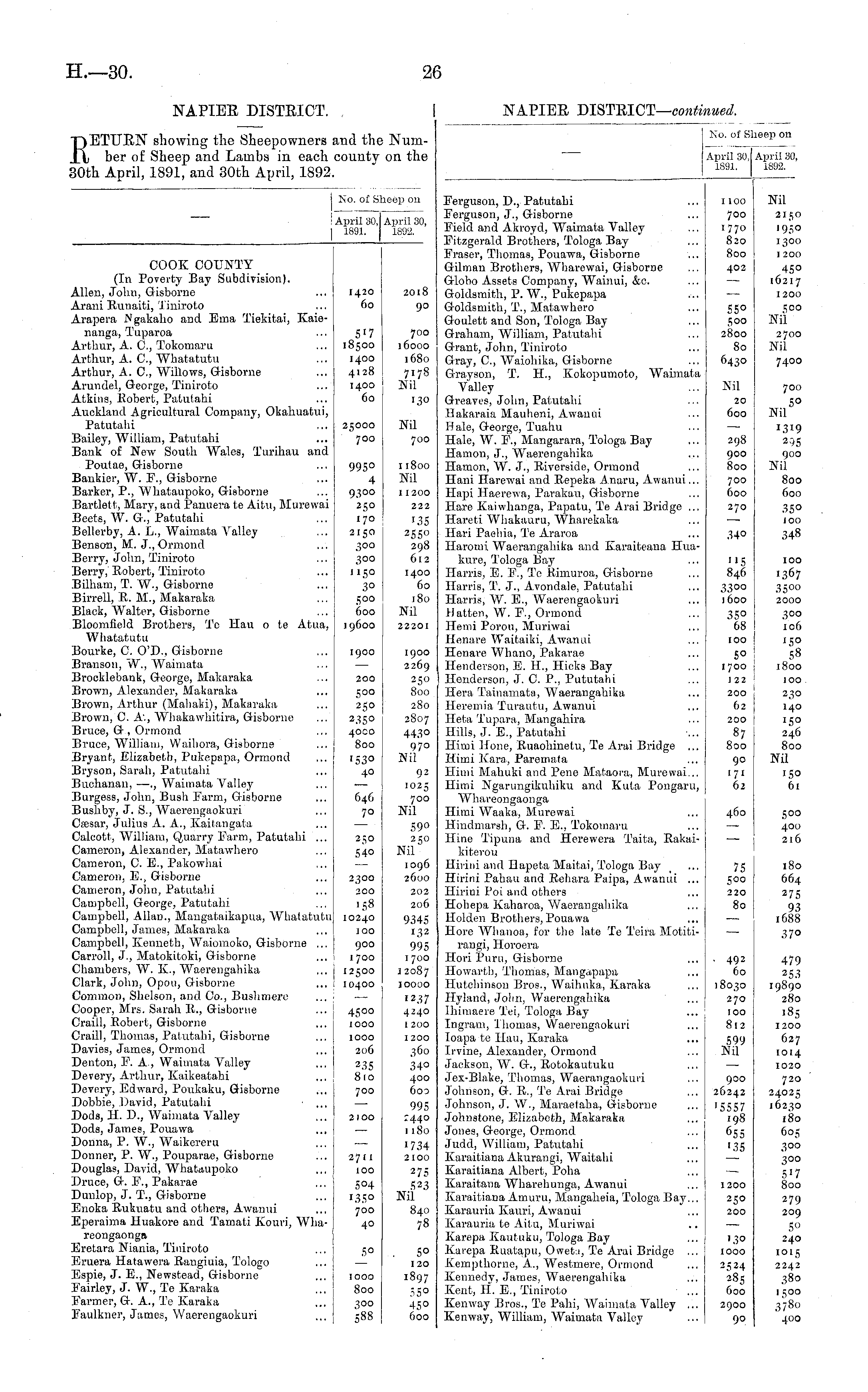 NAPIER DISTRICT. RETURN showing the Sheepowners and the Number of Sheep and Lambs in each county on the 30th April, 1891, and 30th April, 1892.