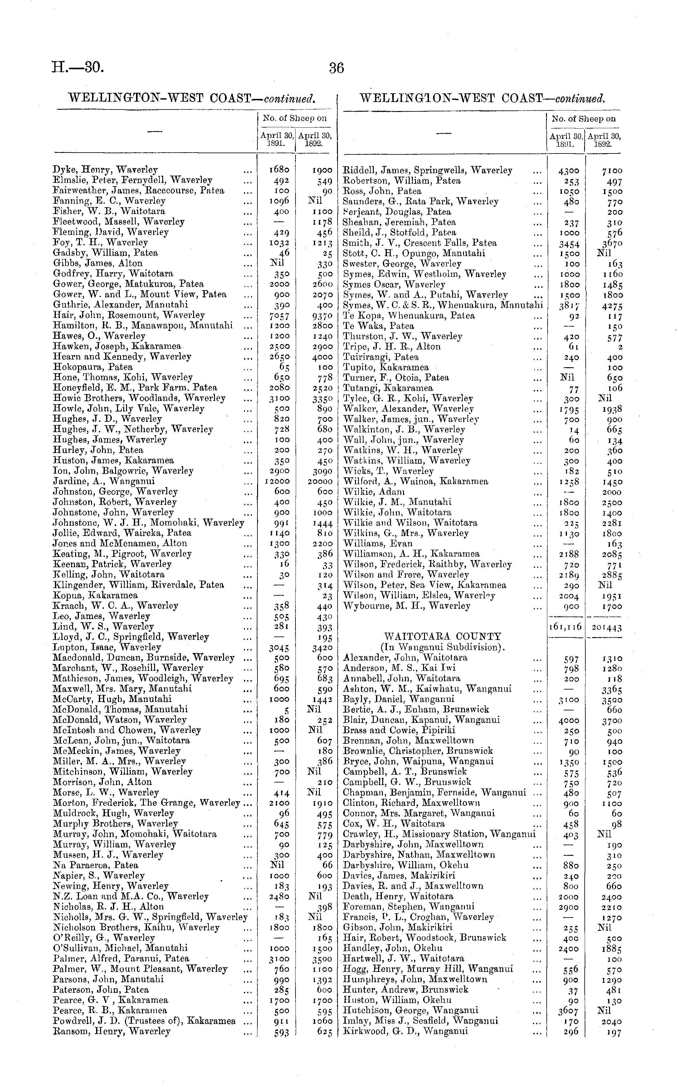 No. of Sheep on April 30. 1891. April 30, 1892. Dyke, Henry, Waverley Elmslie, Peter, Fernydell, Waverley Fairweathcr, James, Racecourse, Patea Panning, E. C, Waverley Fisher, W. B., Waitotara Fleetwood, Massell, Waverley Fleming, David, Waverley Foy, T. H., Waverley G-adsby, William, Patea Gibbs, James, Alton Godfrey, Harry, Waitotara Grower, George, Matukuroa, Patea Gowcr, W. and L., Mount View, Patea Guthrie, Alexander, Manutahi Hair, John, Rosemount, AVaverley Hamilton, B. B., Manawapou, Manntahi ... Hawes, 0., Waverley Hawken, Joseph, Kakaramea Hearn and Kennedy, Waverley Hokopaura, Patea Hone, Thomas, Kohi, Waverley Honeyfield, E. M., Park Farm, Patea Howie Brothers, Woodlands, Waverley Howie, John, Lily Vale, Waverley Hughes, J. D., Waverley Hughes, J. W., Netherby, Waverley Hughes, Jamesi Waverley Hurley, John, Patea Huston, James, Kakaramea Ion, John, Balgowrie, Waverley Jardine, A., Wanganui Johnston, George, Waverley Johnston, Robert, Waverley Johnstone, John, Waverley Johnstone, W. J. H., Momohaki, Waverley Jollie, Edward, Waireka, Patea Jones and McMcnamen, Alton Keating, M., Pigroot, Waverley Keenan, Patrick, Waverley Kelling, John, Waitotara Klingender, William, Riverdale, Patea Kopua, Kakaramea Kraach, W. C. A., Waverley Leo, James, Waverley Lind, W. S., Waverley Lloyd, J. C, Springfield, Waverley Lnpton, Isaac, Waverley Macdonald, Duncan, Burnside, Waverley ... March ant, W., Rosehill, Waverley Mathieson, James, Woodleigh, Waverley ... Maxwell, Mrs. Mary, Manutalii McCarty, Hugh, Manutahi McDonald, Thomas, Manutahi McDonald, Watson, Waverley Melntosh and Chowen, Waverley McLean, John, jun., Waitotara McMeckin, James, Waverley Miller, M. A., Mrs., Waverley Mitchinson, William, Waverley Morrison, John, Alton Morse, L. W., Waverley Morton, Frederick, The Grange, Waverley ... Muldrock, Hugh, Waverley Murphy Brothers, Waverley Murray, John, Momohaki, Waitotara Murray, William, Waverley Mussen, H. J., Waverley Na Paraeroa, Patea Napier, S., Waverley Newing, Henry, Waverley N.Z. Loan and M.A. Co., Waverley Nicholas, R. J. H., Alton Nicholls, Mrs. G. W., Springfield, Waverley Nicholson Brothers, Kama, Waverley O'Reilly, &., Waverley O'Sullivan, Michael, Manutalii Palmer, Alfred, Paranui, Patea Palmer, W., Mount Pleasant, Waverley Parsons, John, Manutahi Paterson, John, Patea Pearce, G. V , Kakaramea Pearce, B, B., Kakaramea Powdrell, J. D. (Trustees of), Kakaramea ... Ransom, Henry, Waverley i68o 1900 549 90 Nil 492 100 1096 400 429 1032 46 Nil 35° 2000 1100 1178 45 6 1213 25 330 500 2600 2070 400 9370 2800 900 39° 7°57 1200 1200 1240 2900 4000 100 778 2520 335° 890 700 680 400 270 45° 3090 20000 600 2500 2650 65 650 2080 3100 500 820 728 100 200 35° 2900 12000 600 400 900 991 1140 1300 33° 16 45° 1000 1444 810 2200 386 120 3° 358 5°5 281 3'4 23 440 43" 393 195 3420 600 304.S 500 580 6 95 600 57° 683 59° 1442 Nil 1000 5 180 1000 500 252 Nil 607 180 386 Nil 300 700 414 2100 96 645 700 90 300 Nil 1000 '83 2480 210 Nil 1910 495 575 779 125 400 66 600 193 Nil '83 1800 398 Nil 1800 165 1500 35°° 1100 1000 3100 760 990 285 1700 500 911 593 ■392 600 1700 595 1060 625