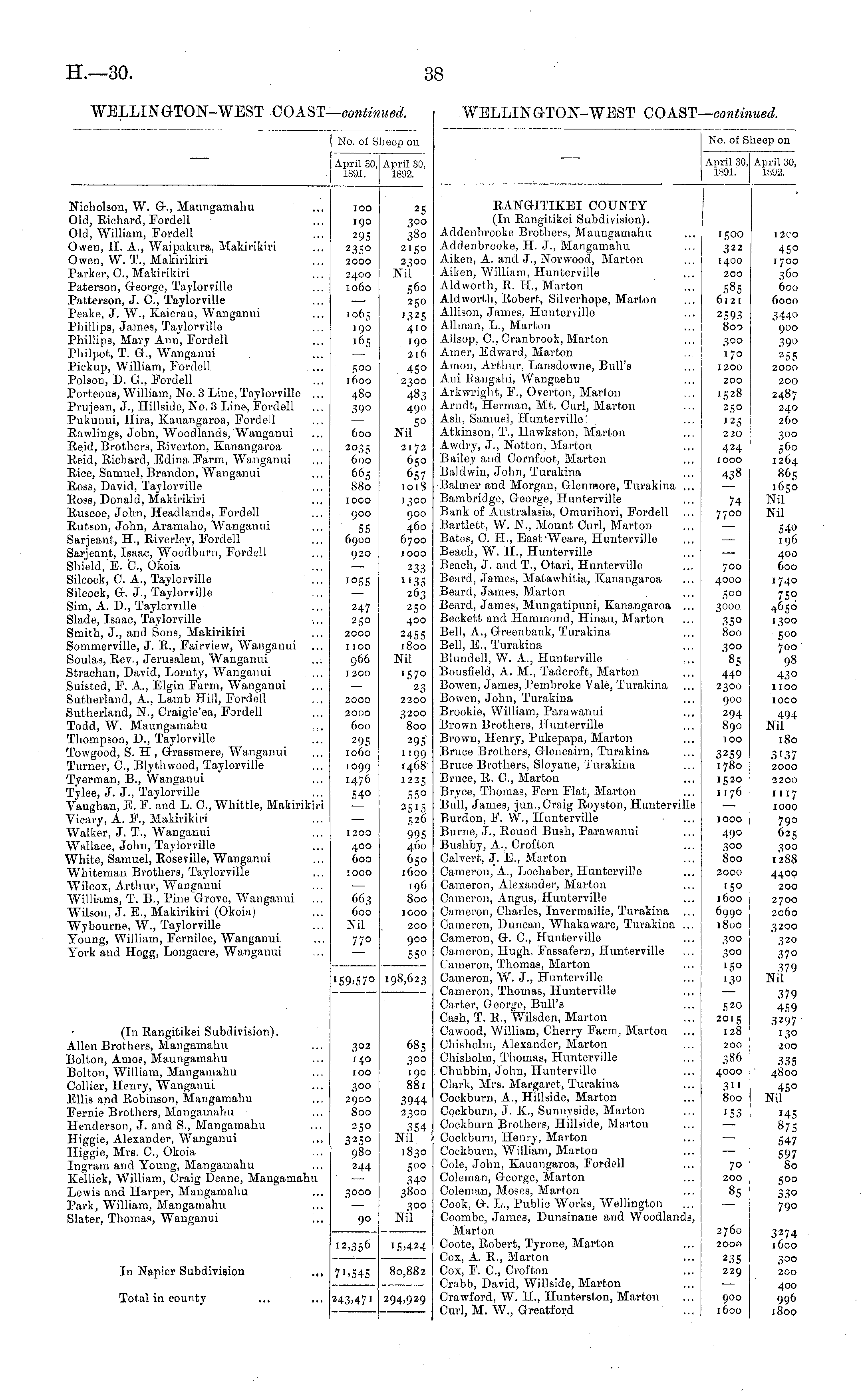 No. of Sheep on April 30, April 30, 1891. 18<J2. RANGITIKEI COTJNTY (In Bangitikei Subdivision). Addenbrooke Brothers, Maungamahu Addenbrooke, H. J., Mangamahu Aiken, A. and J., Norwood, Marton Aiken, William, Hunterville Aldworth, R. II., Marton Aldworth, Koberfc, Silverhope, Marton Allison, James, Hunterville Allman, L., Marton Allsop, C, Cranbrook, Marton Amer, Edward, Marton Amon, Arthur, Lansdowne, Bull's Ani Kangalii, Wangaehu Arkwright, F., Overtoil, Marlon Arndt, Herman, Mt. Curl, Marton Ash, Samuel, Hunterville: Atkinson, T., Hawkston, Marton Awdry, J., Notton, Marton Bailey and Comfoot, Marton Baldwin, John, Turakina Baliner and Morgan, Glenmore, Turakina ... Bambridge, George, Hunterville Bank of Australasia, Omuriliori, Fordell Bartlett, W. JN T ., Mount Curl, Marton Bates. C. II., EasfWeare, Hunterville Beach, W. H., Hunterville Beach, J. and T., Otari, Huntervillo Beard, James, Matawhitia, Kanangaroa Beard, James, Marton Beard, James, Mungatipuni, Kanangaroa ... Beckett and Hammond, Hinau, Marton Bel], A., Greenbank, Turakina Bell, E., Turakina Blundell, W. A., Huntervillo Bousfield, A. M., Taderoft, Marton Bowen, James, Pembroke Vale, Turakina Bowen, John, Turakina Brookie, William, Parawanui Brown Brothers, Hunterville Brown, Henry, Pukepapa, Marton Bruce Brothers, Glencairn, Turakina Bruce Brothers, Sloyane, Turakina Bruce, R. C, Marton Bryce, Thomas, Fern Flat, Marton Bull, James, jun.,Craig Royston, Hunterville Burdon, F. W., Hunterville Burne, J"., Round Bush, Parawanui Bushby, A., Crofton Calvert, J. E., Marton Cameron, A., Lochaber, Hunterville Cameron, Alexander, Marton Cameron, Angus, Hunterville Cameron, Charles, Invermailie, Turakina Cameron, Duncan, Whakaware, Turakina ... Cameron, G-. C, Hunterville Cameron, Hugh, Fassafern, Hunterville Cameron, Thomas, Marton Cameron, W. J., Hunterville Cameron, Thomas, Hunterville Carter, George, Bull's Cash, T. R., Wilsden, Marton Cawood, William, Cherry Farm, Martou Chisholm, Alexander, Marton Chisholm, Thomas, Hunterville Chubbin, John, Hunterville Clark, Mrs. Margaret, Turakina Cockburn, A., Hillside, Marton Cockburn, J. K., Sumiyside, Marton Cockburn Brothers, Hillside, Marton Cockburn, Henry, Marton Cockburn, William, Marton Cole, John, Kauangaroa, Fordell Coleman, George, Marton Coleman, Moses, Marton Cook, ». L., Public Works, Wellington Coombe, James, Dunsinane and Woodlands, Mart on Coote, Robert, Tyrone, Marton Cox, A. R., Marton Cox, F. C, Crofton Crabb, David, Willside, Marton Crawford, W. H., Hunterston, Marton Curl, M. W., Greatford 15°° 322 1400 200 585 0121 2593 800 300 '170 I20O 20O 1528 250 220 424 1000 438 74 7700 700 4000 500 3000 35° 800 300 "8S 440 2300 900 294 890 100 32S9 1780 1520 1176 I2C0 45° 1700 360 600 6000 3440 90O 39° 2 55 2000 200 2487 240 2f)O 300 560 I264 865 l6^0 Nil Nil S4o 196 400 600 1740 750 46,50 1300 500 700 98 43° 1100 loco 494 Nil 180 3>37 2000 1000 490 300 800 2200 1117 1000 790 625 300 1288 44°° 200 2000 '5° 1600 6990 1800 300 300 'S° 130 2700 2060 3200 320 37° Nil 79 520 2015 128 379 4S9 3297 130 200 200 386 4000 3" 800 'S3 335 4800 45° Nil 70 200 85 '45 875 547 597 80 5°o 330 790 2760 2000 3274 1600 300 200 235 229 900 1600 400 996 1800