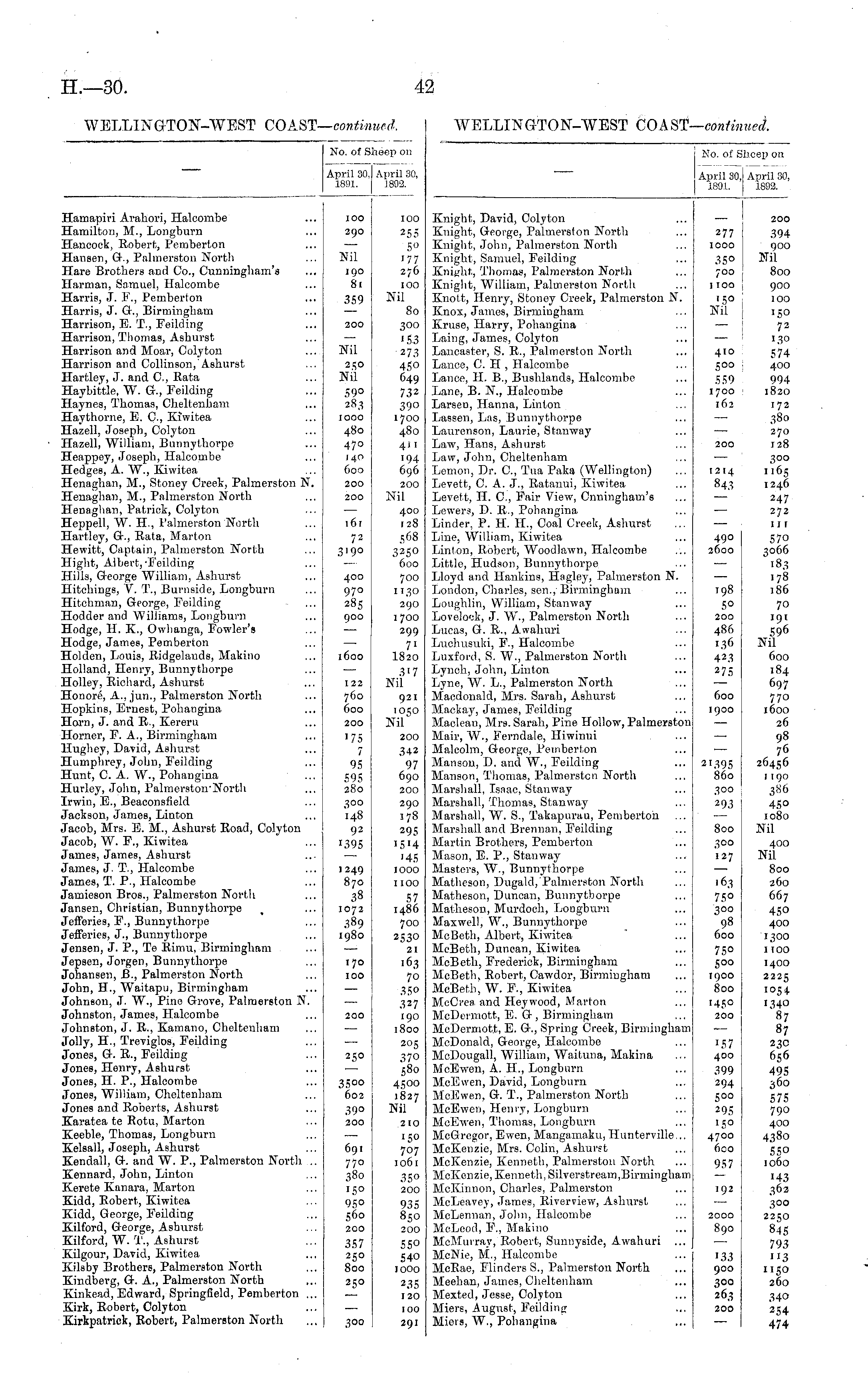 No. of Sheep on April 30, April 30, 189.1. 1892. Knight, David, Colyton Knight, George, Palmerston North Knight, John, Palmerston North Knight, Samuel, Feilding Knight, Thomas, Palmerston North Kniglit, William, Palinerston North Knott, Henry, Stoney Creek, Palmerston N. Knox, James, Birmingham Kruse, Harry, Poliangina Laing, James, Colyton Lancaster, S. K., Palmerston North Lance, C. II, Haleombe Lance, H. B., Bushlands, Ilalcombe Lane, B. N., Haleombe Larsen, Ilanna, Linton Lassen, Las, Bunnythorpe Laurenson, Laurie, Stanway ... j Law, Hans, Ashursfc ... Law, John, Cheltenham Lemon, Dr. C, Tua Pake (Wellington) Levett, C. A. J., Ratanui, Kiwitea Levett, II. C, Fair View, Cnninghain's Lowers, D. R., Poliangina Linder, P. H. H., Coal Creek, Ashurst Line, William, Kiwitea Linton, Robert, Woodlawn, Ilalcombe Little, Hudson, Bunnytborpe Lloyd and Hankins, Hagley, Palmerston N. London, Charles, sen., Birmingham Loughlin, William, Stanway Lovelock, J. W., Palmerston North Lucas, G. R., Awahuri Luchusuki, F., Haleombe Luxford, S. W., Palmerston North Lynch, John, Linton Lyne, W. L., Palmerston North Macdonald, Mrs. Sarah, Ashurst Mackay, James, Feilding Maclean, Mrs. Sarah, Pine Hollow, Palmerston Mair, W., Ferndale, Hiwinui Malcolm, George, Pemberton Manson, D. and W., Feilding Manson, Thomas, Palmerstcn North Marshall, Isnae, Stanway Marshall, Thomas, Stanway Marshall, W. S., Takapurau, Pemberton Marshall and Brennan, Feilding Martin Brothers, Pemberton Mason, E. P., Stanway Masters, W., Bunnythorpe Matheson, Dugald, Palmerston North Matheson, Duncan, Bunnytborpe Matheson, Murdoch, Longburn Maxwell, W., Bunnythorpe McBeth, Albert, Kiwitea MeBeth, Duncan, Kiwitea McBeth, Frederick, Birmingham McBeth, Robert, Cawdor, Birmingham MeBeth, W. F., Kiwitea McCrea and Hey wood, Marton ... I McDemiott, E. Q-, Birmingham ... MeDermott, E. G., Spring Creek, Birmingham McDonald, George, Haleombe McDougall, William, WaiLuna, Makina McEwen, A. H., Longburn McEwen, David, Longburn McEwen, G. T., Palmerston North ... McEwen, Henry, Longburn McEwen, Thomas, Longburn McGregor, Ewen, Mangamaku, Hnnterville... McKenzie, Mrs. Colin, Ashurst McKenzie, Kenneth, Palmerston North McKenzie, Kenneth, Silverstream,Birmingham McKinnon, Charles, Palmerston McLeavcy, James, Riverview, Ashurst McLennan, John, Haleombe McLeod, I?., Makino McMurrav, Robert, Sunnyside, Awahuri McNie, M., Haleombe MeRae, Flinders S., Palmerston North Meehan, James, Cheltenham Mexted, Jesse, Colyton Miers, August, Fcildinj; Miers, W., Poliangina 277 1000 35° ! 700 1100 , '5° Nil 410 .500 559 1700 162 200 1214 «43 49° 2600 198 5° 200 486 1.36 423 3 75 600 1900 j 2'395 j 860 ! 300 29.3 800 200 394 900 Nil 800 900 100 150 7 2 130 574 400 994 1820 172 380 270 128 3°° 1165 1246 247 272 11 r 570 3066 '83 .78 186 70 191 596 Nil 600 184 697 770 1600 26 98 76 26456 I ! 90 386 45° 1080 Nil 3°° 127 163 75° 300 98 600 75° 500 1900 800 '45° 200 '57 400 399 294 500 295 '5° 47°° 600 957 192 2000 890 900 300 263 200 400 Nil 800 260 667 45° 400 1300 1100 1400 2225 i°54 I34O 87 87 230 656 495 3 6o 575 790 400 4380 55° 1060 '43 362 300 2250 845 793 i'3 1150 260 340 254 474