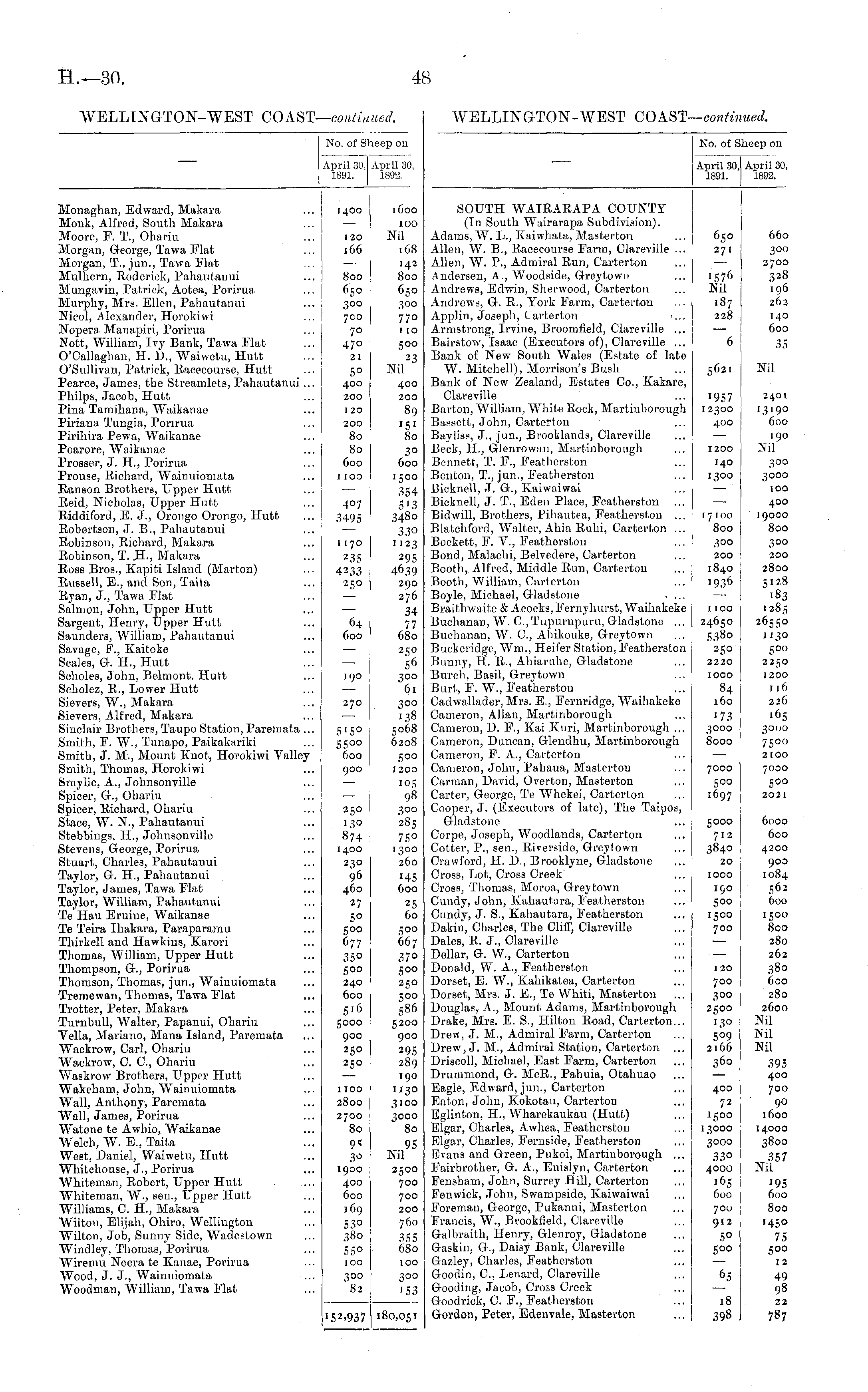 No. of Sheep on April SO, April 30, 1891. 1802. SOUTH WAIRARAPA COUNTY (In South Wairarapa Subdivision). Adams, W. L., Kaiwhata, Masterton Allen, W. B., Racecourse Farm, Clarerille ... Allen, W. P., Admiral Run, Carterton Andersen, A., Woodside, Greytown Andrews, Edwin, Sherwood, Carterfcon Andrews, G-. R., York Farm, Carterfcou Applin, Joseph, larterton Armstrong, Irvine, Broomlield, Clareville ... Bairstow, Isaac (Executors of), Clareville ... Bank of New South Wales (Estate of late W. Mitchell), Morrison's Bush Bank of New Zealand, Estates Co., Kakare, Clareville Barton, William, White Rook, Martinborough Bassett, John, Carterton Baylies, J., jun., Brooklands, Clareville Beck, H., Glenrowan, Martinborough Bennett, T. F., Featherston Benton, T., jun., Featherston Bicknell, J. G-., Kaiwaiwai Bicknell, J. T., Eden Place, Featherston Bidwill, Brothers, Pihautca, Featherston ... Blatchford, Walter, Ahia Ruhi, Carterton ... Bockett, F. V., Featherston Bond, Malachi, Belvedere, Carterton Booth, Alfred, Middle Run, Carterton Booth, William, Carterton Boyle, Michael, Gladstone Braithwaite & Acoeks,Fernyhurst, Waihakeke Buchanan, W. C.,Tupurupuru, Gladstone ... Buchanan, W. 0., Ahiiouke, Greytown Buckeridge, Worn., Heifer Station, Featherslon Bunny, H. R., Ahiaruhe, Gladstone Burch, Basil, Greytown Burt, F. W., Featherston Cadwallader, Mrs. E., Fernridge, Waihakeke Cameron, Allan, Martinborough Cameron, D. F., Kai Kuri, Martinborough ... Cameron, Duncan, Glendhu, Martinborough Cameron, F. A., Carterton Cameron, John, Pahaua, Masterton Carman, David, Overton, Masterton Carter, George, Te Whekei, Carterton Cooper, J. (Executors of late), The Taipos, Gladstone Corpe, Joseph, Woodlands, Cartertou Cotter, P., sen., Riverside, Greytown Crawford, H. D., Brooklyne, Gladstone Cross, Lot, Cross Creek Cross, Thomas, Moroa, Greytown Cundy, John, Kahautara, Featherston Cundy, J. S., Kahautara, Featherston Dakin, Charles, The Cliff, Clareville Dales, R. J., Clareville Dellar, G. W., Carterton Donald, W. A., Featherston Dorset, E. W., Kahikatea, Carterton Dorset, Mrs. J. E., Te Whiti, Masterton ... Douglas, A., Mount Adams, Martinborough Drake, Mrs. E. S., Hilton Road, Carterton... Drew, J. M., Admiral Farm, Carterton Drew, J. M., Admiral Station, Carterton Driscoll, Michael, East Farm, Carterton Drummond, G. McR., Pahuia, Otahuao Eagle, Edward, jun., Carterton Eaton, John, Kokotau, Carterton Eglinton, H., Wharekaukau (Hutt) Elgar, Charles, Awhea, Featherston Elgar, Charles, Fernside, Featherston Evans and Green, Piikoi, Martinborough ... Fairbrother, G. A., Enislyn, Carterton Fensham, John, Surrey Hill, Carterton Fenwick, John, Swampside, Kaiwaiwai Foreman, George, Pukanui, Masterton Francis, W., Brookfield, Clareville Galbraith, Henry, Glenroy, Gladstone Gaskin, G., Daisy Bank, Clareville Gazley, Charles, Featherston Goodin, O.| Lenard, Clareville Gooding, Jacob, Cross Creek Goodrick, C. F., Featherston Gordon, Peter, Edenvale, Masterton 6 S° 271 1576 Nil 187 228 6 5621 1957 12300 400 1200 140 1300 r 7 100 800 300 200 1840 1936 1100 24650 538o 250 2220 1000 84 160 '73 3000 8000 7000 660 300 2700 328 196 262 140 600 35 Nil 2401 13190 600 190 Nil 300 3000 IOO 400 19000 800 300 200 2800 5128 ■83 1285 26550 1130 500 2250 I2OO Il6 226 ■65 30U0 75OO 2 100 7O0O 500 1697 500 2021 5000 712 3840 20 6()00 6oO 42OO 903 IO84 5 6Z 60O 1000 k;o 500 1500 700 120 700 300 2500 130 5°9 2166 360 1500 8OO 28O 262 380 600 280 26OO Nil Nil Nil 400 7 2 1500 13000 3000 33° 4000 600 395 400 700 90 1600 14000 3800 357 Nil •95 600 800 •45° 75 500 12 700 912 5° 500 65 49 98 22 787 18 398