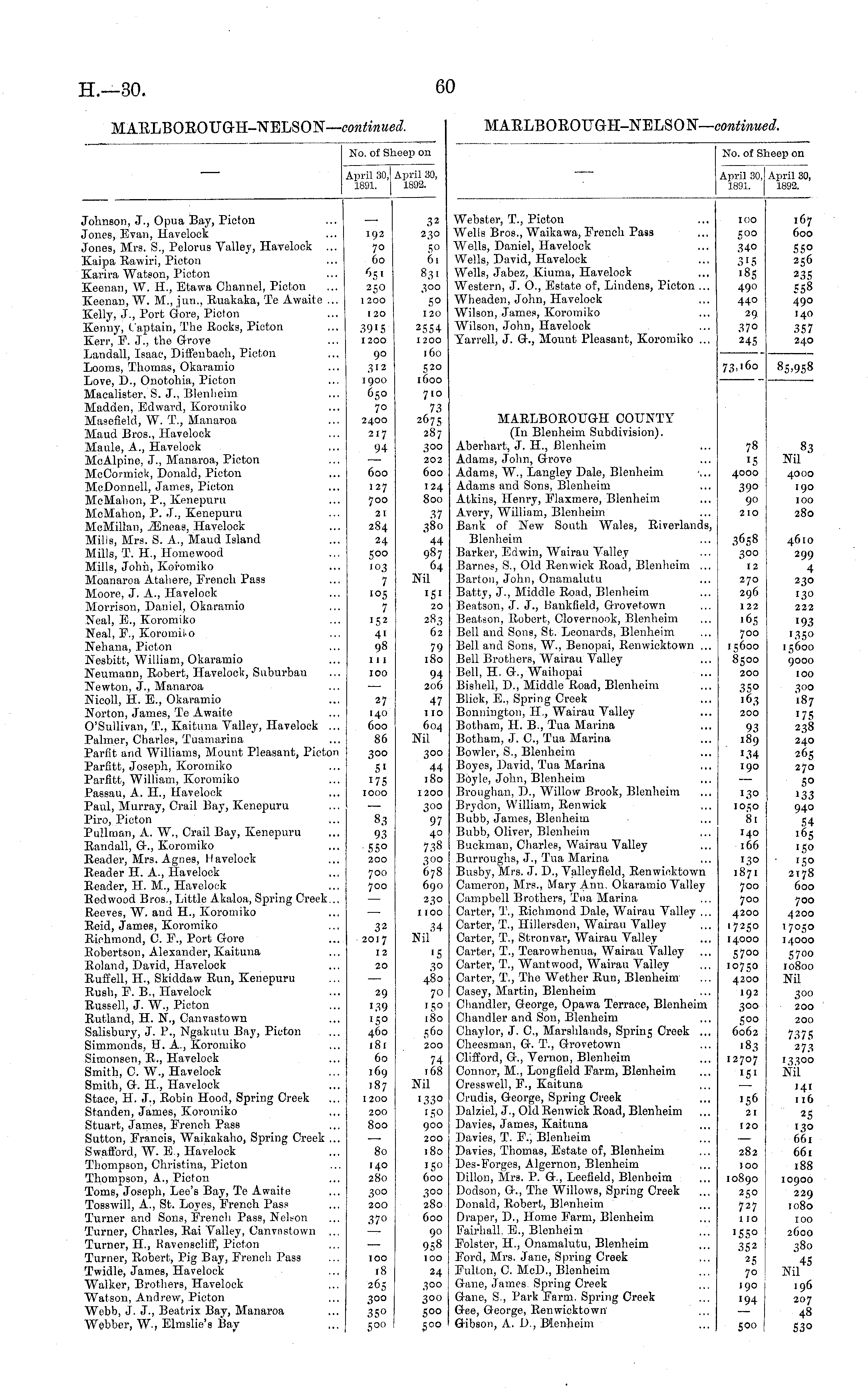 No. of Sheep on April 30, April 30, 1891. 1892. Johnson, J., Opua Bay, Picton Jones, Evan, Havelock Jones, Mrs. S., Pelorus Valley, Havelock ... Kaipa Rawiri, Picton Karira Watson, Piston Keenan, W. H., Etawa Channel, Pieton Kcenan, W. M., jun., Ruakaka, Te Awaite ... Kelly, J., Port Gore, Picton Kenny, Captain, The Rocks, Picton ICerr, F. J., the Grove Landall, Isaac, Diffenbach, Picton Looms, Thomas, Okaramio Love, D., Onotohia, Picton Macalister. S. J., Blenheim Madden, Edward, Koromiko Masefield, W. T., Manaroa Maud Bros., Havolock Maule, A., Havelock McAlpine, J., Manaroa, Picton McCormick, Donald, Picton McDonnell, James, Pieton McMahon, P., Kenepuru McMahon, P. J., Kenepuru McMillan, iEneas, Havelock Mills, Mrs. S. A., Maud Island Mills, T. H., Homewood Mills, John, Koromiko Moanarea Atahere, French Pass Moore, J. A., Havelock Morrison, Daniel, Okaramio Seal, E., Koromiko' Neal, P., Koromil-o Nehana, Picton Nesbitt, William, Okaramio Neumann, Robert, Havelock, Suburban Newton, J., Manaroa Nicoll, H. E., Okaramio Norton, James, Te Awaite O'Sullivan, T., Kaituna Yalley, Haveloek ... Palmer, Charles, Tuamarina Parfit and Williams, Mount Pleasant, Picton Parfitt, Joseph, Koromiko Pariltt, William, Koromiko Passau, A. H., Havelock Paul, Murray, Crail Bay, Kenepuru Piro, Picton Pullman, A. W., Crail Bay, Kenepuru Randall, G\, Koromiko Reader, Mrs. Agnes, Havelock Reader H. A., Havelock Reader, II. M., Havelock Redwood Bros., Little Akaloa, Spring Creek... Reeves, W. and H., Koromiko Reid, James, Koromiko Richmond, C. E., Port Gore Robertson, Alexander, Kaituna Roland, David, Haveloek Ruflell, H., Skiddaw Run, Kenepuru Rush, P. B., Haveloek Russell, J. W., Picton Rutland, H. N., Canvastown Salisbury, J. P., Ngakutu Bay, Pieton Simmonds, H. A., Koromiko Simonsen, R., Harelock Smith, C. W., Havelock Smith, G. H., Havelock Stace, H. J., Robin Hood, Spring Creek Standen, James, Koromiko Stuart, James, Erench Pass Sutton, Francis, Waikakaho, Spring Creek ... Swafford, W. E, Havelock Thompson, Christina, Picton Thompson, A., Picton Toms, Joseph, Lee's Bay, Te Awaite Tosswill, A., St. Loves, French Pass Turner and Sons, Erench Pass, Nelson Turner, Charles, Rai Valley, Oanvnstown ... Turner, H., Kavensclifr , , Picton Turner, Robert, Pig Bay, French Pass Twidle, James, Havelock Walker, Brothers, Havelock Watson, Andrew, Pieton Webb, J. J., Beatrix Bay, Manaroa Webber, W., Elmslie's Bay I 9 2 70 60 250 x 200 120 391S 1200 90 312 1900 650 70 2400 217 94 600 127 700 21 284 24 S°° 103 7 105 7 152 4 1 98 111 100 27 140 600 86 300 5i J 7S 1000 32 230 so 61 831 300 5° 120 2 5S4 1200 160 j 20 1600 710 73 2675 287 300 202 600 124 800 37 380 44 987 64 Nil 1S 1 20 283 62 79 180 94 206 47 110 604 Nil 300 44 180 1200 83 93 55° 200 300 97 40 738 300 678 690 230 1100 700 700 32 2017 12 34 Nil 20 29 139 '5° 460 l8l 60 169 IS? I2OO 200 80O '5 3° 480 70 ■5° 180 560 200 74 168 Nil 1 33° 150 900 200 180 15° 600 80 I40 28() 300 200 37° :jOO 280 600 90 958 100 100 18 265 300 35° 5 00 24 300 300 500 S°°