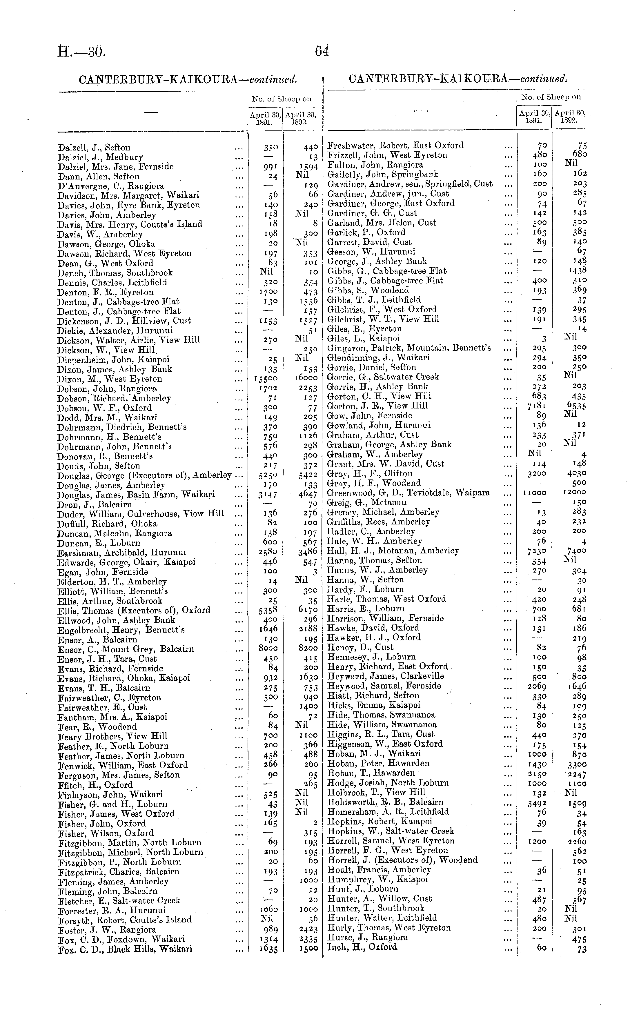 No. of Sheep on April 30, April 30, 1891. 1802. Freshwater, Robert, East Oxford Frizzcll, John, West Eyreton Fulton, John, Bangiora Galletly, John, Springbank Gardiner, Andrew, sen., Springfield, Cust Gardiner, Andrew, jun., Cust Gardiner, George, East Oxford Gardiner, G. &., Cust Garland, Mrs. Helen, Cust Garlick, P., Oxford Garrett, David, Cust Geeson, AV., Hurunui George, J., Ashley Bank Gibbs, G., Cabbage-tree Flat Gibbs, J., Cabbage-tree Flat Gibbs, S., Woodend Gibbs, T. J., Leithfield Gilchrist, F., West Oxford Gilchrist, AV. T., View Hill Giles, B., Eyreton Giles, L., Kaiapoi Gingavon, Patrick, Mountain, Bennett's Glendinning, J., Waikari Gorrie, Daniel, Sefton Gorrie, G., Saltwater Creek Gorrie, H, Ashley Bank Gorton, C. II., View Hill Gorton, J. R., View Hill Gow, John, Fernside Gowland, John, Hurunui Graham, Arthur, Cust Graham, George, Ashley Bank Graham, W., Amberley Grant, Mrs. AV. David, Cust Gray, II., F., Clifton Gray, H. F., Woodend Greenwood, G, D., Teviotdale, AVaipara Greig, G., Metanau Greney, Michael, Amberley Griffiths, Rees, Amberley Hadler, O, Amberley Hale, W. H, Amberley Hall, H. J., Motanau, Amberley Hanna, Thomas, Sefton Hanna, W. J., Amberley Hanna, W., Sefton Hardy, F., Loburn Harle, Thomas, West Oxford Harris, B., Loburn Harrison, William, Fernside Hawke, David, Oxford Hawker, H. J., Oxford Heney, D., Cust Hennesey, J., Loburn Henry, Richard, East Oxford Heyward, James, Clarkeville Heywood, Samuel, Fernside Hiatt, Richard, Sefton Hicks, Emma, Kaiapoi Hide, Thomas, Swannanoa Hide, William, Swannanoa Higgins, P.. L., Tara, Cust Higgenson, W., East Oxford Hoban, M. J., Waikari Hoban, Peter, Hawarden Hoban, T., Hawarden Hodge, Josiah, North Loburn Holbrook, T., View Hill Holdsworth, R. B., Baleairn Homersham, A. R., Leithfield Hopkins, Robert, Kaiapoi Hopkins, W., Salt-water Creek Horrell, Samuel, AA T est Eyreton Horrell, F. G., West Eyreton Horrell, J. (Executors of), Woodend Hoult, Francis, Amberley Humphrey, W., Kaiapoi Hunt, J., Loburn Hunter, A., Willow, Cust Hunter, T., Southbrook Hunter, Walter, Leithfield Hurly, Thomas, West Eyreton Hurse, J., Rangiora Inch, H., Oxford 70 480 IOO 160 200 9° 74 142 500 163 _! 9 120 400 193 139 191 3 295 294 200 35 272 683 7181 89 136 233 20 Nil "4 3200 11000 '3 40 200 76 7230 354 270 75 68o Nil 162 203 285 67 142 500 385 140 67 148 M38 3'o 369 37 295 345 '4 Nil 300 35° 250 Nil 203 435 6 53S Nil 12 37i Nil 4 148 4030 500 12000 'SO 283 232 200 4 7400 Nil 20 420 700 128 131 82 100 150 500 2069 330 84 130 80 440 175 1000 3°4 30 9' 248 681 80 186 219 76 98 33 8co 1646 289 109 250 '25 270 154 870 3300 2247 I IOO Nil >5°9 34 54 163 2260 562 100 1430 2150 1000 132 3492 76 39 1200 I 6 51 25 95 567 Nil Nil 21 487 20 480 200 60 3°i 475 73
