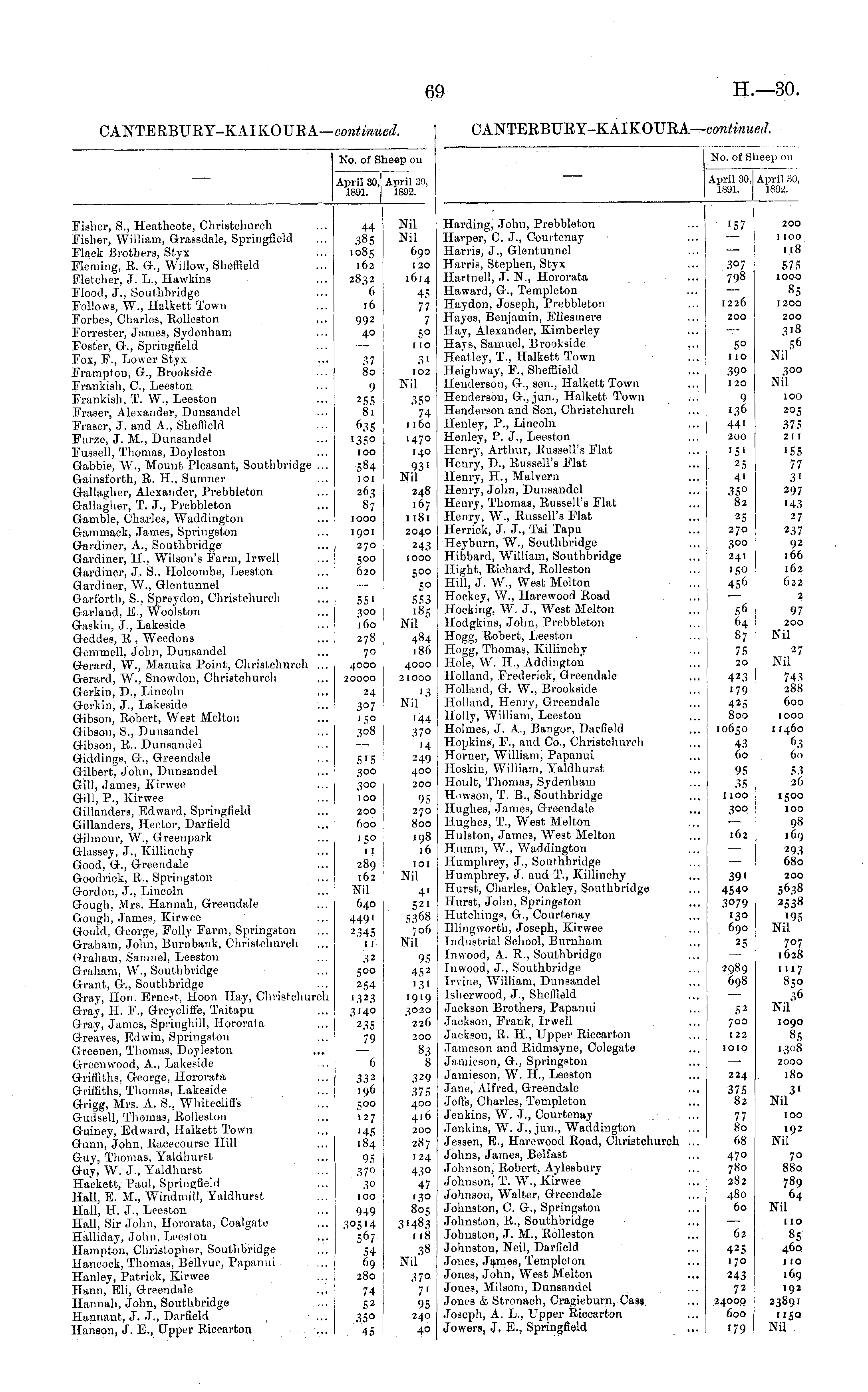 No. of Sheep on April 30, April 30, 1891. 1892. Fisher, S., Heathcote, Christchureh Fisher, William, Grassdale, Springfield Flack Brothers, Styx Fleming, R. Or., Willow, Sheffield Fletcher, J. L., Hawkins Flood, J., Soulhbridge Follows, W., Halkett Town Forbes, Charles, Rolleston Forrester, James, Sydenham Foster, G-., Springfield Fox, F., Lower Styx Frampton, G., Brookside Frankish, C, Leeston Frankish, T. W., Leeston Fraser, Alexander, Dunsandel Fraser, J. and A., Sheffield Furze, J. M., Dunsandel Fussell, Thomas, Doyleston Gabbie, W., Mount Pleasant, Southbridge ... Gainsforth, R. H., Sumner Gallagher, Alexander, Prebbleton Gallagher, T. J., Prebbleton Gamble, Charles, Waddington Gammaok, James, Springston Gardiner, A., Southbridge Gardiner, H., Wilson's Farm, Irwell Gardiner, J. S., Holcombe, Leeston Gardiner, W., Glentunnel Garforth, S., Spreydon, Christchurch Garland, E., Woolston Gaskin, J., Lakeside Geddes, R , Weedons Gemmell, John, Dunsandel Gerard, W., Manuka Point, Christchurch ... Gerard, W., Snovvdon, Chrietehurch Gerkin, P., Lincoln Gerkin, J., Lakeside Gibson, Robert, West Melton Gibson, S., Dunsandel Gibson, R.. Dunsandel Giddings, G., Greendale Gilbert, John, Dunsandel Gill, James, Kirwee Gill, P., Kirwee Gillanders, Edward, Springfield Gillanders, Hector, Darfield Gilmour, W., Greenpark Glassey, J., Killinchy Good, G., Greendale Goodrick, R., Springston Gordon, J., Lincoln Gough, Mrs. Hannah, Greendale Gough, James, Kirwee Gould, George, Folly Farm, Springston Graham, John, Burnbank, Christchurch Graham, Samuel, Leeston Graham, W., Southbridge Grant, &., Southbridge Gray, Hon. Ernest, Hoon Hay, Christchurch Gray, H. F., Greycliffe, Taitapu Gray, James, Springhill, Hororata Greaves, Edwin, Springston Greenen, Thomas, Doyleston Greenwood, A., Lakeside Griffiths, George, Hororata Griffiths, Thomas, Lakeside Grigg, Mrs. A. S., Whitecliffs Gudsell, Thomas, Rolleston Guiney, Edward, Halkett Town Gunn, John, Racecourse Hill Guy, Tbomas, Yaldhurst Guy, W. J., Yaldhurst Ha'ckett, Paul, Springfield Hall, E. jr., Windmill, Yaldhurst Hall, H. J., Leeston Hall, Sir John, Hororata, Coalgate Halliday, John, Leeston Hampton, Christopher, Southbridge Hancock, Thomas, Bellvue, Papanui Hanley, Patrick, Kirwee Hann, Eli, Greendale Hannah, John, Southbridge Hannant, J. J., Darfield Hanson, J. E., Upper Riccarton 44 385 108.5 I 62 2832 6 16 Nil Nil 690 120 1614 45 77 7 5° 110 992 40 37 80 31 102 Nil 9 255 81 f>35 1350 100 584 101 263 87 1000 1901 270 500 620 35° 74 1160 1470 140 93' Nil 248 ,67 1181 2040 243 1000 goo 55' 300 160 278 70 4000 20000 5° 553 '85 Nil 484 186 4000 21000 24 3°7 ■5° 308 '3 Nil 144 37° 14 249 400 200 95 270 800 198 16 5'5 300 300 100 200 600 ■5° 11 289 162 Nil 640 4491 2.345 11 32 500 254 1323 3'4° 235 79 6 101 Nil 4' 521 5368 706 Nil 95 452 '3' 1919 3020 '226 200 83 8 332 196 500 127 '45 184 95 37° 30 100 9+9 3°5'4 567 54 69 280 74 52 35° 45 329 375 400 416 200 287 124 43° 47 '3° 805 31483 118 38 Nil 37° 7' 95 240 40