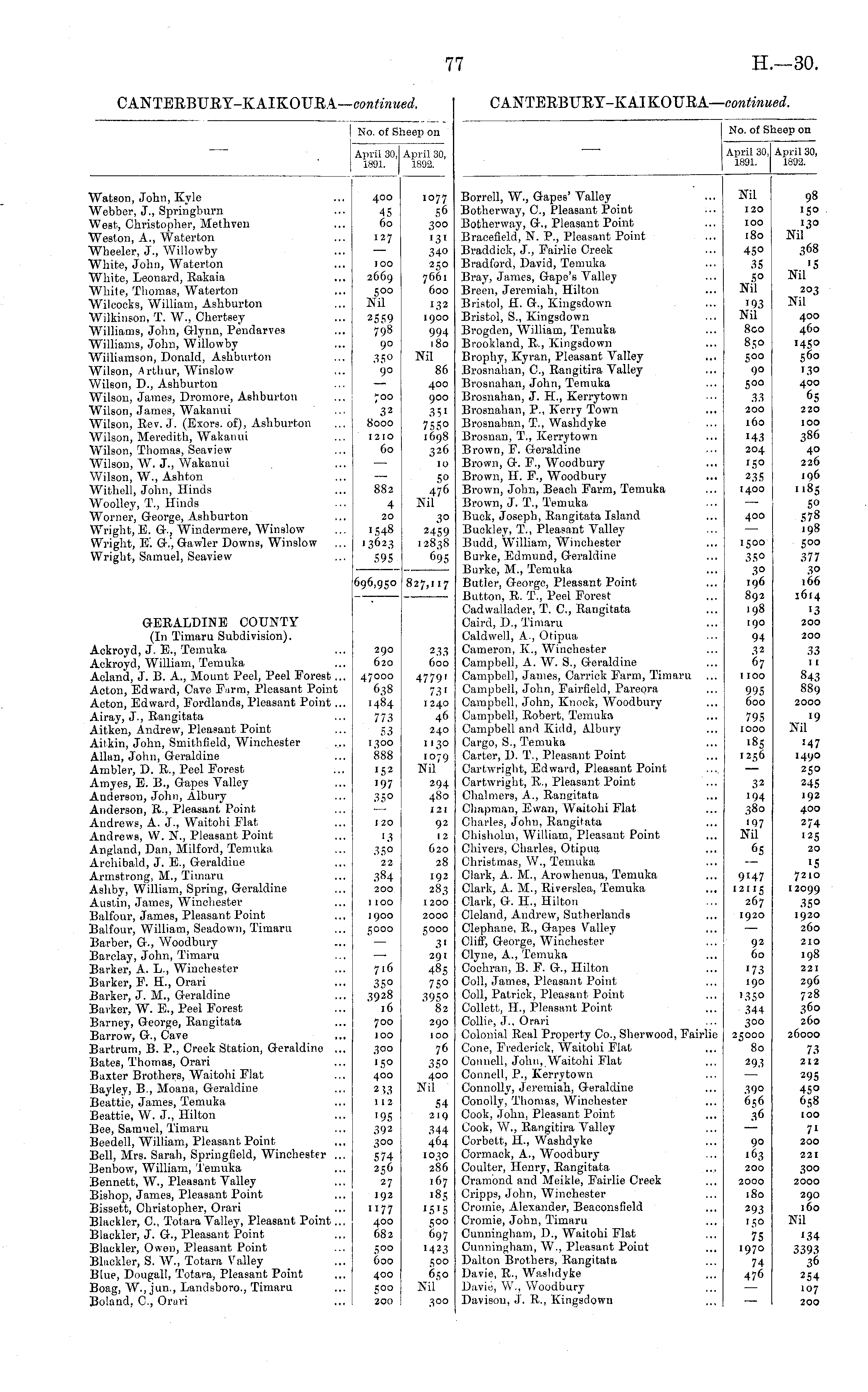 No. of Sheep on April 30, April 30, 1891. 1892. Borrell, W., Gapes' Valley Botherway, C, Pleasant Point Botherway, G., Pleasant Point Bracefield, N. P., Pleasant Point Braddiclc, J., Fairlie Creek Bradford, David, Temuka Bray, James, Gape's Valley Breen, Jeremiah, Hilton Bristol, £L G., Kingsdown Bristol, S., Kingsdown Brogden, William, Temnka Brookland, R., Kingsdown Bropliy, Kyran, Pleasant Valley Brosnahan, 0., Rangitira Valley Brosnahan, John, Temuka Brosnahan, J. H., Kerrytown Brosnahan, P., Kerry Town Brosnalian, T., Washdyke Broanan, T., Kerrytown Brown, F. Geraldine Brown, G. E\, Woodbury Brown, II. F., Woodbury Brown, John, Beach Farm, Temuka Brown, J. T., Temuka Buck, Joseph, Rangitata Island Buckley, T., Pleasant Valley Budd, William, Winchester Burke, Edmund, Geraldine Burke, M., Temuka Butler, George, Pleasant Point Button, R. T., Peel Forest Cadwallader, T. C, Rangitata Caird, D., Timaru Caldwell, A., Otipua Cameron, K., Winchester Campbell, A. W. S., Geraldine Campbell, James, Carrick Farm, Timaru Campbell, John, Fairfield, Pareora Campbell, John, Knock, Woodbury Campbell, Robert, Temuka Campbell and Kidd, Albury Cargo, S., Temuka Carter, D. T., Pleasant Point Cartwright, Edward, Pleasant Point Cartwright, R., Pleasant Point Chalmers, A., Rangitata Chapman, Ewan, Waitohi Flat Charles, John, Rangitata Chisholm, William, Pleasant Point Chivers, Charles, Otipua Christmas, W., Temuka Clark, A. M., Arowhenua, Temuka Clark, A. M., Riverslea, Temuka Clark, G. H., Hilton Cleland, Andrew, Sutheriands Clephane, R., Gapes Valley Cliff, George, Winchester ' Clyne, A., Temuka Cochran, B. F. G., Hilton Coll, James, Pleasant Point Coll, Patrick, Pleasant Point Collett, H., Pleasant Point Collie, J., Orari Colonial Real Property Co., Sherwood. Fairlie Cone, Frederick, Waitohi Flat Cormell, John, Waitohi Flat Cormell, P., Kerrytown Connolly, Jeremiah, Geraldiue Conolly, Thomas, Winchester Cook, John, Pleasant Point Cook, W., Rangitira Valley Corbett, H., Washdyke Cormack, A., Woodbury Coulter, Henry, Rangitata Cramond and Meikle, Fairlie Creek Oripps, John, Winchester Cromie, Alexander, Beaconsfleld Cromie, John, Timaru Cunningham, D., Waitohi Flat Cunningham, W., Pleasant Point Dalton Brothers, Rangitata Davie, R., Washdyke Davie, \V., Woodbury Davison, j, R., Kingsdowa Nil 120 100 180 45° 3S 5° Nil 98 150 130 Nil 368 Nil 203 Nil 193 Nil 8co 850 500 go S°° 33 200 160 400 460 145° 560 130 400 65 220 14.? 204 1400 400 100 386 40 226 196 1185 5° 578 198 500 377 3° 166 1614 13 200 1500 35° 3° 196 892 198 190 94 3 2 67 1100 99S 600 200 33 1 [ 843 889 2000 795 1000 185 1256 19 Nil •47 1490 250 245 192 400 274 I2 S 20 15 7210 12099 35° 1920 260 210 198 221 296 728 360 260 26000 32 194 380 197 Nil 65 9'47 12115 267 1920 92 60 173 190 '35° 344 300 25000 80 293 73 212 39° 656 i 6 295 45° 658 100 90 163 200 7i 200 221 300 2000 2000 180 293 ■ 50 75 1970 74 476 290 160 Nil '34 3393 36 254 107 200