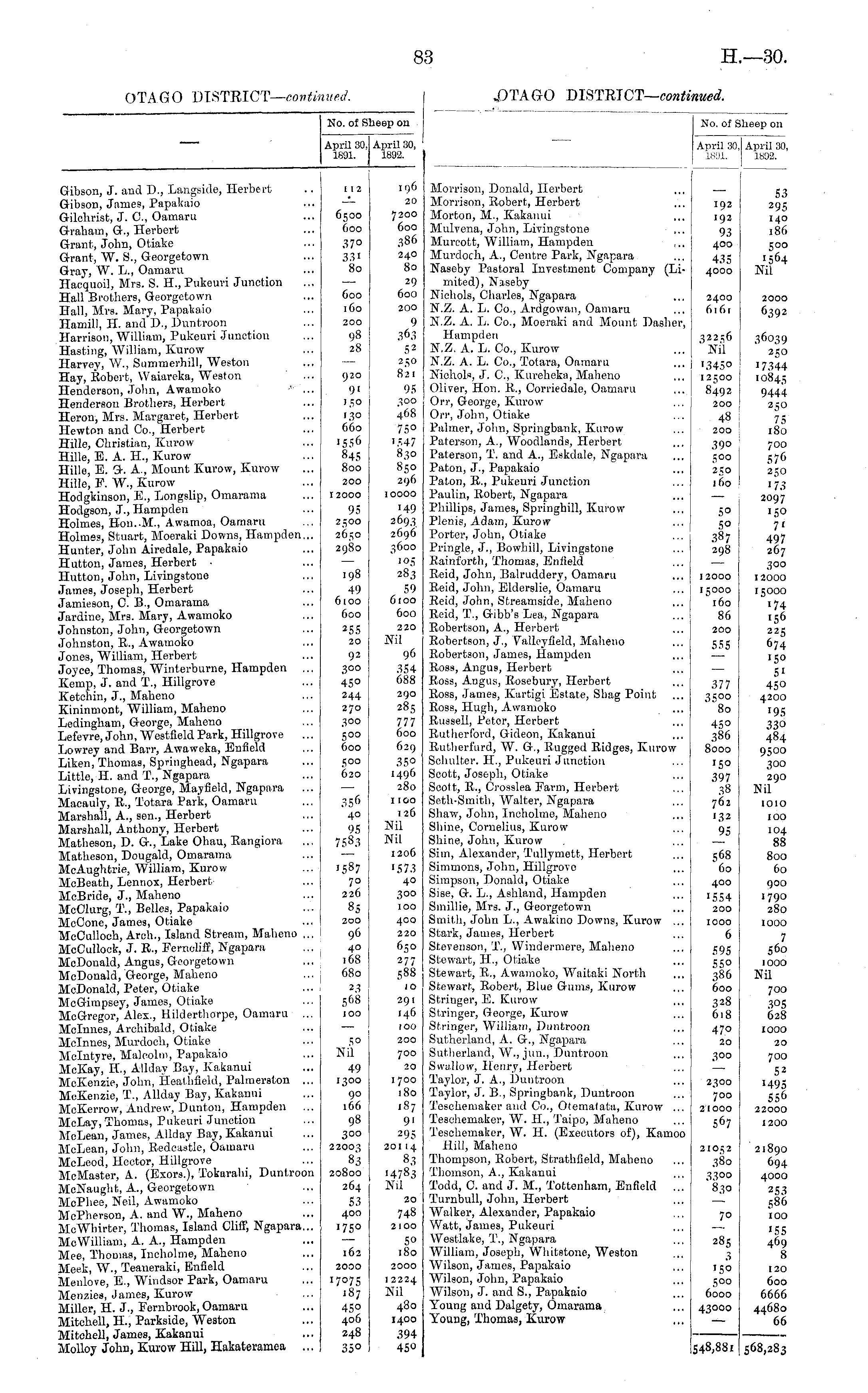 No. of Sheep on April 30, April 30, 1891. 1892. Gibson, ,T. and D., Laugside, Herbert G-ibson, James, Papakaio Gilchrist, J. C, Oamaru Q-raham, G., Herbert Grant, John, Otiake Grant, W. S., Georgetown Gray, W. L., Oamaru Hacquoil, Mrs. S. H., Pukeuri Junction Hall Brothers, Georgetown Hall, Mrs. Mary, Papakaio Hamill, H. and D., Dnntroon Harrison, William, Pukeuri Junction Hasting, William, Kurow Harvey, W., Siimmerhill, Weston Hay, Eobert, Waiareka, West on Henderson, John, Awamoko •" ... Henderson Brothers, Herbert Heron, Mrs. Margaret, Herbert Hewton and Co., Herbert Hille, Christian, Kurow Hille, E. A. H., Kurow Hille, E. 9-. A., Mount Kurow, Kurow Hille, F. W., Kurow Hodgkinson, E., Longslip, Omarama Hodgson, J., Hampden Holmes, H011..M., Awamoa, Oamaru Holmes, Stuart, Moeraki Downs, Hampden... Hunter, John Airedale, Papakaio Hutton, James, Herbert ■ Hutton, John, Livingstone •Tamea, Joseph, Herbert Jamieson, C. B., Omarama Jiirdine, Mrs. Mary, Awamoko Johnston, John, Georgetown Johnston, B., Awamoko Jones, William, Herbert Joyce, Thomas, Winterburne, Hampden ... Kemp, J. and T., Hillgrove Ketehin, J., Maheno Kininmont, William, Maheno Ledingham, George, Maheno Lefevre, John, Westfleld Park, Hillgrove Lowrey and Barr, Awaweka, Enfield Liken, Thomas, Springhead, Ngapara Little, H. and T., Ngapara Livingstone, George, Mayfield, Ngapara Maeauly, R., Totara Park, Oamaru Marshall, A., Ben., Herbert Marshall, Anthony, Herbert Matheson, D. G., Lake Ohau, Rangiora Matheson, Dougald, Omarama McAuglitrie, William, Kurow McBeath, Lennox, Herbert McBride, J., Maheno McClurg, T., Belles, Papakaio McCone, James, Otiake McCulloch, Arch., Island Stream, Maheno ... McCullock, J. E.., Ferneliff, Ngapara McDonald, Angus, Georgetown McDonald, George, Maheno McDonald, Peter, Otiake McGimpsey, James, Otiake McGregor, Alex., Hilderthorpe, Oamaru ... Mclnnes, Archibald, Otiake Mclnnes, Murdoch, Otiake Mclntyre, Malcolm, Papakaio McKay, H., Allday Bay, Kakanui McKenzie, John, Heathfield, Palmerston ... McKenzie, T., Allday Bay, Kakanui McKerrow, Andrew, Dunton, Hampden McLay, Thomas, Pukeuri Junction McLean, James, Allday Bay, Kakanui McLean, John, Bedeaatle, Oamaru McLeod, Hector, Hillgrove McMaster, A. (Exors.), Xokarahi, Duntroon McNaught, A., Georgetown McPhee, Neil, Awamoko McPherson, A. and W., Maheno McWhirter, Thomas, Island Cliff, Ngapara... McWilliam, A. A., Hampden Mee, Thomas, Incholme, Maheno Meek, W., Teaneraki, Enfleld Menlove, E., Windsor Park, Oamaru Menziee, James, Kurow Miller, II. J., Fernbrook, Oamaru Mitchell, H., Parkside, Weston Mitchell, James, Kakanui Molloy John, Kurow Hill, Hakateramea ... I I 2 65OO fjOO 331 80 196 20 7200 600 386 240 80 Coo 160 200 98 28 ()2O 9' '5° '3° 660 ■556 845 800 200 12000 29 600 200 9 5 3 250 821 95 300 468 75° 1547 830 850 296 10000 H9 2693 2696 3600 ' 05 283 59 6100 600 95 2500 2650 2980 198 49 6 loo 600 255 20 92 300 45° 244 270 300 500 600 220 Nil 96 354 688 290 285 777 600 629 35° 1496 280 1100 126 Nil Nil 500 620 356 40 95 7583 1206 '5«7 7° 226 85 200 96 40 168 680 23 568 100 '573 40 300 100 400 220 650 277 588 10 5° Nil 49 1300 90 166 98 300 22003 83 20800 264 53 400 "75° 291 ,46 100 200 700 20 1700 180 187 9' 295 20114 83 '4783 Nil 20 748 2100 162 50 180 2000 17075 187 45° 406 248 35° 2000 12224 Nil 480 1400 394 45°