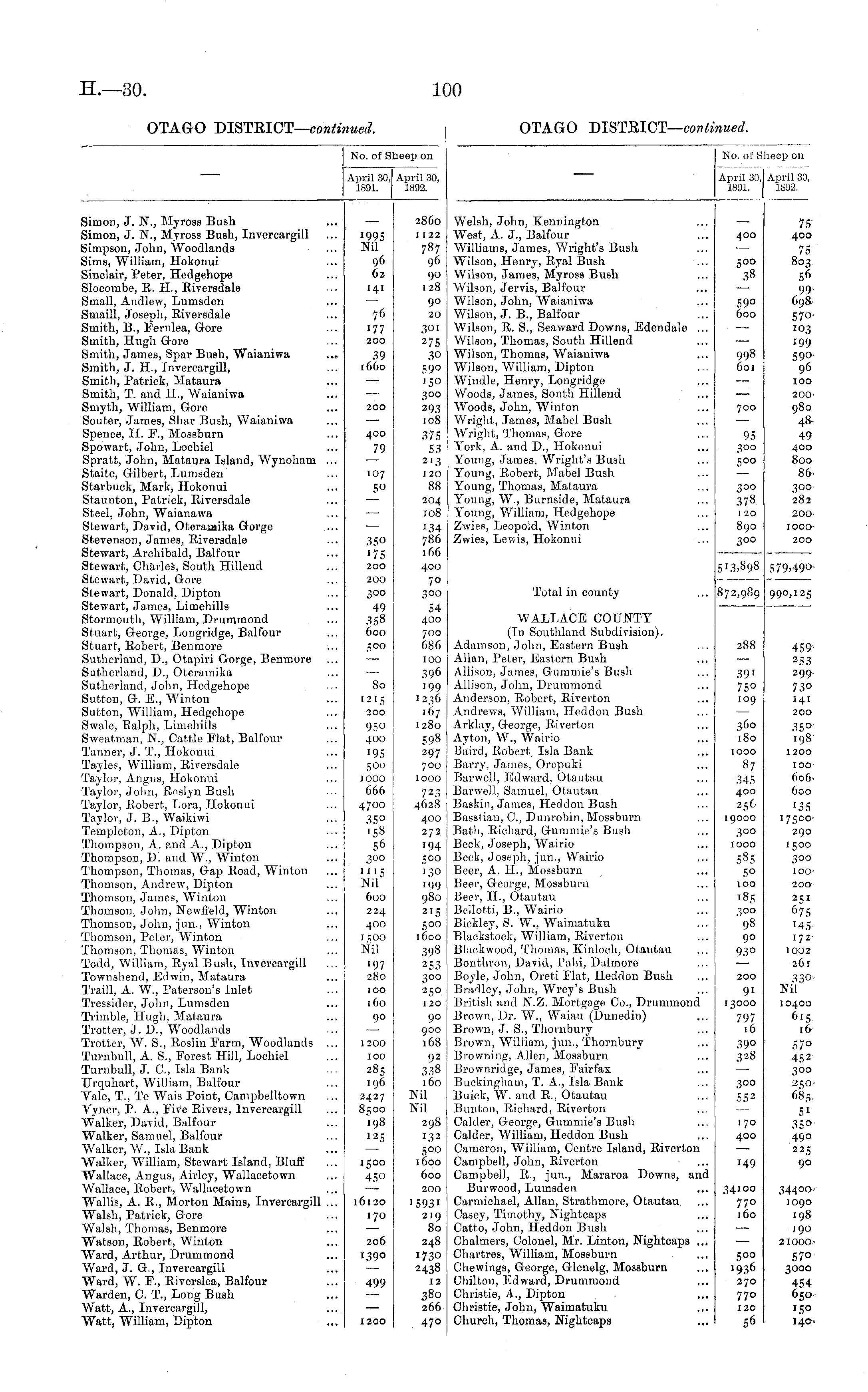 No. of Sheep on April 30, 1891. April 30, 1892. Simon, J. N., Myross Bush Simon, J. N., Myross Bush, Invercargill Simpson, John, Woodlands Sirns, William, Hokomii Sinclair, Peter, Hedgehope Slocombe, R. II., Riversdale Small, Andlew, Lumsden Smaill, Joseph, Riversdale Smith, B., Fernlea, Gore Smith, Hugh G-ore Smith, James, Spar Bush, Waianiwa ... Smith, J. H., Invercargill, Smith, Patrick, Mataura Smith, T. and II., Waianiwa Smyth, William, Gore Souter, James, Shar Bush, Waianiwa Spence, H. F., Mossburn Spowart, John, Lochiel Spratt, John, Mataura Island, Wynoliam ... Staite, Gilbert, Lumsden Starbuck, Mark, Hokonui Slaunton, Patrick, Riversdale Steel, John, Waianawa Stewart, David, Oteraraika Gorge Stevenson, James, Riversdale Stewart, Archibald, Balf'our Stewart, Chailes, South Ilillend Stewart, David, Gore Stewart, Donald, Dipton Stewart, James, Limehills Stormoutli, William, Drummond Stuart, George, Longridge, Balfour Stuart, Robert, Benmore Sutherland, D., Otapiri Gorge, Benmore Sutherland, ])., Oteramika Sutherland, John, Hedgehope Sutton, G. B., Winton Sutton, William, Hedgehope Swale, Ralph, Limehills Sweatman, N., Cattle Flat, Balfour Tanner, J. T., Hokonui Tayle?, William, Riversdale Taylor, Angus, Hokonui Taylor, John, Roslyn Bush Taylor, Robert, Lora, Hokonui Taylor, J. B., Waikiwi Templeton, A., Dipton Thompson, A. and A., Dipton Thompson, D. and W., Winton Thompson, Thomas, Gap Road, Winton Thomson, Andrew, Dipton Thomson, James, Winton Thomson John, Newfield, Winton Thomson, John, jun., Winton Thomson, Peter, Winton Thomson, Thomas, Winton Todd, William, Ryal Bush, Invercargill Townshend, Edwin, Mataura Traill, A. W., Paterson's Inlet Tressider, John, Lumsden Trimble, Hugh, Mataura Trotter, J. D., Woodlands Trotter, W. S., Roslin Farm, Woodlands ... Turnbull, A. S., Forest Hill, Lochiel Turnbull, J. C, Isla Bank Urquhart, William, Balfour Vale, T., Te Wais Point, Campbelltown Vyner, P. A., Five Rivers, Invereargill Walker, David, Balfour Walker, Samuel, Balfour Walker, W., Isla Bank Walker, William, Stewart Island, Bluff Wallace, Angus, Airley, Wallacetown Wallace, Robert, Wallacetown Wallis, A. R., Morton Mains, Invercargill ... Walsh, Patrick, Gore Walsh, Thomas, Benmore Watson, Robert, Winton Ward, Arthur, Drummond Ward, J. G., Invercargill Ward, W. F., Riverslea, Balfour Warden, C. T., Long Bush Watt, A., Invercargill, Watt, William, Dipton 2860 '995 Nil 96 62 1122 787 96 90 128 9° 20 141 76 '77 200 39 1660 301 2 75 30 59° 150 300 293 108 375 S3 213 120 88 200 400 79 107 5° 35" ■75 200 200 300 49 358 600 500 204 108 134 786 166 400 7° 300 54 400 700 686 100 396 199 167 1280 598 297 700 lOOO 723 4628 80 1215 200 95O 400 '95 500 1000 666 4700 35° ,58 56 300 1115 Nil 600 224 400 1500 Nil 400 272 '94 500 130 199 980 3'5 500 i6co 398 253 300 250 1 20 197 280 100 160 90 90 900 168 ] 200 100 285 196 2427 8500 198 > 2 5 92 338 160 Nil Nil 298 132 500 1600 600 1500 45° 200 16120 170 '593' 219 80 248 '73° 2438 12 380 266 470 206 1390 499 1200