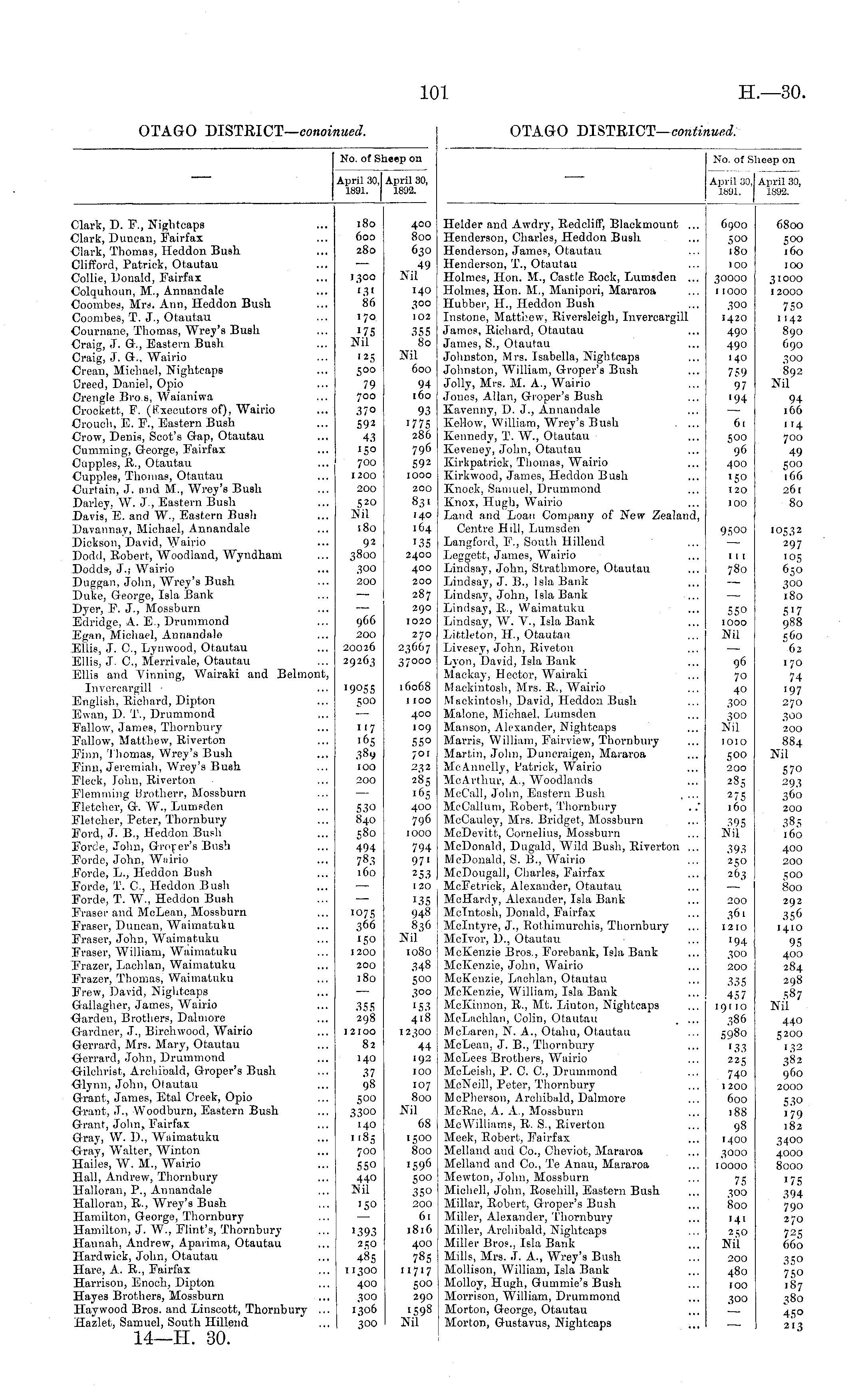No. of Sheep on April 30, April 30, 1801. 1892. Helder and Awdry, Redcliff, Blackmount ... Henderson, Charles, Heddon Bush Henderson, James, Otautau Henderson, T., Otautau Holmes, Hon. M., Castle Rock, Lumsden ... Holmes, Hon. M., Manipori, Mararoa Hubber, H., Heddon Bush Instonc, Matthew, Riversleigh, Invercargill James, Richard, Otautau James, S., Otautau Johnston, Mrs. Isabella, Nightcaps Johnston, William, G-roper's Bush Jolly, Mrs. M. A., Wairio Jones, Allan, Q-roper's Bush Kavenny, D. J., Annandale Kellow, William, Wrey's Bush . ... Kennedy, T. W., Otautau Keveney, John, Otautau Kirkpatrick, Thomas, Wairio Kirkwood, James, Heddou Bush Knock, Samuel, Drumrnond Knox, Hugh, Wairio Land and Loan Company of New Zealand, Centre Hill, Lumsden Langford, F., South Hillend Leggett, James, Wairio Lindsay, John, Strathmore, Otautau Lindsay, J. B., lsla Bank Lindsay, John, IslaBank Lindsay, R., Waimatuku Lindsay, W. V., lsla Bank Littleton, II., Otautau Livesey, Jolin, Riveton Lyon, David, lsla Bank Meokay, Hector, Wairaki Mackintosh, Mrs. R., Wairio Mackintosh, David, Heddon Bush Malonc, Michael. Lumsden Manson, Alexander, Nightcaps Harris, William, Fairview, Thornbury Martin, John, Duncraigen, Mararoa McAnnelly, Patrick, Wairio McArthur, A., Woodlands McCall, John, Eastern Busli .... McOallum, Robert, Thornbury McCauley, Mrs. Bridget, Mossburn McDeyitt, Cornelius, Mossburn McDonald, Dugald, Wild Bush, Riverton ... McDonald, S. B., Wairio McDougall, Charles, Fairfax McFetrick, Alexander, Otautau McHardy, Alexander, lsla Bank McTntosh, Donald, Fairfax Melntyre, J., Rothimurehis, Thornbury Mclvor, p., Otautau McKenzie Bros., Forebank, Tsla Bank McKenzie, John, Wairio McKenzie, Lachlan, Otautau MeKenzie, William, lsla Bank McKinnon, R., Mt. Linton, Nightcaps McLfichlan, Colin, Otautau , ... McLaren, N. A., Otahu, Otautau McLean, J. B., Thornbury MoLees Brothers, Wairio McLeish, P. C. C,| Drummond McNcill, Peter, Thornbury McPherson, Archibald, Dalmore McRae, A. A., Mossburn Mo Williams, R. S., Riverton Meek, Robert, Fairfax Melland and Co., Cheviot, Mararoa Melland and Co., Te Anau, Mararoa Mcwton, John, Mossburn Michell, John, Rosehill, Eastern Bush Millar, Robert, Groper's Bush Miller, Alexander, Thornbury Miller, Archibald, Nightcaps Miller Bros., lsla Bank Mills, Mrs. J. A., Wrey's Bush Mollison, William, lsla Bank Molloy, Hugh, Qummie's Bush Morrison, William, Drummond Morton, George, Otautau Morton, Gustavus, Nightcaps 6900 500 180 100 6800 500 160 30000 11000 3°o 1420 490 490 140 759 97 '94 61 500 96 400 150 120 100 31000 12000 750 1142 890 690 300 892 Nil 9+ 166 "4 700 49 500 166 261 80 100 9500 10532 297 'OS 650 300 180 5'7 988 560 62 170 74 197 270 300 200 884 Nil 1 [ 1 780 55° 1000 Nil 96 70 40 300 Nil 1010 500 200 285 275 160 570 293 360 200 385 160 400 200 395 Nil 393 250 263 SOO 800 200 36, 1210 194 300 200 335 457 191 10 386 5980 '33 225 740 1200 600 188 98 1400 3000 10000 75 300 800 141 250 Nil 200 480 100 300 292 356 1410 95 400 284 298 587 Nil 440 5200 132 382 960 2000 530 179 182 3400 4000 8000 175 394 790 270 725 660 35° 75O 187 380 45° 213