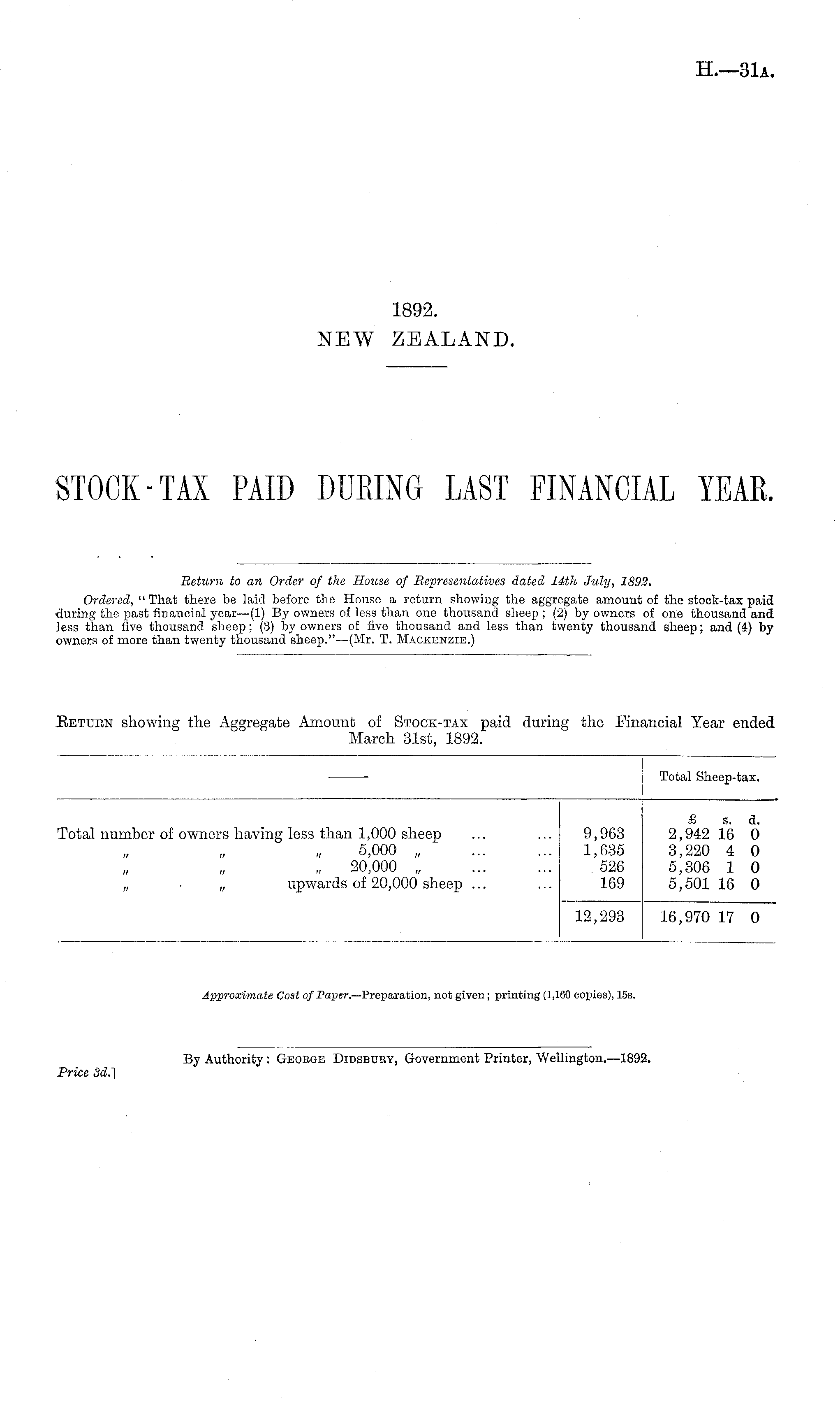 Return to an Order of the House of Representatives dated 14th July, 1892, Ordered, " That there be laid before the House a return showing the aggregate amount of the stock-tax paid during the past financial year—(l) By owners of less than one thousand sheep ; (2) by owners of one thousand and less than five thousand sheep; (3) by owners of five thousand and less than twenty thousand sheep; and (4) by owners of more than twenty thousand sheep."—(Mr. T. Mackenzie.)