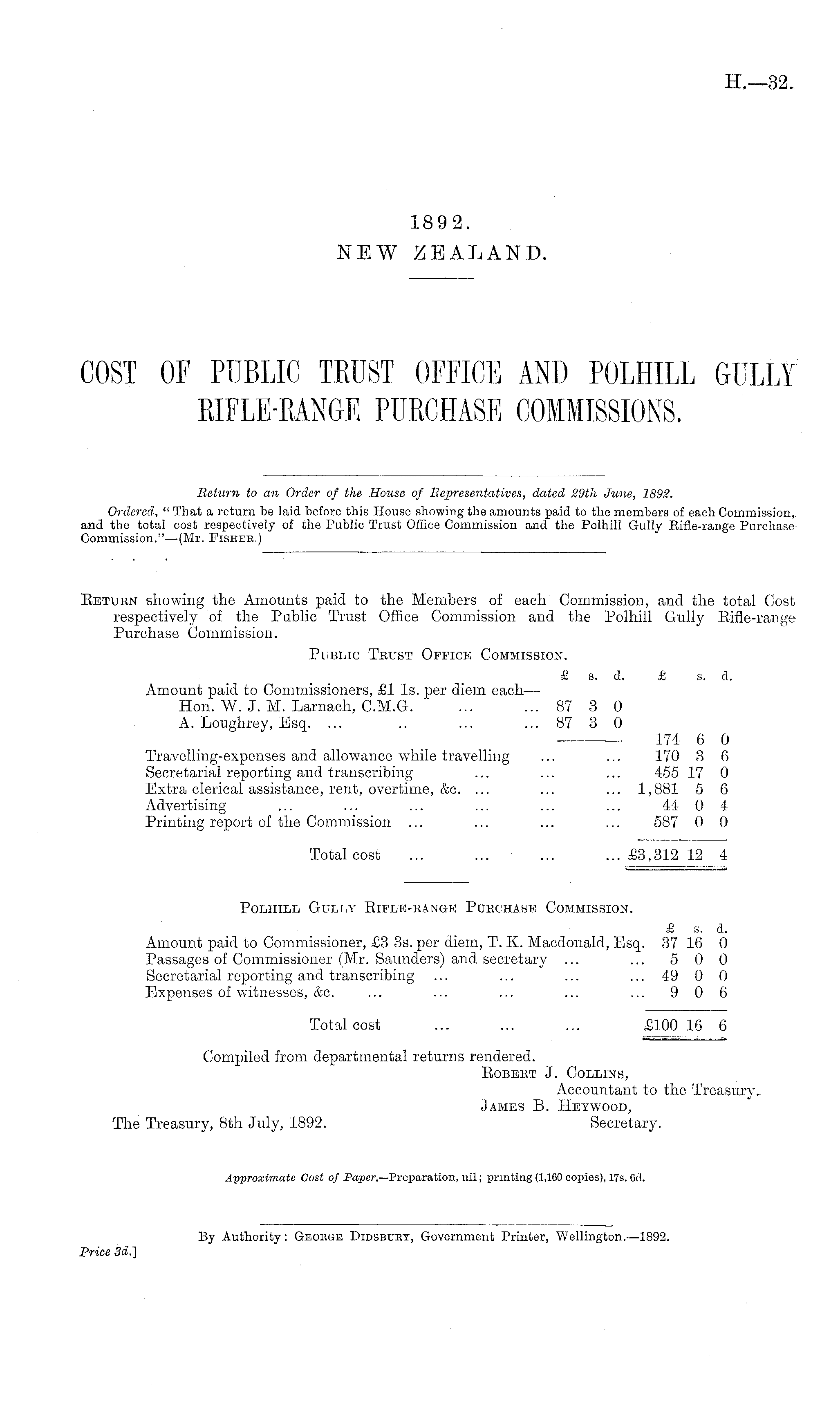 Return to an Order of the House of Representatives, dated 29th June, 1892. Ordered, " That a return be laid before this House showing the amounts paid to the members of each Commission, and the total cost respectively of the Public Trust Office Commission and the Polhill Gully Rifle-range Purchase Commission." —(Mr. Fishee.)