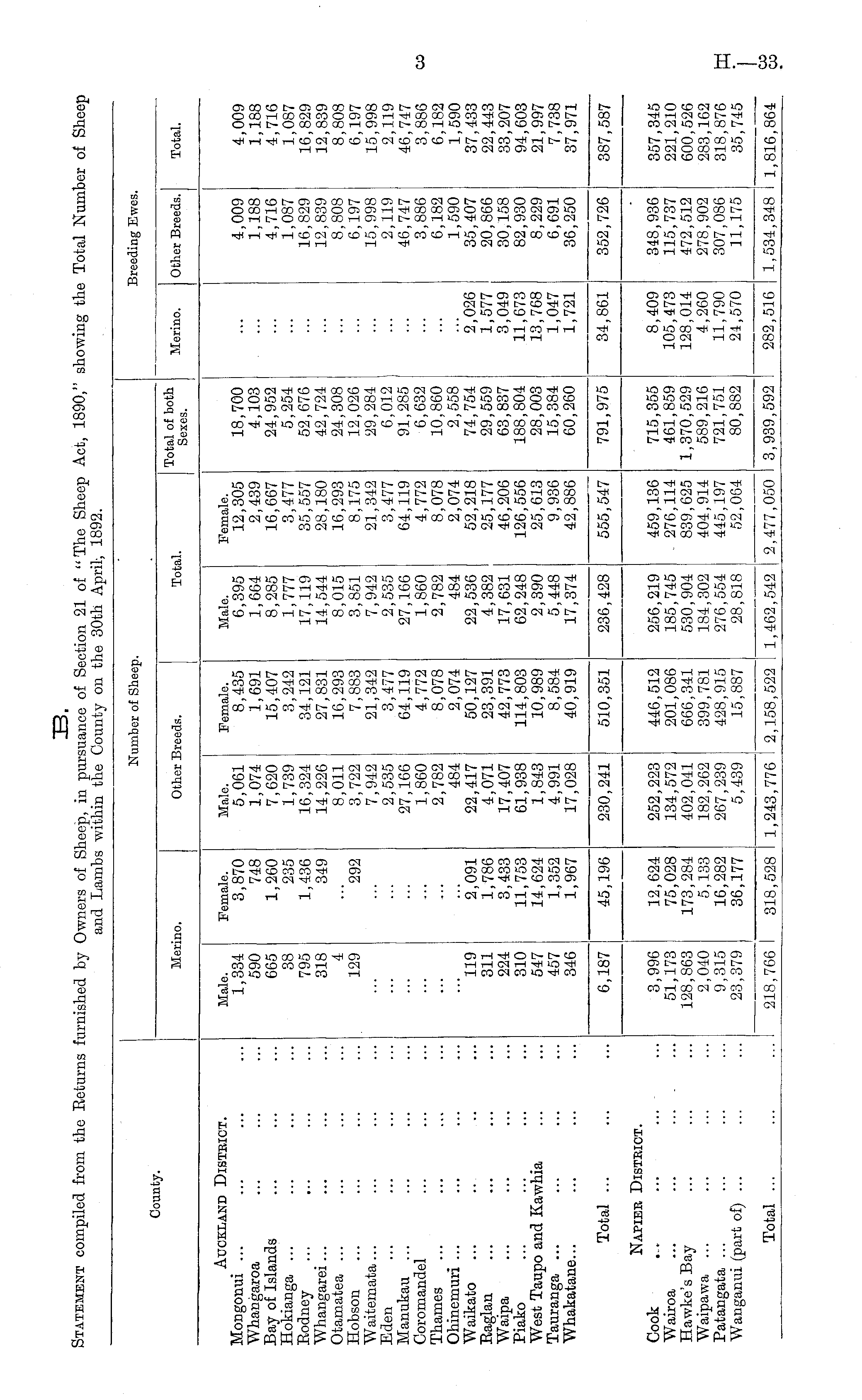 B. Statement compiled from the Returns furnished by Owners of Sheep, in pursuance of Section 21 of "The Sheep Act, 1890," showing the Total Number of Sheep and Lambs within the County on the 30th April, 1892.