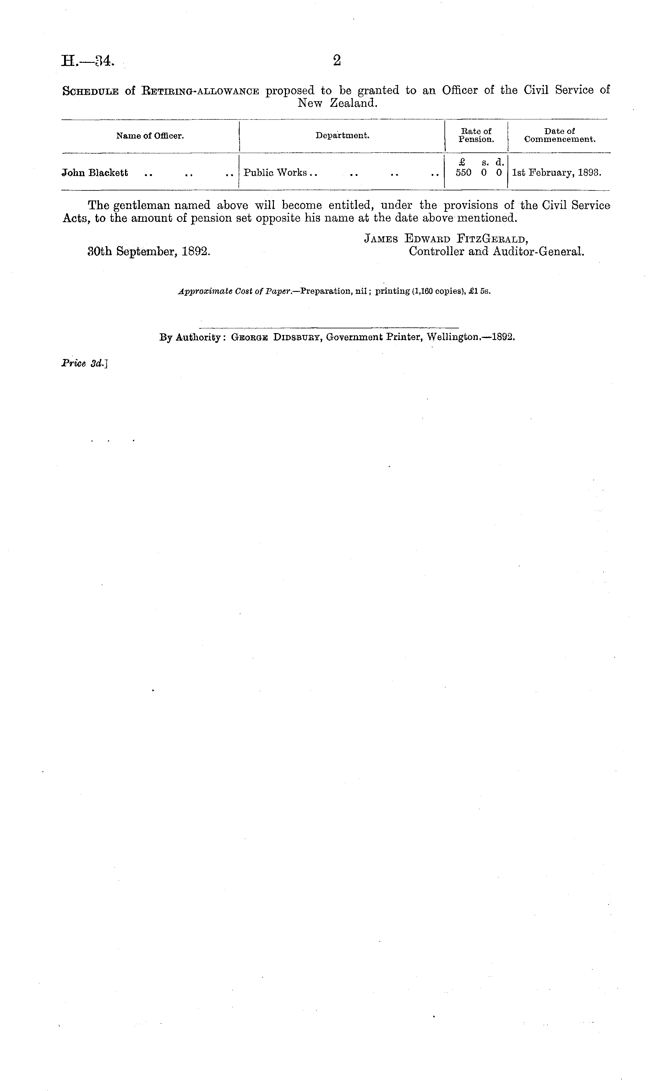 The gentleman named above will become entitled, under the provisions of the Civil Service Acts, to the amount of pension set opposite his name at the date above mentioned. James Edwabd FitzGebald, 30th September, 1892. Controller and Auditor-General. Approximate Cost of Paper.— Preparation, nil; printing (1,160 copies), £1 ss.