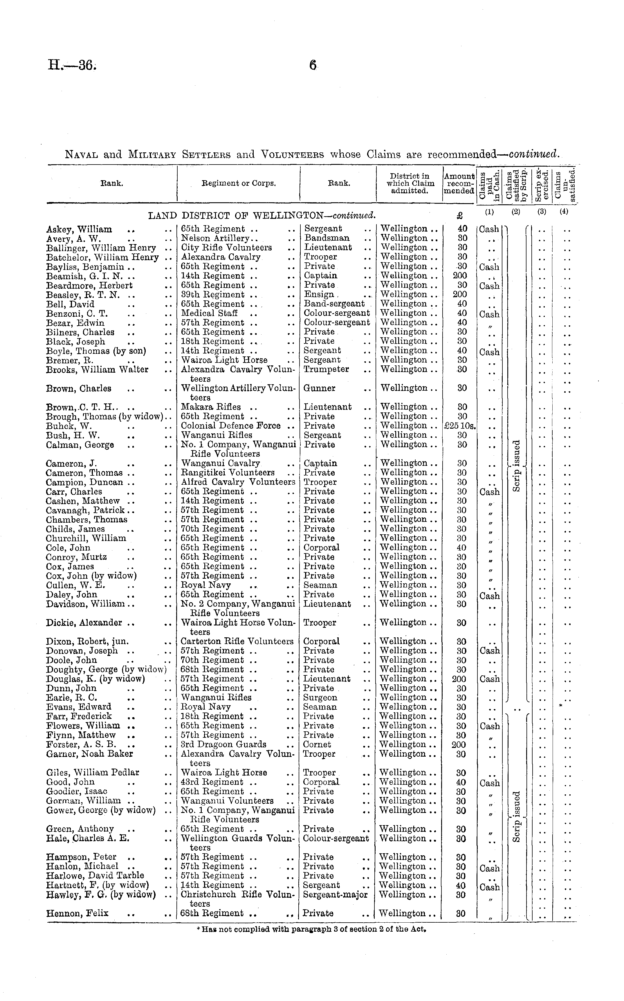 Kank. Regiment or Corps. Kank. District in which Claim admitted. Amount! α-j^ recom- .9•a* rnendea a° ° S m"3 ft 111 H 'S'g a in 3 g DISTRICT OF WELLINi rTON— continued. (l) (2) (3) (i) LANI & Askey, William A very, A. W. Ballinger, William Henry .. Batclielor, William Henry .. Bayliss, Benjamin Beamish, Q.I.N. .. Beardmore, Herbert Beasley, R. T. N. .. Bell, David Benzoni, 0. T. Bezar, Edwin Bilners, Charles Black, Joseph Boyle, Thomas (by son) Bremer, E. Brooks, William Walter 65th Regiment Nelson Artillery.. City Rifle Volunteers Alexandra Cavalry 65th Regiment 14th Regiment 65th Regiment 39 th Regiment 65th Regiment Medical Staff 57th Regiment 65th Regiment .. .. 18th Regiment 14th Regiment Wairoa Light Horse Alexandra Cavalry Volunteers Wellington Artillery Volunteers Makara Rifles 65th Regiment Colonial Defence Force .. Wanganui Rifles No. 1 Company, Wanganui Rifle Volunteers Wanganui Cavalry Rangitikei Volunteers Alfred Cavalry Volunteers 65th Regiment 14th Regiment 57th Regiment 57th Regiment 70th Regiment 65th Regiment 65th Regiment 65th Regiment 65th Regiment 57th Regiment Royal .Navy .. 65th Regiment No. 2 Company, Wanganui Rifle Volunteers Wairoa Light Horse Volunteers Carterton Rifle Volunteers 57th Regiment 70th Regiment 68th Regiment 57th Regiment 65th Regiment Wanganui Rifles Royal Navy 18th Regiment .. 65th Regiment 57th Regiment 3rd Dragoon Guards Alexandra Cavalry Volunteers Wairoa Light Horse 43rd Regiment 65th Regiment Wanganui Volunteers No. 1 Company, Wanganui Rifle Volunteers 65th Regiment Wellington Guards Volunteers 57th Regiment 57th Regiment 57th Regiment 14th Regiment Christchurch Rifle Volunteers 68th Regiment Sergeant Bandsman Lieutenant Trooper Private Captain Private Ensign . Band-sergeant Colour-sergeant I Colour-sergeant Private Private Sergeant Sergeant Trumpeter Wellington .. Wellington .. Wellington .. Wellington .. Wellington .. Wellington .. Wellington .. Wellington .. Wellington .. ! Wellington .. Wellington .. Wellington .. Wellington .. Wellington .. Wellington .. Wellington .. 40 30 30 30 30 200 30 200 40 40 40 30 30 40 30 30 Cash Cash Cash Cash Cash Brown, Charles Gunner Wellington .. 30 Brown, .0. T. H.. .. Brough, Thomas (by widow).. Buhck, W. Bush, H. W. Caiman, George Lieutenant Private Private Sergeant Private Wellington .. Wellington .. Wellington .. Wellington .. Wellington .. 30 30 £2510s. 30 30 Cameron, J. Cameron, Thomas Campion, Duncan .. Carr, Charles □ashen, Matthew .. Cavanagh, Patrick Chambers, Thomas Dhilds, James Churchill, William Cole, John Donroy, Murtz Cox, James Cox, John (by widow) Cullen, W. B. Daley, John Davidson, William Captain Private Trooper Private Private Private Private Private Private Corporal Private Private Private Seaman Private Lieutenant Wellington .. Wellington .. Wellington .. Wellington .. Wellington .. Wellington .. Wellington .. Wellington .. Wellington .. Wellington .. Wellington .. Wellington .. Wellington .. Wellington .. Wellington .. Wellington .. 30 30 30 ao 30 30 30 30 30 40 30 30 30 30 30 30 r3 CD O CO Cash Cash Dickie, Alexander Trooper Wellington .. 30 Dixon, Robert, jun. Donovan, Joseph .. Doole, John Doughty, George (by widow) Douglas, K. (by widow) Dunn, John Earle, B. C. Evans, Edward Parr, Frederick Flowers, William Flynn, Matthew Forster, A. S. B. .. Garner, Noah Baker Corporal Private Private Private Lieutenant Private Surgeon Seaman Private Private Private Cornet Trooper Wellington .. Wellington .. Wellington .. Wellington .. Wellington .. Wellington .. Wellington .. Wellington .. Wellington .. Wellington .. Wellington .. Wellington .. Wellington .. 30 30 30 30 200 30 80 30 30 30 30 200 30 Cash Cash * Cash Giles, William Pedlar Good, John Goodiei , , Isaac. Gorman, William .. Gower, George (by widow) .. Trooper Corporal Private Private Private Wellington .. Wellington .. Wellington .. Wellington .. Wellington .. 30 40 30 30 30 Cash n3 g ■X O 02 Green, Anthony Hale, .Charles A. E. Private Colour-sergeant Wellington .. Wellington .. 30 30 Hampson, Peter .. .. Hanlon, Michael Harlowe, David Tarble Hartnett, F, (by widow) Hawley, F. G. (by widow) .. Private Private Private Sergeant Sergeant-major Wellington .. Wellington .. Wellington .. Wellington .. Wellington .. 30 30 30 40 30 Cash Cash Hennon, Felix Private Wellington .. 30 * Has not com] )lied with iaragra] )h 3 of section 2 of the Act.