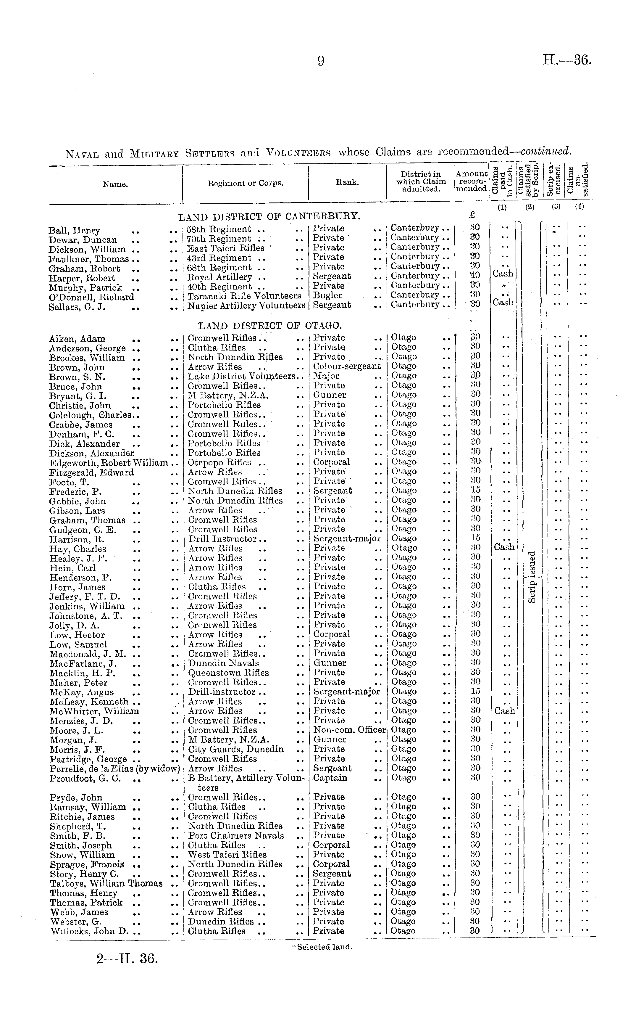 Eegiment or Corps. Kank. District in which Claim admitted. Amount I recomjmended M ill Sl Iα! Name. (1) (2) (3) (■*) Ball, Henry Dewar, Duncan Dickson, William .. Faulkner, Thomas Graham, Robert Harper, Robert Murphy, Patrick O'Donnell, Richard Sellars, G. J. .. ,AND DISTRICT OF CAN , 58th Begimont 70th Regiment ..'' Bast Taieri Rifles 43rd Regiment 08th Regiment Royal Artillery 40th Regiment Taranaki Rifle Volunteers Napier Artillery Volunteers rERBURY. Private .. ; Private Private .. \ Private .. ; Private .. I Sergeant Private .. \ Bugler .. : Sergeant .. Canterbury.. Canterbury .. Canterbury.. Canterbury .. Canterbury.. Canterbury .. Canterbury.. Canterbury .. Canterbury .. £ 30 30 30 30 30 ■40 80 30 30 Cash * Cash Aiken, Adam Anderson, George Brookes, William .. Brown, John .. .. Brown, S. N. .. Bruce, John .. Bryant, G. I. Christie, John Colclough, Charles.. Crabbe, James Denham, F. C. Dick, Alexander Dickson, Alexander Edgeworth, Robert William .. Fitzgerald, Edward Foote, T. Frederic, P. Gebbie, John Gibson, Lars Graham, Thomas .. Gudgeon, C. E. Harrison, R. Hay, Charles Healey, J. F. Hein, Carl Henderson, P. .. Horn, James Jeffery, F. T. D. Jenkins, William Johnstone, A. T. Jolly, D. A. Low, Hector Low, Samuel Macdonald, J. M. .. MacFarlane, J. .. .. Macklin, H. P. Maher, Peter McKay, Angus .. «. McLeay, Kenneth .. McWhirter, William Menzies, J. D. Moore, J. L. Morgan, J. Morris, J. F. Partridge, George Perrelle, de la Elias (by widow) Proudfoot, G. C. .. LAND DISTRICT OF ( Cromwell Rifles Clutha Rifles .. North Dunedin Rifles Arrow Rifles Lake District Volunteers.. Cromwell Rifles.. M Battery, N.Z.A. Portobello Rifles Cromwell Rifles.. Cromwell Rifles.. Cromwell Rifles.. Portobello Rifles Portobello Rifles Otepopo Rifles Arrow Rifles .. .. Cromwell Rifles North Dunedin Kifles North Dunedin Rifles Arrow Rifles Cromwell Rifles Cromwell Rifles Drill Instructor Arrow Rifles Arrow Rifles Arrow Rifles Arrow Rifles Clutha Rifles .. Cromwell Rifles Arrow Rifles Cromwell Rifles Cromwell Rifles Arrow Rifles Arrow Rifles Cromwell Rifles Dunedin Navals Quecnstown Rifles Cromwell Rifles Drill-instructor Arrow Rifles Arrow Rifles .. .. Cromwell Rifles.. .. Cromwell Rifles M Battery, N.Z.A. City Guards, Dunedin Cromwell Rifles Arrow Rifles B Battery, Artillery Volunteers Cromwell Rifles Clutha Rifles Cromwell Rifles .. North Dunedin Rifles Port Chalmers Navals Clutha Rifles .. West Taieri Rifles North Dunedin Rifles Cromwell Rifles Cromwell Rifles.. Cromwell Rifles.. .. Cromwell Rifles.. Arrow Rifles Dunedin Rifles .. Clutha Rifles .. }TAGO. i Private .. j I Private ! Private I Colour-sergeant ! Major I Private j Gunner j Private I Private I Private I Private ! Private j Private I Corporal J Private Private .. i Sergeant j Private ] Private .. | I Private I Private Sergeant-major j Private J Private Private I Private I Private j Private I Private .. j ! Private I Private Corporal .., ! Private Private Gunner I Private Private Sergeant-inajor Private Private Private Non-com. Officer! Gunner .. j Private .. I Private Sergeant Captain .. Otago Otago Otago Otago Otago Otago Otago Otago Otago Otago Otago Otago Otago Otago Otago Otago Otago Otago Otago Otago Otago Otago Otago Otago Otago Otago Otago Otago Otago Otago Otago Otago Otago O tago .. Otago Otago Otago Otago .. Otago Otago Otago Otago Otago Otago .. Otago .. Otago Otago .. 30 30 30 30 3.0 30 30 30 SO 30 30 30 30 30 30 30 15 30 30 30 30 15 30 30 30 30 30 30 30 30 30 30 30 30 30 30 30 15 30 30 30 30 30 30 30 30 30 Cash " •• Cash Pryde, John .. Ramsay, William .. Ritchie, James .. .. Shepherd, T. Smith, F. B. Smith, Joseph Snow, William Sprague, Francis Story, Henry C. Talboys, William Thomas .. Thomas, Henry Thomas, Patrick .. Webb, James .. Webster, G. Wiilocks, John D. .. Private .. j j Private j Private I Private .. j Private ' .. Corporal Private Corporal .. Sergeant .. Private .. Private .. Private .. Private Private Private leeted land. Otago .. Otago .. Otago Otago Otago Otago Otago Otago .. Otago Otago Otago Otago Otago Otago Otago 30 30 30 30 30 30 30 30 30 30 30 30 30 30 30 *Se: 2—H. 36.
