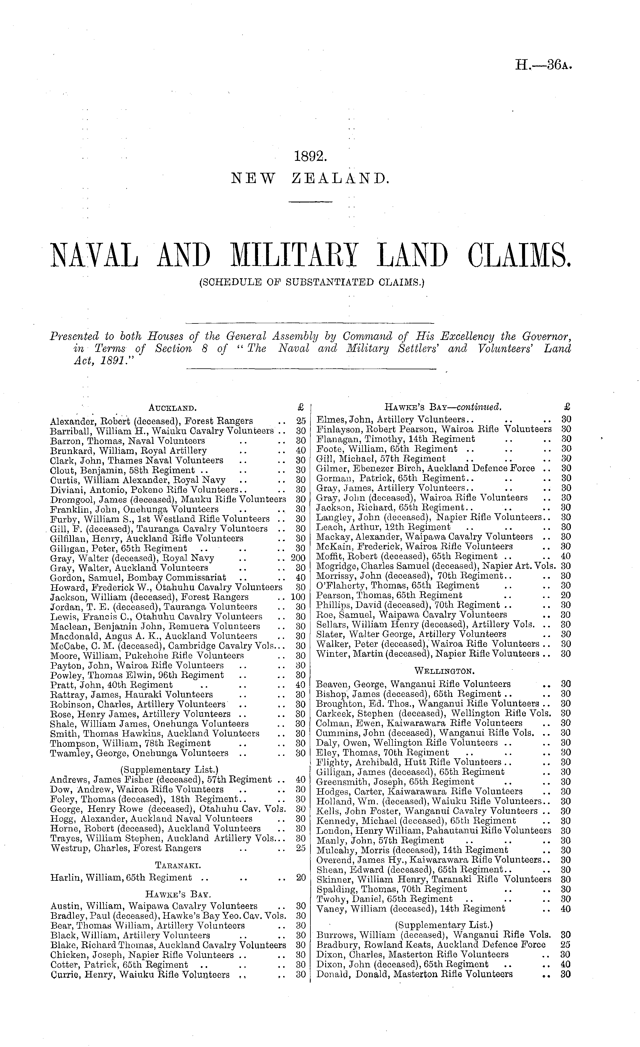 NAVAL AND MILITARY LAND CLAIMS. (SCHEDULE OF SUBSTANTIATED CLAIMS.)