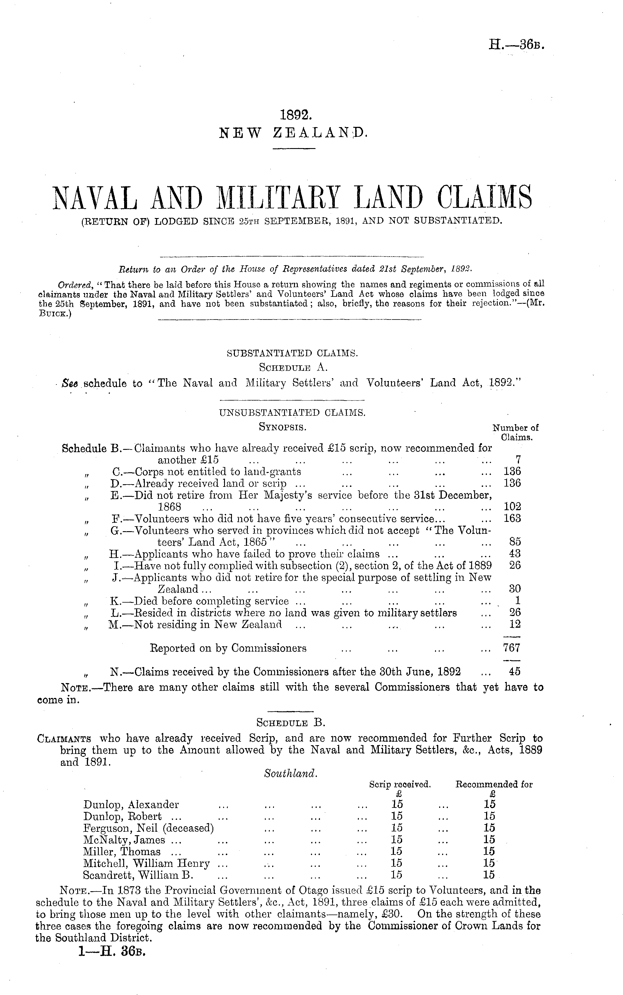 UNSUBSTANTIATED CLAIMS. Synopsis. Number of Claims. Schedule B.—Claimants who have already received £15 scrip, now recommended for another £15 ... ... ... ... ... ... 7 „ C.—Corps not entitled to land-grants ... ... ... ... 136 „ D. —Already received land or scrip ... ... ... ... ... 136 „ E.—Did not retire from Her Majesty's service before the 31st December, 1868 ... ... ... ... ... ... ... 102 „ P. —Volunteers who did not have five years' consecutive service... ... 163 „ G. —Volunteers who served in provinces which did not accept " The Volunteers' Land Act, 1865 " ... ... ... ... ... 85 „ H.—Applicants who have failed to prove their claims ... ... ... 43 „ I.—Have not fully complied with subsection (2), section 2, of the Act of 1889 26 „ J.---Applicants who did not retire for the special purpose of settling in New Zealand... ... ... ... ... ... ... 30 „ X. —Died before completing service ... ... ... ... .... 1 „ L.—Eesided in districts where no land was given to military settlers ... 26 „ M.—Not residing in New Zealand ... ... .... ... ... 12 Eeported on by Commissioners ... ... ... ... 767 „ N.—Claims received by the Commissioners after the 30th June, 1892 ... 45 Note. —There are many other claims still with the several Commissioners that yet have to come in. Schedule B. Claimants who have already received Scrip, and are now recommended for Further Scrip to bring them up to the Amount allowed by the Naval and Military Settlers, &c, Acts, 1889 and 1891. Southland. Scrip reoeived. Recommended for £ _ Dunlop, Alexander ... ... ... ... 15 ... 15 Dunlop, Eobert ... ... ... ... ... 15 ... 15 Ferguson, Neil (deceased) ... ... ... 15 ... 15 McNalty, James ... ... ... ... ... 15 ... 15 Miller, Thomas ... ... ... ... ... 15 ... 15 Mitchell, William Henry ... ... ... ... 15 ... 15 Scandrett, Williamß. ... ... ... ... 15 ... 15 Note.—ln 1873 the Provincial Government of Otago issued £15 scrip to Volunteers, and in the schedule to the Naval and Military Settlers', &c, Act, 1891, three claims of £15 each were admitted, to bring those men up to the level with other claimants —namely, £30. On the strength of these three cases the foregoing claims are now recommended by the Commissioner of Crown Lands for the Southland District. I—H. 36b.