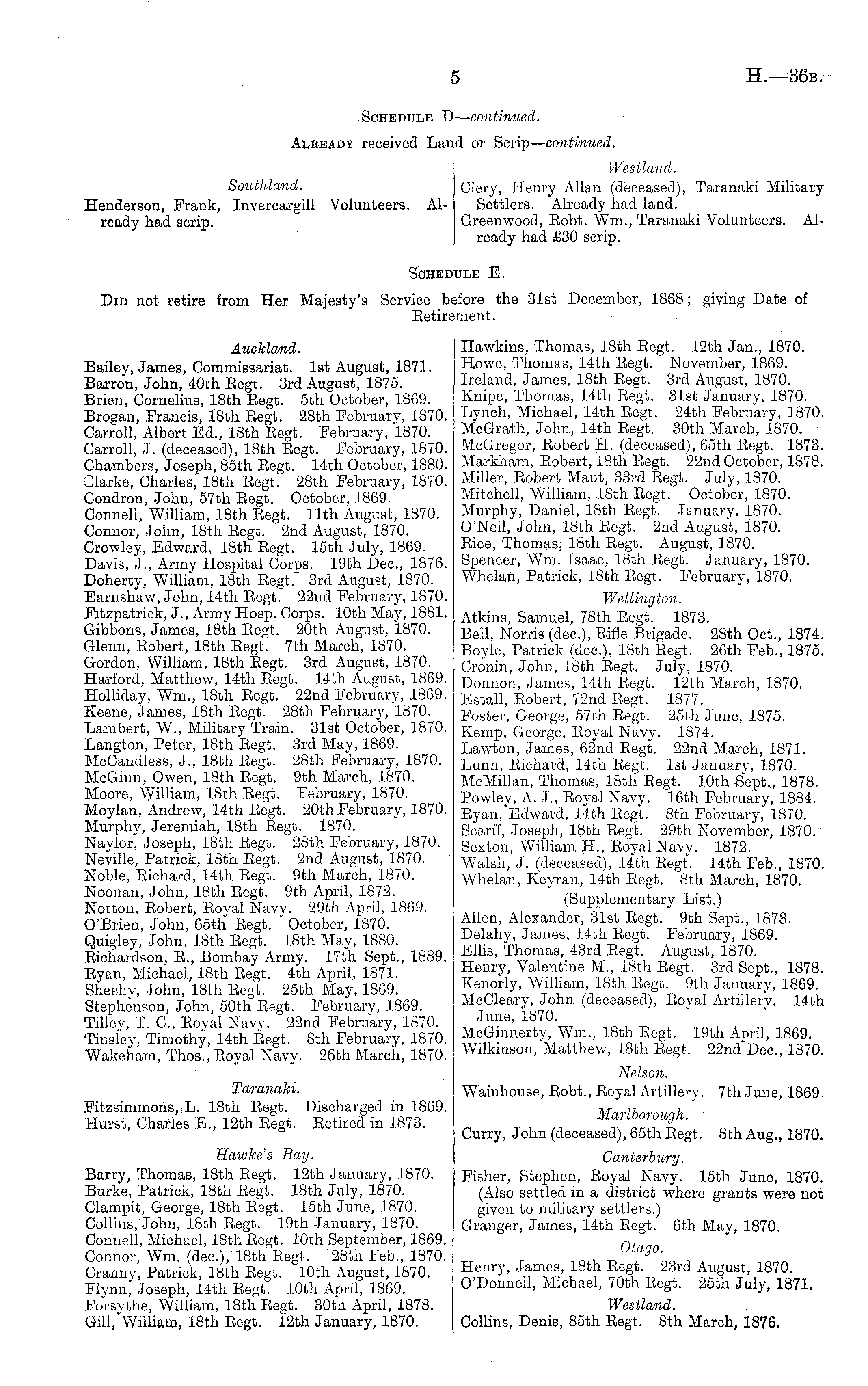 Hawkins, Thomas, 18th Begt. 12th Jan., 1870. Howe, Thomas, 14th Eegt. November, 1869. Ireland, James, 18th Eegt. 3rd August, 1870. Knipe, Thomas, 14th Begt. 31st January, 1870. Lynch, Michael, 14th Eegt. 24th February, 1870. M"cGrath, John, 14th Eegt. 30th March, 1870. McGregor, Eobert H. (deceased), 65th Eegt. 1873. Markham, Eobert, 18th Eegt. '22nd October, 1878. Miller, Eobert Maut, 33rd Eegt. July, 1870. Mitchell, William, 18th Eegt. October, 1870. Murphy, Daniel, 18th Eegt. January, 1870. O'Neil, John, 18th Eegt. 2nd August, 1870. Eice, Thomas, 18th Eegt. August, 1870. Spencer, Wm. Isaac, 18th Begt. January, 1870. Whelaii, Patrick, 18th Begt. February, 1870. Wellington. Atkins, Samuel, 78th Eegt. 1873. Bell, Norris (dec), Bifle Brigade. 28th Oct., 1874. Boyle, Patrick (dec), 18th Begt. 26th Feb., 1875. Cronin, John, 18th Begt. July, 1870. Donnon, James, 14th Begt. 12th March, 1870. Estall, Eobert, 72nd Eegt. 1877. Foster, George, 57th Eegt. 25th June, 1875. Kemp, George, Eoyal Navy. 1874. Lawton, James, 62nd Eegt. 22nd March, 1871. Lunn, Eichard, 14th Eegt. Ist January, 1870. McMillan, Thomas, 18th Eegt. 10th Sept., 1878. Powley, A. J., Eoyal Navy. 16th February, 1884. Eyan,"Edward, 14th Eegt. Bth February, 1870. Scarff, Joseph, 18th Eegt. 29th November, 1870. Sexton, William H., Eoyal Navy. 1872. Walsh, J. (deceased), 14th Eegt. 14th Feb., 1870. W'helan, Keyran, 14th Eegt. Bth March, 1870. (Supplementary List.) Allen, Alexander, 31st Eegt. 9th Sept., 1873. Delahy, James, 14th Eegt. February, 1869. Ellis, Thomas, 43rd Begt. August, 1870. Henry, Valentine M., 18th Begt. 3rd Sept., 1878. Kenorly, William, 18th Begt. 9th January, 1869. McCleary, John (deceased), Eoval Artillery. 14th June, 1870. McGinnerty, Wm., 18th Begt. 19th April, 1869. Wilkinson, Matthew, 18th Eegt. 22nd Dec, 1870. Nelson. Wainhouse, Bobt., Boyal Artillery. 7th June, 1869, Marlborough. Curry, John (deceased), 65th Eegt. Bth Aug., 1870. Canterbury. Fisher, Stephen, Boyal Navy. 15th June, 1870. (Also settled in a district where grants were not given to military settlers.) Granger, James, 14th Eegt. 6th May, 1870. Otago. Henry, James, 18th Eegt. 23rd August, 1870. O'Donnell, Michael, 70th Eegt. 25th July, 1871. Westland. Collins, Denis, 85th Eegt. Bth March, 1876.