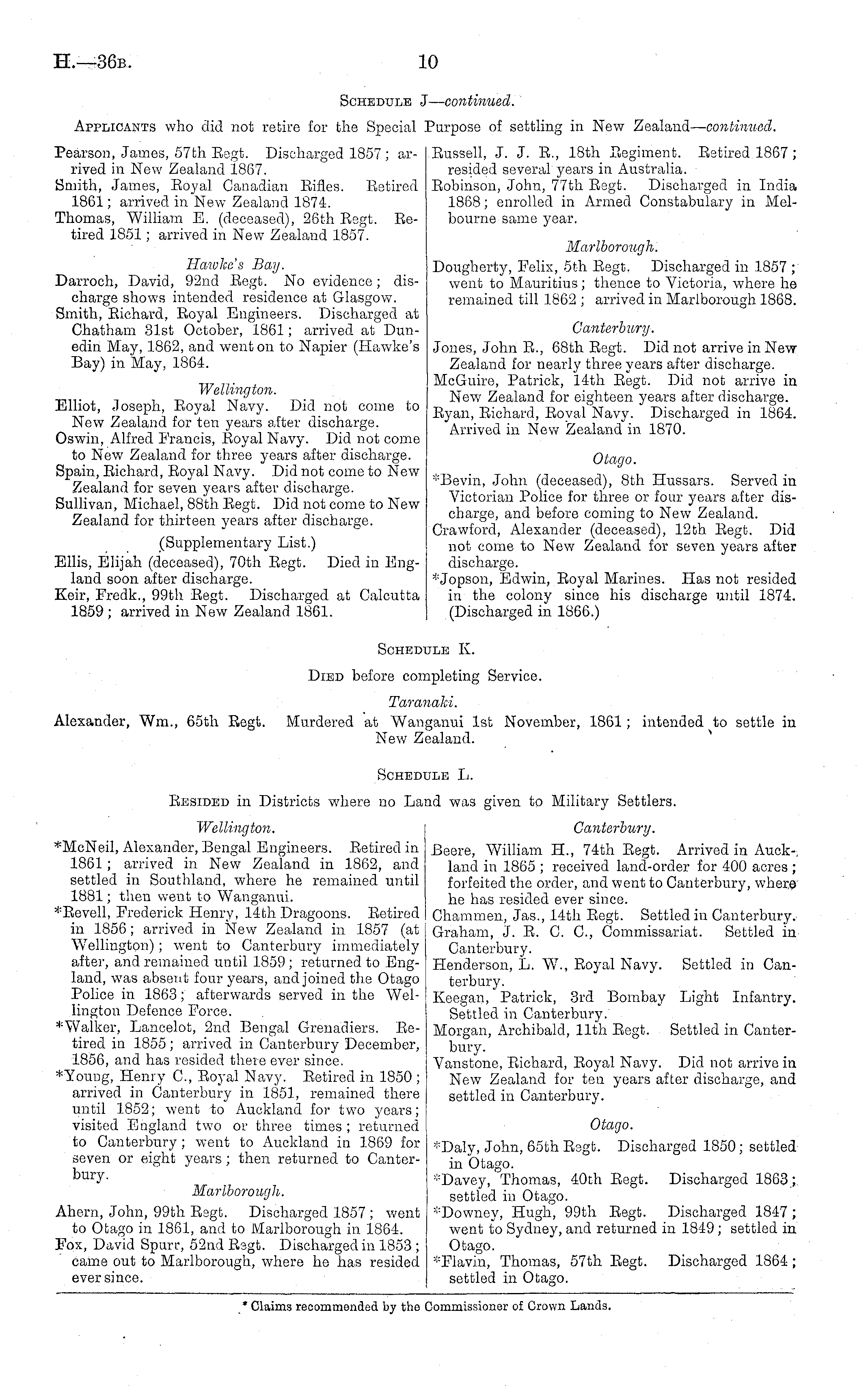 Schedule K. Died before completing Service. Taranaki. Alexander, Wm., 65th Begt. Murdered at Wanganui Ist November, 1861; intended to settle in New Zealand. Schedule L. Eesided in Districts where no Land was given to Military Settlers.