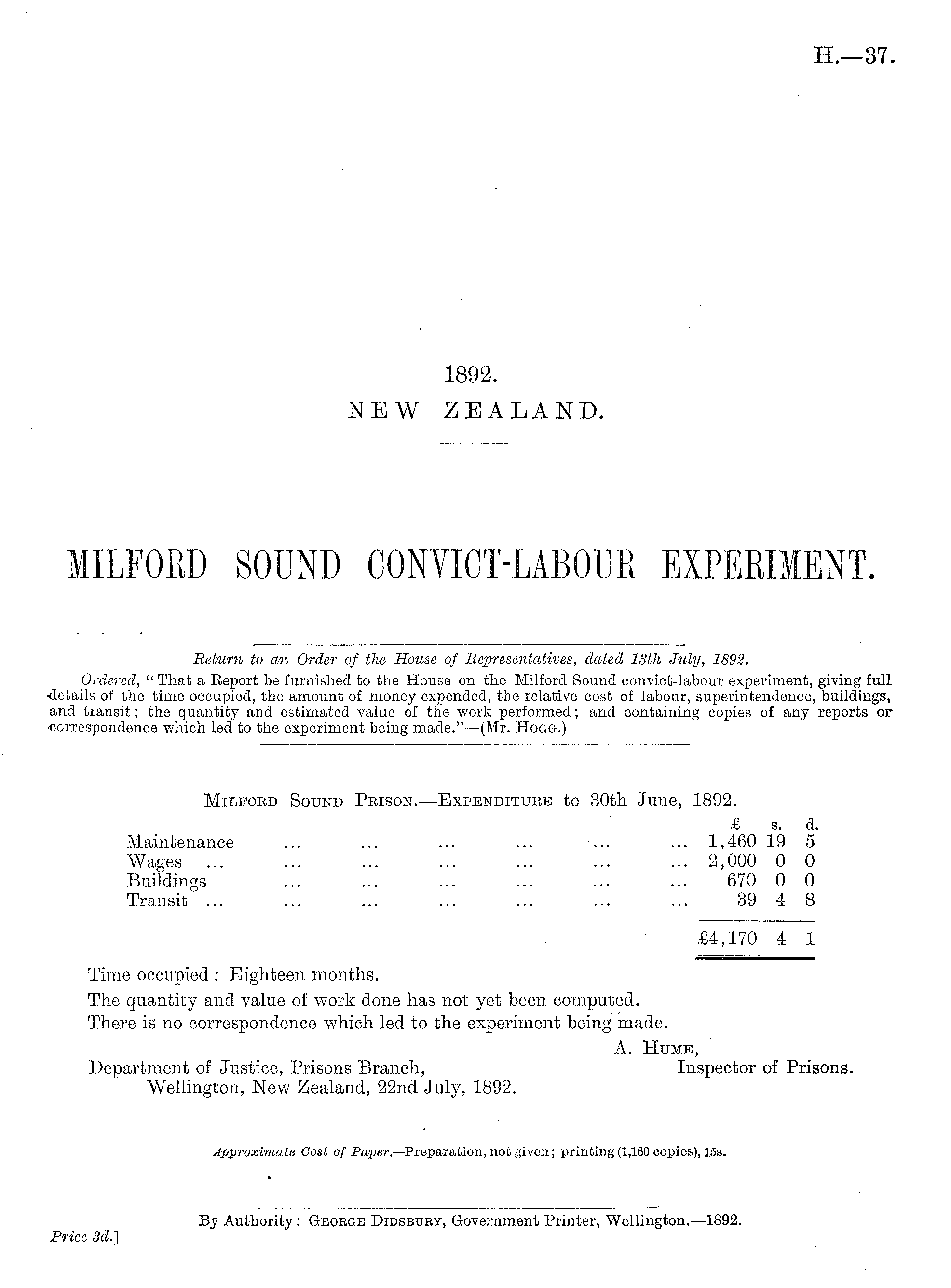 Return to an Order of the House of Representatives, dated 13th July, 1892. Ordered, " That a Report be furnished to the House on the Milford Sound convict-labour experiment, giving full details of the time occupied, the amount of money expended, the relative cost of labour, superintendence, buildings, and transit; the quantity and estimated value of the work performed; and containing copies of any reports or ■correspondence which led to the experiment being made."—(Mr. Hogg.)