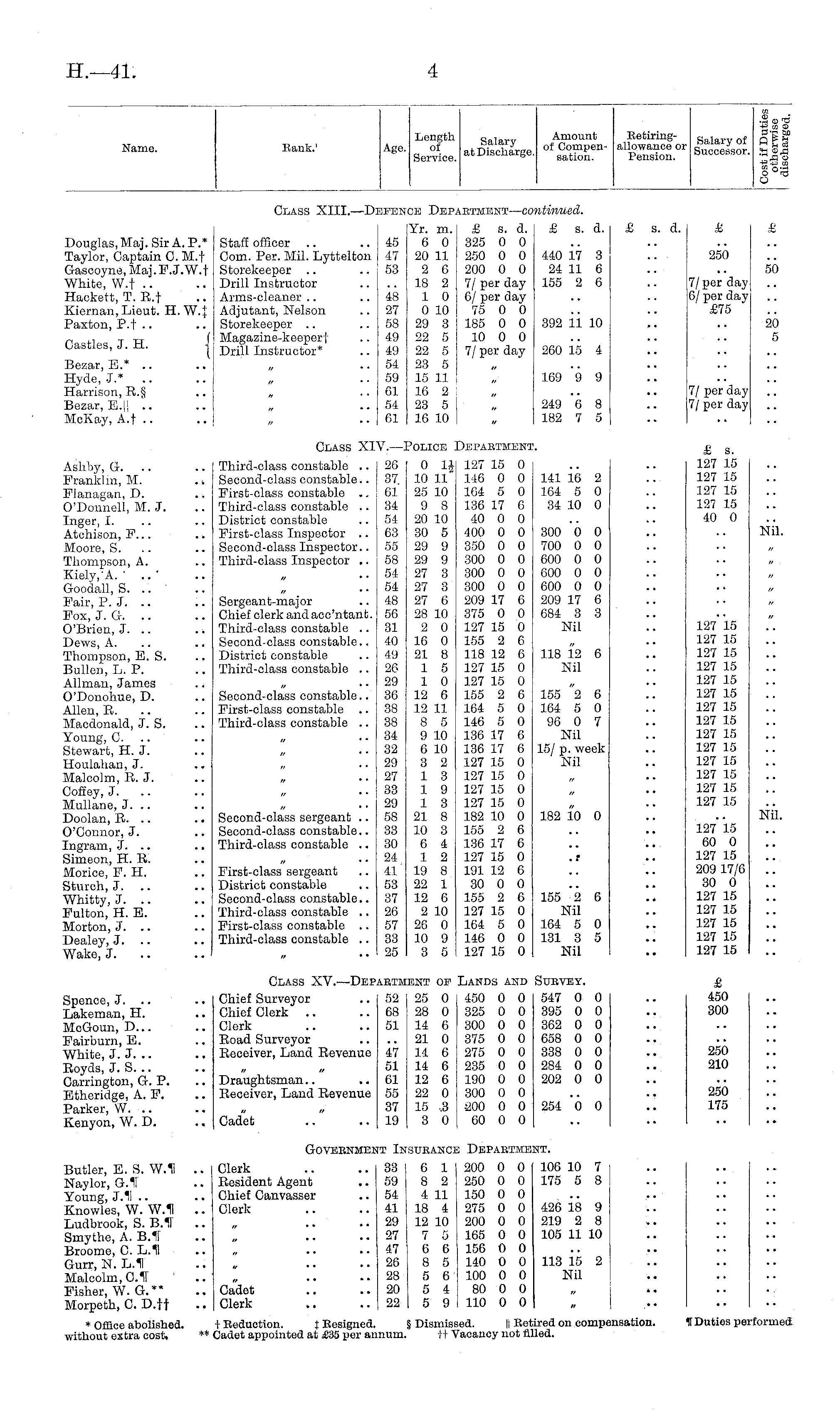 Name. Bank. 1 Age. Length of Service. Salary at Discharge.! Amount of Compensation. Eetiringallowance or Pension. Salary of Successor. <D r-J O °rO O Class XIII.—Di KEENi ice Dep. AETMENT — C01 •itinued. Douglas, Maj. Sir A. P.* Taylor, Captain C. M.f Gascoyne, Maj. F.J.W.t White, W.t Hackett, T. R.f Kiernan,Lieut. H.W.J Paxton, P.t Castles, J. H. Staff officer .. Com. Per. Mil. Lyttelton Storekeeper Drill Instructor ; Arms-cleaner .. ! Adjutant, Nelson | Storekeeper .. : Magazine-keeper! Drill Instructor* 45 i 47 53 48 27 58 49 49 54 59 61 54 61 Yr. m. 6 0 20 11 2 6 18 2 1 0 0 10 29 3 22 5 22 5 23 5 15 11 16 2 23 5 16 10 £ s. d. 325 0 0 250 0 0 200 0 0 7/ per day 6/ per day 75 0 0 185 0 0 10 0 0 7/ per day £ s. d. 440 17 3 24 11 6 155 2 6 £ s. d. S 250 7/ per day 6/ per day £75 £ 50 392 ii 10 20 5 260 15 4 Bezar, E.* Hyde, J.* .. Harrison, R.§ Bezar, E.|| McKay, A.t .. 169 9 9 249 '6 8 182 7 5 7/ per day 7/ per day " „ Ashby, G. .. Franklin, M. Planagan, D. O'Donnell, M. J. Inger, I. Atchison, P... Moore, S. Thompson, A. Kiely.'A. ' .." Goodall, S. .. ■ Pair, P.J... Pox, J. G. .. O'Brien, J. .. Dews, A. Thompson, E. S. Bullen.L. P. Allman, James O'Donohue, D. Allen, R. Macdonald, J. S. Young, C. .. Stewart, H. J. Houlahan, J. Malcolm, R. J. Coffey, J. Mullane, J. .. Doolan, R. .. O'Connor, J. Ingram, J. .. Simeon, H. R. Morice, P. H. Sturch, J. Whitty, J. .. Pulton, H. E. Morton, J. .. Dealoy, J. Wake, J. Class XT V.—I Police ■ Depaetment. £ s. 127 15 127 15 127 15 127 15 40 0 Third-class constable .. I Second-class constable.. First-class constable .. Third-class constable .. | District constable .. j First-class Inspector .. Seoond-olass Inspector.. Third-class Inspector .. Sergeant-major Chief clerk and acc'ntant. Third-class constable .. Second-class constable., District constable Third-class constable .. Second-class constable.. Pirst-class constable .. Third-class constable .. 26 37. ! 61 I 34 ' 54 63 55 58 54 54 48 56 31 40 49 26 29 36 38 38 34 32 29 27 33 29 58 33 30 24 41 53 37 26 57 33 25 0 I, 1 , 10 11 25 10 9 8 20 10 30 5 29 9 29 9 27 3 27 3 27 6 28 10 2 0 16 0 21 8 1 5 1 0 12 6 12 11 8 5 9 10 6 10 3 2 1 3 1 9 1 3 21 8 10 3 6 4 1 2 19 8 22 1 12 6 2 10 26 0 10 9 3 5 127 15 0 146 0 0 104 5 0 136 17 6 40 0 0 400 0 0 350 0 0 300 0 0 300 0 0 300 0 0 209 17 6 375 0 0 127 15 0 155 2 6 118 12 6 127 15 0 127 15 0 155 2 6 164 5 0 146 5 0 130 17 6 136 17 6 127 15 0 127 15 0 127 15 0 127 15 0 182 10 0 155 2 6 136 17 6 127 15 0 191 12 6 30 0 0 155 2 6 127 15 0 164 5 0 146 0 0 127 15 0 141 16 2 164 5 0 34 10 0 300 0 0 700 0 0 600 0 0 600 0 0 600 0 0 209 17 6 684 3 3 Nil 118 12 6 Nil 155 2 6 164 5 0 96 0 7 Nil 15/ p. week Nil 127 15 127 15 127 15 127 15 127 15 127 15 127 15 127 15 127 15 127 15 127 15 127 15 127 15 127 15 Nil. Second-class sergeant .. Second-class constable.. Third-class constable .. 182 10 0 Nil. Pirst-class sergeant District constable Second-class constable.. Third-class constable .. Pirst-class constable .. Third-class constable .. 155 2 6 Nil 164 5 0 131 3 5 Nil 127 15 60 0 127 15 209 17/6 30 0 127 15 127 15 127 15 127 15 127 15 Spence, J. .. Lakeman, H. McGoun, D... Pairburn, E. White, J.J... Royds, J. S. .. Carrington, G. P. Etheridge, A. P. Parker, W. .. Kenyon, W. D. Class XV.—Dep. aetm: [ENT oe Lands and ! Survey. £ 450 300 Chief Surveyor Chief Clerk Clerk Road Surveyor Receiver, Land Revenue 52 j 68 51 I 25 0 28 0 14 6 21 0 14 6 14 6 12 6 22 0 15 ,3 3 0 450 0 0 325 0 0 300 0 0 375 0 0 275 0 0 235 0 0 190 0 0 300 0 0 -200 0 0 60 0 0 547 0 0 395 0 0 362 0 0 658 0 0 338 0 0 284 0 0 202 0 0 Draughtsman Receiver, Land Revenue 47 51 61 55 37 19 250 210 250 175 254 0 0 Cadet Governmen n In :sueanci 5 Depabtmbi NT. Butler, E. S. W.li .. Naylor, G.li Young, J.11 .. Knowles, W. W.I! .. Ludbrook, S. B.H .. Smythe, A. B.li Broome, C. L.1I Gurr, N. L.I Malcolm, C.IT Fisher, W. G.** Morpeth, C. D.ff Clerk Resident Agent Chief Canvasser Clerk 33 59 54 41 29 27 47 26 28 20 22 6 1 8 2 4 11 18 4 12 10 7 5 6 6 8 5 5 6 5 4 5 9 200 0 0 250 0 0 150 0 0 275 0 0 200 0 0 165 0 0 156 0 0 140 0 0 100 0 0 80 0 0 110 0 0 106 10 7 175 5 8 426 18 9 219 2 8 105 11 10 I 113 15 2 Nil Cadet Clerk I ... * Office abolished, without extra cost. ** I Seduction. J Eesigned. Cadet appointed at £'65 per an I muni. § Dismiss ft >ed. li Eeti Vacancy not fill ired on compi lied. msation. If Duties per rformei