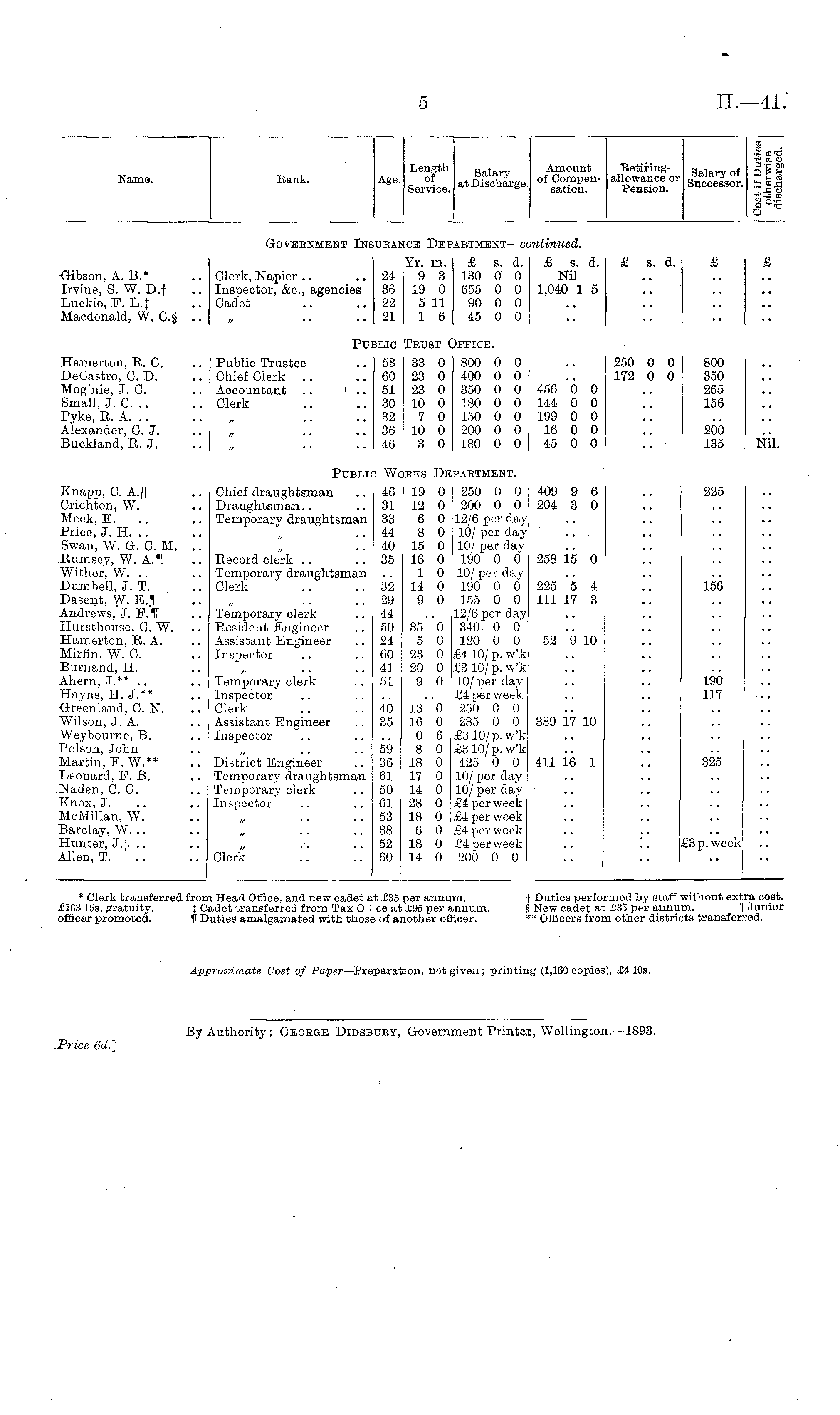 Name. Hank. Age. Lon f th Salary Service, at Discharge. Amount of Compensation. Retiringallowance or Pension. CO .Sod 43 m a P '£ °o Salary of R g g Successor, jj «,a M o Government Ins ;ura: ice Department— cc mtinued. Gibson, A. B.* Irvine, S. W. D.f Luckie, F. L.J Macdonald, W. C.§ Clerk, Napier Inspector, &c, agencies Cadet 24 36 22 21 Yr. m. £ s. d. 9 3 130 0 0 19 0 655 0 0 5 11 90 0 0 16 45 0 0 £ s. d. Nil 1,040 1 5 £ s. d. £ £ Hamerton, R. G. DeCastro, C. D. Moginie, J. C. Small, J. C. .. Pyke, R. A. Alexander, C. J. Buckland, R. J. Pu: BLIC Trust Office. 250 0 0 172 0 0 800 350 265 156 Public Trustee Chief Clerk Accountant .. ' .. Clerk 53 60 51 30 32 36 46 33 0 800 0 0 23 0 400 0 0 23 0 350 0 0 10 0 180 0 0 7 0 150 0 0 10 0 200 0 0 3 0 180 0 0 456 0 0 144 0 0 199 0 0 16 0 0 45 0 0 200 135 Nil. Knapp, C. A. I ] Crichton, W. Meek, E. Price, J. H. .. Swan, W. G. C. M. Rumsey, W. A.H Wittier, W. .. Dumbell, J. T. Dasent, W. E..11 Andrews, J. F.li Hursthouse, C. W. Hamerton, R. A. Mirfin, W. C. Burnand, H. Ahem, J.** .. Hayns, H. J.** Greenland, C. N. Wilson, J. A. Weybourne, B. Poison, John Martin, F. W.** Leonard, F. B. Naden, C. G. Knox, J, McMillan, W. Barclay, W. .. Hunter, J.j] Allen, T. PUBLU 3 Wl irks Depabtment. 409 9 6 204 3 0 225 Chief draughtsman Draughtsman.. Temporary draughtsman 46 31 33 44 40 35 19 0 250 0 0 12 0 200 0 0 6 0 12/6 per day 8 0 10/ per day 15 0 10/ per day 16 0 190 0 0 1 0 10/ per day 14 0 190 0 6 9 0 155 0 0 .. 12/6 per day 35 0 340 0 0 5 0 120 0 0 23 0 £4 10/p. w'k 20 0 £3 10/p. w'k 9 0 10/ per day £4 per week 13 0 250 0 0 16 0 285 0 0 0 6 £3 10/p. w'k 8 0 £310/p. w'k 18 0 425 0 0 17 0 10/ per day 14 0 10/ per day 28 0 £4 per week 18 0 £4 per week 6 0 £4 per week 18 0 £4 per week 14 0 200 0 0 Record clerk Temporary draughtsman Clerk 258 15 0 32 29 44 50 24 60 41 51 225 5 4 111 17 3 156 Temporary clerk Resident Engineer Assistant Engineer Inspector 52 '9 10 Temporary clerk Inspector Clerk Assistant Engineer Inspector 190 117 40 35 389 17 10 District Engineer Temporary draughtsman Temporary clerk Inspector 59 36 61 50 61 53 38 52 60 411 16 1 325 £3 p. week Clerk '.'. '.'.