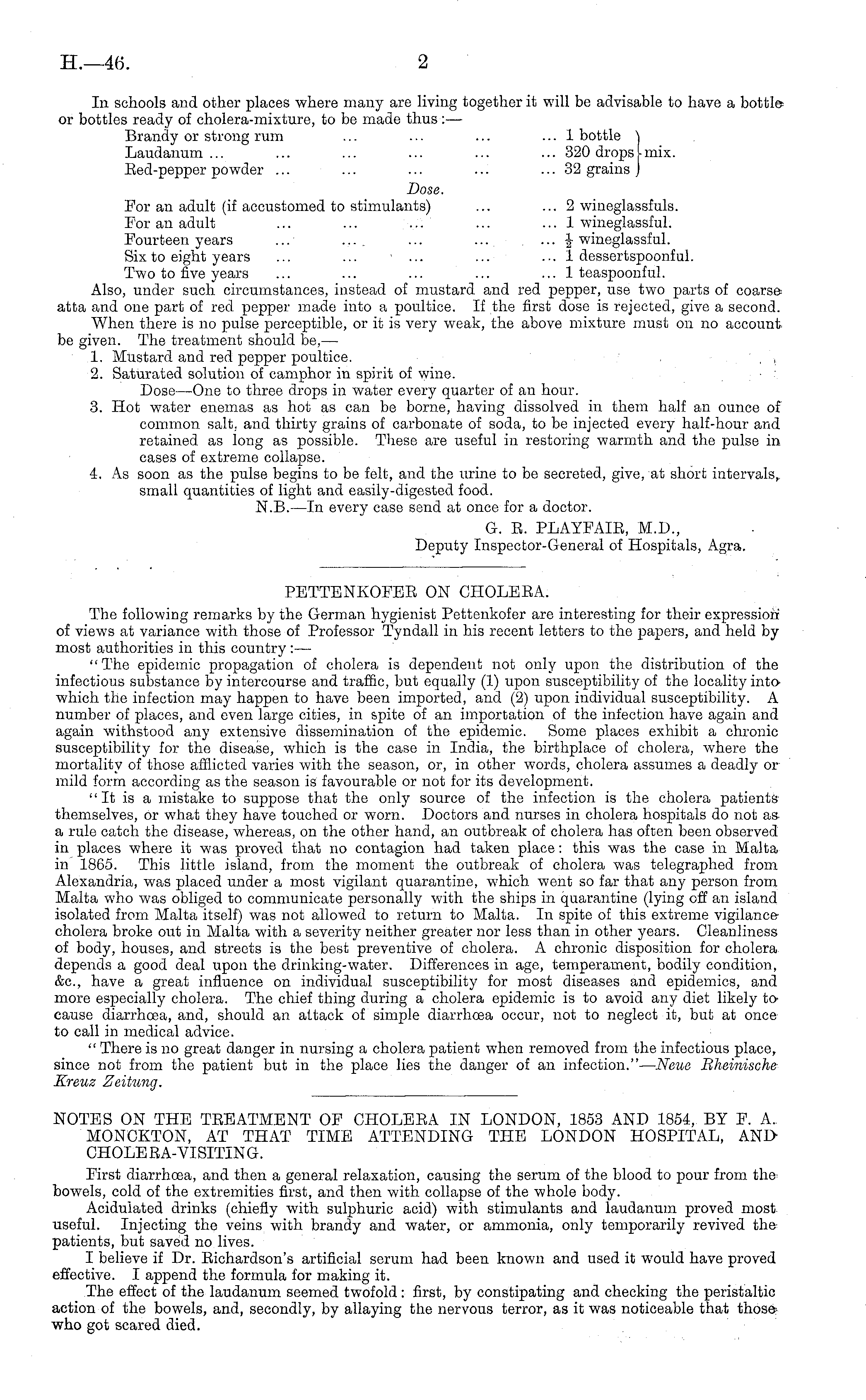 In schools and other places where many are living together it will be advisable to have a bottle or bottles ready of cholera-mixture, to be made thus: — Brandy or strong rum ... ... ... ... 1 bottle \ Laudanum... ... ... ... ... ... 320 drops I mix. Bed-pepper powder ... ... ... ... ... 32 grains J Dose. For an adult (if accustomed to stimulants) ... ... 2 wineglassfuls. For an adult ... ... ... ... ... 1 wineglassful. Fourteen years ... ... ._ ... .... ... Six to eight years ... ... ... ... ... 1 dessertspoonful. Two to five years ... ... ... ... ... 1 teaspoonful. Also, under such circumstances, instead of mustard and red pepper, use two parts of coarse atta and one part of red pepper made into a poultice. If the first dose is rejected, give a second. When there is no pulse perceptible, or it is very weak, the above mixture must on no account be given. The treatment should be, — 1. Mustard and red pepper poultice. , , 2. Saturated solution of camphor in spirit of wine. Dose—One to three drops in water every quarter of an hour. 3. Hot water enemas as hot as can be borne, having dissolved in them half an ounce of common salt, and thirty grains of carbonate of soda, to be injected every half-hour and retained as long as possible. These are useful in restoring warmth and the pulse in cases of extreme collapse. 4. As soon as the pulse begins to be felt, and the urine to be secreted, give, at short intervals, small quantities of light and easily-digested food. N.B. —In every case send at once for a doctor. G. B. BLAYFAIB, M.D., Deputy Inspector-General of Hospitals, Agra.