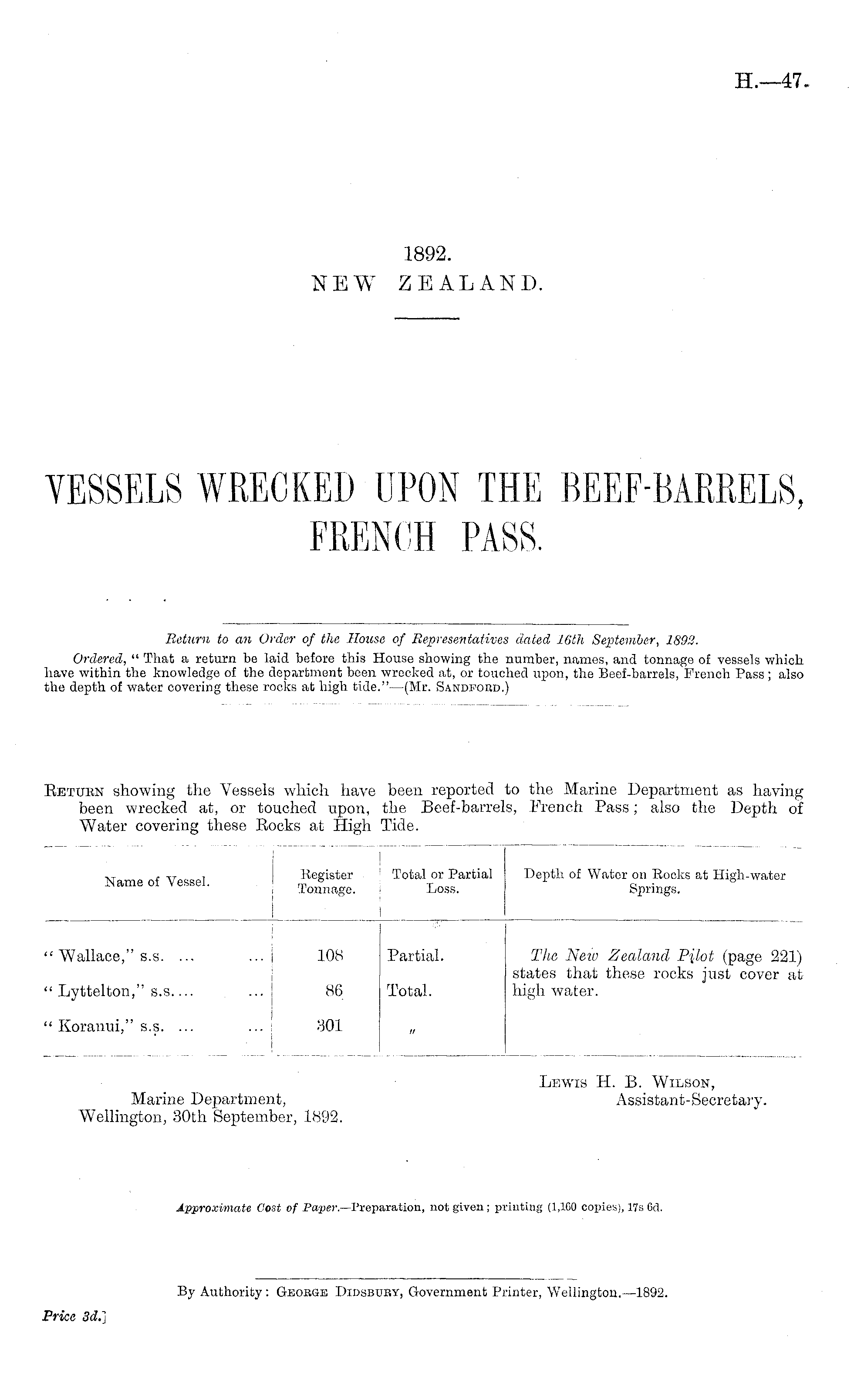Lewis H. B. Wilson, Marine Department, Assistant-Secretary. Wellington, 30th September, 1892. Approximate Cost of Paper.—Preparation, not given ; printing (1,100 copies), 17s Cd.