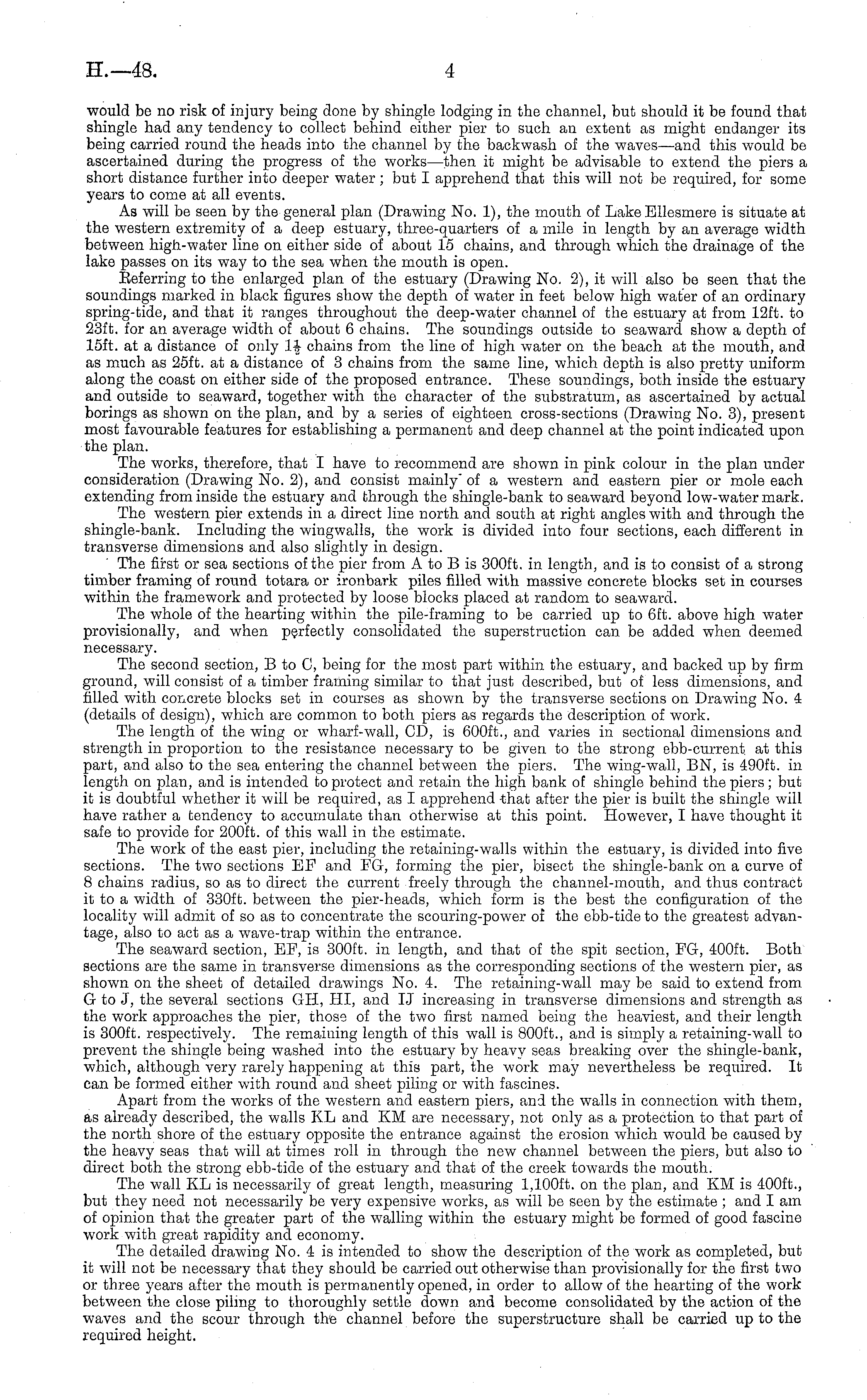 would be no risk of injury being done by shingle lodging in the channel, but should it be found that shingle had any tendency to collect behind either pier to such an extent as might endanger its being carried round the heads into the channel by the backwash of the waves—and this would be ascertained during the progress of the works—then it might be advisable to extend the piers a short distance further into deeper water ; but I apprehend that this will not be required, for some years to come at all events. As will be seen by the general plan (Drawing No. 1), the mouth of Lake Ellesmere is situate at the western extremity of a deep estuary, three-quarters of a mile in length by an average width between high-water line on either side of about 15 chains, and through which the drainage of the lake passes on its way to the sea when the mouth is open. Beferring to the enlarged plan of the estuary (Drawing No. 2), it will also be seen that the soundings marked in black figures show the depth of water in feet below high water of an ordinary spring-tide, and that it ranges throughout the deep-water channel of the estuary at from 12ft. to 23ft. for an average width of about 6 chains. The soundings outside to seaward show a depth of 15ft. at a distance of only 1-|- chains from the line of high water on the beach at the mouth, and as much as 25ft. at a distance of 3 chains from the same line, which depth is also pretty uniform along the coast on either side of the proposed entrance. These soundings, both inside the estuary and outside to seaward, together with the character of the substratum, as ascertained by actual borings as shown on the plan, and by a series of eighteen cross-sections (Drawing No. 3), present most favourable features for establishing a permanent and deep channel at the point indicated upon the plan. The works, therefore, that I have to recommend are shown in pink colour in the plan under consideration (Drawing No. 2), and consist mainly" of a western and eastern pier or mole each extending from inside the estuary and through the shingle-bank to seaward beyond low-watermark. The western pier extends in a direct line north and south at right angles with and through the shingle-bank. Including the wing-walls, the work is divided into four sections, each different in transverse dimensions and also slightly in design. The first or sea sections of the pier from A to B is 300 ft. in length, and is to consist of a strong timber framing of round totara or ironbark piles filled with massive concrete blocks set in courses within the framework and protected by loose blocks placed at random to seaward. The whole of the hearting within the pile-framing to bo carried up to 6ft. above high water provisionally, and when perfectly consolidated the superstruction can be added when deemed necessary. The second section, B to C, being for the most part within the estuary, and backed up by firm ground, will consist of a timber framing similar to that just described, but of less dimensions, and filled with concrete blocks set in courses as shown by the transverse sections on Drawing No. 4 (details of design), which are common to both piers as regards the description of work. The length of the wing or wharf-wall, CD, is 600 ft., and varies in sectional dimensions and strength in proportion to the resistance necessary to be given to the strong ebb-current at this part, and also to the sea entering the channel between the piers. The wing-wall, BN, is 490 ft. in length on plan, and is intended to protect and retain the high bank of shingle behind the piers ; but it is doubtful whether it will be required, as I apprehend -that after the pier is built the shingle will have rather a tendency to accumulate than otherwise at this point. However, I have thought it safe to provide for 200 ft. of this wall in the estimate. The work of the east pier, including the retaining-walls within the estuary, is divided into five sections. The two sections EF and EG, forming the pier, bisect the shingle-bank on a curve of 8 chains radius, so as to direct the current freely through the channel-mouth, and thus contract it to a width of 330 ft. between the pier-heads, which form is the best the configuration of the locality will admit of so as to concentrate the scouring-power of the ebb-tide to the greatest advantage, also to act as a wave-trap within the entrance. The seaward section, EF, is 300 ft. in length, and that of the spit section, FG, 400 ft. Both sections are the same in transverse dimensions as the corresponding sections of the western pier, as shown on the sheet of detailed drawings No. 4. The retaining-wall may be said to extend from G to J, the several sections GH, HI, and IJ increasing in transverse dimensions and strength as the work approaches the pier, those of the two first named being the heaviest, and their length is 300 ft. respectively. The remaining length of this wall is 800 ft., and is simply a retaining-wall to prevent the shingle being washed into the estuary by heavy seas breaking over the shingle-bank, which, although very rarely happening at this part, the work may nevertheless be required. It can be formed either with round and sheet piling or with fascines. Apart from the works of the western and eastern piers, and the walls in connection with them, as already described, the walls XL and KM are necessary, not only as a protection to that part of the north shore of the estuary opposite the entrance against the erosion which would be caused by the heavy seas that will at times roll in through the new channel between the piers, but also to direct both the strong ebb-tide of the estuary and that of the creek towards the mouth. The wall XL is necessarily of great length, measuring I,looft. on the plan, and KM is 400 ft., but they need not necessarily be very expensive works, as will be seen by the estimate ; and I am of opinion that the greater part of the walling within the estuary might be f