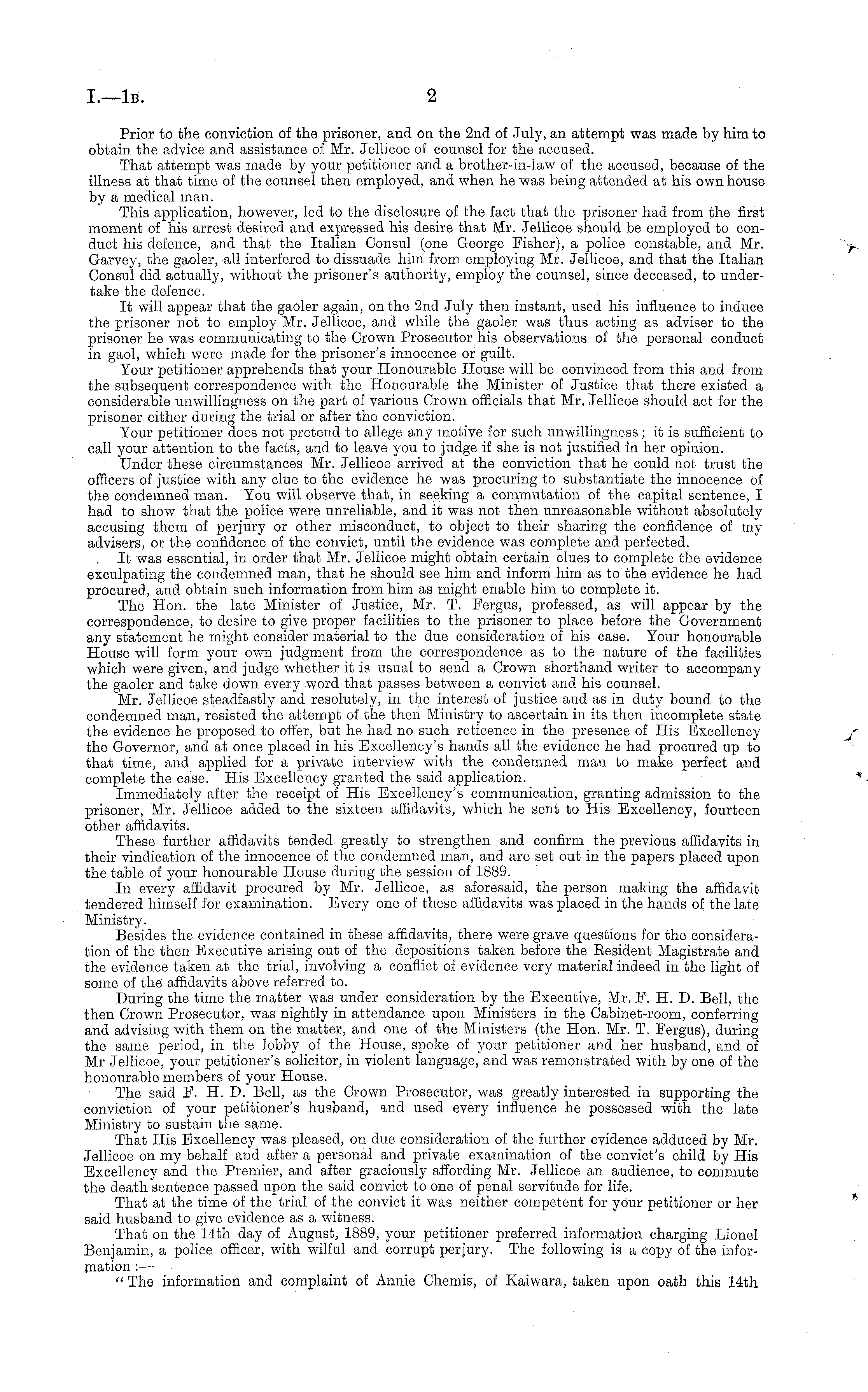 Prior to the conviction of the prisoner, and on the 2nd of July, an attempt was made by him to obtain the advice and assistance of Mr. Jellicoe of counsel for the accused. That attempt was made by your petitioner and a brother-in-law of the accused, because of the illness at that time of the counsel then employed, and when he was being attended at his own house by a medical man. This application, however, led to the disclosure of the fact that the prisoner had from the first moment of his arrest desired and expressed his desire that Mr. Jellicoe should be employed to conduct his defence, and that the Italian Consul (one George Fisher), a police constable, and Mr. Garvey, the gaoler, all interfered to dissuade him from employing Mr. Jellicoe, and that the Italian Consul did actually, without the prisoner's authority, employ the counsel, since deceased, to undertake the defence. It will appear that the gaoler again, on the 2nd July then instant, used his influence to induce the prisoner not to employ Mr. Jellicoe, and while the gaoler was thus acting as adviser to the prisoner he was communicating to the Crown Prosecutor his observations of the personal conduct in gaol, which were made for the prisoner's innocence or guilt. Your petitioner apprehends that your Honourable House will be convinced from this and from the subsequent correspondence with the Honourable the Minister of Justice that there existed a considerable unwillingness on the part of various Crown officials that Mr. Jellicoe should act for the prisoner either during the trial or after the conviction. Your petitioner does not pretend to allege any motive for such unwillingness; it is sufficient to call your attention to the facts, and to leave you to judge if she is not justified in her opinion. Under these circumstances Mr. Jellicoe arrived at the conviction that he could not trust the officers of justice with any clue to the evidence he was procuring to substantiate the innocence of the condemned man. You will observe that, in seeking a commutation of the capital sentence, I had to show that the police were unreliable, and it was not then unreasonable without absolutely accusing them of perjury or other misconduct, to object to their sharing the confidence of my advisers, or the confidence of the convict, until the evidence was complete and perfected. It was essential, in order that Mr. Jellicoe might obtain certain clues to complete the evidence exculpating the condemned man, that he should see him and inform him as to the evidence he had procured, and obtain such information from him as might enable him to complete it. The Hon. the late Minister of Justice, Mr. T. Fergus, professed, as will appear by the correspondence, to desire to give proper facilities to the prisoner to place before the Government any statement he might consider material to the due consideration of his case. Your honourable House will form your own judgment from the correspondence as to the nature of the facilities which were given, and judge whether it is usual to send a Crown shorthand writer to accompany the gaoler and take down every word that passes between a convict and his counsel. Mr. Jellicoe steadfastly and resolutely, in the interest of justice and as in duty bound to the condemned man, resisted the attempt of the then Ministry to ascertain in its then incomplete state the evidence he proposed to offer, but he had no such reticence in the presence of His Excellency the Governor, and at once placed in his Excellency's hands all the evidence he had procured up to that time, and applied for a private interview with the condemned man to make perfect and complete the case. His Excellency granted the said application. Immediately after the receipt of His Excellency's communication, granting admission to the prisoner, Mr. Jellicoe added to the sixteen affidavits, which he sent to His Excellency, fourteen other affidavits. These further affidavits tended greatly to strengthen and confirm the previous affidavits in their vindication of the innocence of the condemned man, and are set out in the papers placed upon the table of your honourable House during the session of 1889. In every affidavit procured by Mr. Jellicoe, as aforesaid, the person making the affidavit tendered himself for examination. Every one of these affidavits was placed in the hands of the late Ministry. Besides the evidence contained in these affidavits, there were grave questions for the consideration of the then Executive arising out of the depositions taken before the Eesident Magistrate and the evidence taken at the trial, involving a conflict of evidence very material indeed in the light of some of the affidavits above referred to. During the time the matter was under consideration by the Executive, Mr. F. H. D. Bell, the then Crown Prosecutor, was nightly in attendance upon Ministers in the Cabinet-room, conferring and advising with them on the matter, and one of the Ministers (the Hon. Mr. T. Fergus), during the same period, in the lobby of the House, spoke of your petitioner and her husband, and of Mr Jellicoe, your petitioner's solicitor, in violent language, and was remonstrated with by one of the honourable members of your House. The said F. H. D. Bell, as the Crown Prosecutor, was greatly interested in supporting the conviction of your petitioner's husband, and used every influence he possessed with the late Ministry to sustain the same. That His Excellency was pleased, on due consideration of the further evidence adduced by Mr. Jellicoe on my behalf and after a personal and private examination of the convict's child by His Excellency and the Premier, and after graciously affording Mr. Jellicoe an audience, to commute the death sentence passed upon the said convict to one of penal servitude for life. That at the time of the trial of the convict it was neither competent for your petitioner or her said husband to give evidence as a witness. That on the 14th day of August, 