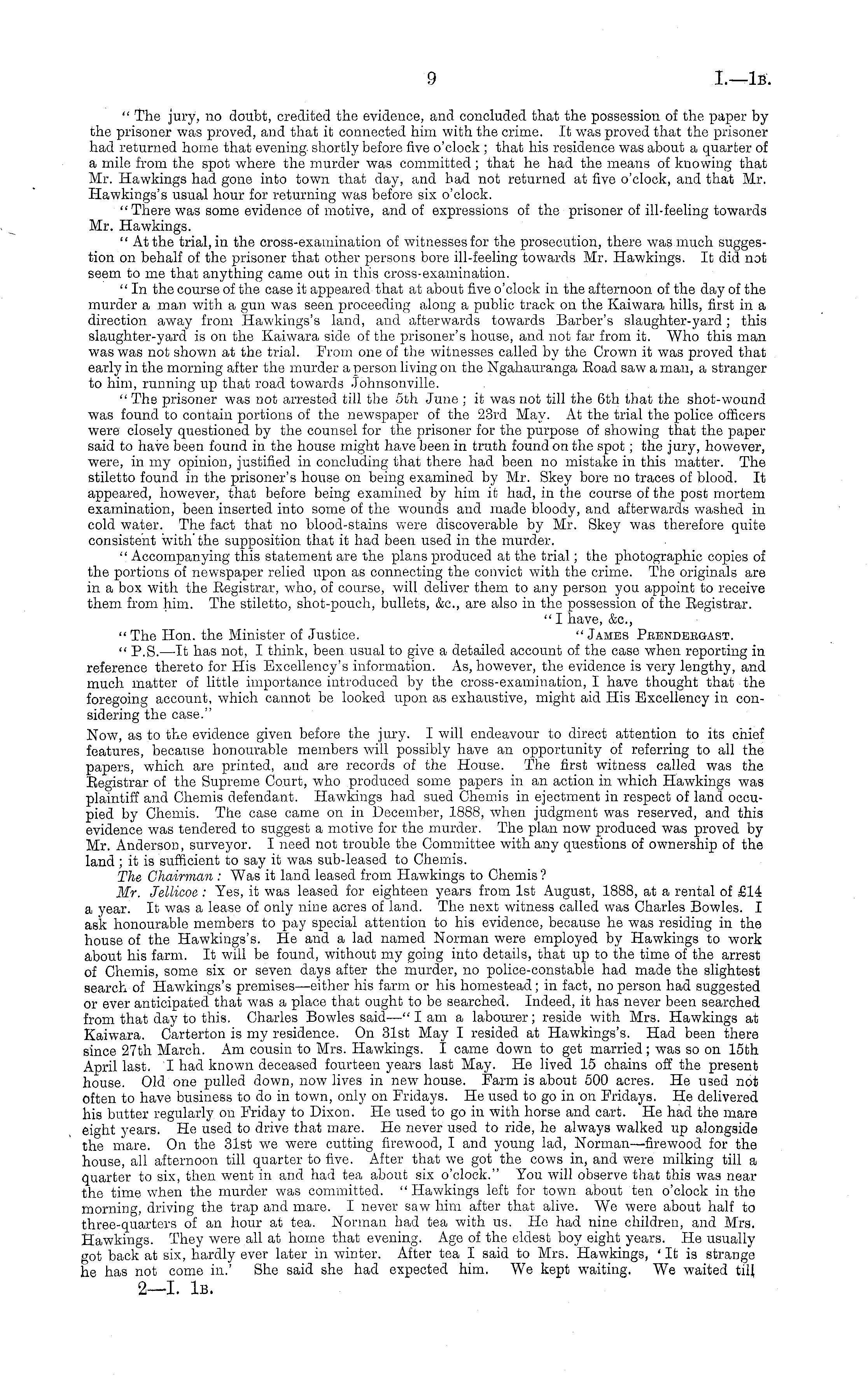 " The jury, no doubt, credited the evidence, and concluded that the possession of the paper by the prisoner was proved, and that it connected him with the crime. It was proved that the prisoner had returned home that evening, shortly before five o'clock ; that his residence was about a quarter of a mile from the spot where the murder was committed ; that he had the means of knowing that Mr. Hawkings had gone into town that day, and had not returned at five o'clock, and that Mr. Hawkings's usual hour for returning was before six o'clock. " There was some evidence of motive, and of expressions of the prisoner of ill-feeling towards Mr. Hawkings. " At the trial, in the cross-examination of witnesses for the prosecution, there was much suggestion on behalf of the prisoner that other persons bore ill-feeling towards Mr. Hawkings. It did not seem to me that anything came out in this cross-examination. " In the course of the case it appeared that at about five o'clock in the afternoon of the day of the murder a man with a gun was seen proceeding along a public track on the Kaiwara hills, first in a direction away from Hawkings's land, and afterwards towards Barber's slaughter-yard; this slaughter-yard is on the Kaiwara side of the prisoner's house, and not far from it. Who this man was was not shown at the trial. From one of the witnesses called by the Crown it was proved that early in the morning after the murder a person living on the Ngahauranga Eoad saw a man, a stranger to him, running up that road towards Johnsonville. " The prisoner was not arrested till the sth June ; it was not till the 6th that the shot-wound was found to contain portions of the newspaper of the 23rd May. At the trial the police officers were closely questioned by the counsel for the prisoner for the purpose of showing that the paper said to have been found in the house might have been in truth found on the spot; the jury, however, were, in my opinion, justified in concluding that there had been no mistake in this matter. The stiletto found in the prisoner's house on being examined by Mr. Skey bore no traces of blood. It appeared, however, that before being examined by him it had, in the course of the post mortem examination, been inserted into some of the wounds and made bloody, and afterwards washed in cold water. The fact that no blood-stains were discoverable by Mr. Skey was therefore quite consistent with' the supposition that it had been used in the murder. " Accompanying this statement are the plans produced at the trial; the photographic copies of the portions of newspaper relied upon as connecting the convict with the crime. The originals are in a box with the Eegistrar, who, of course, will deliver them to any person you appoint to receive them from him. The stiletto, shot-pouch, bullets, &c, are also in the possession of the Eegistrar. " I have, &c, "The Hon. the Minister of Justice. "Jambs Pbendeegast. " P.S. —It has not, I think, been usual to give a detailed account of the case when reporting in reference thereto for His Excellency's information. As, however, the evidence is very lengthy, and much matter of little importance introduced by the cross-examination, I have thought that the foregoing account, which cannot be looked upon as exhaustive, might aid His Excellency in considering the case." Now, as to the evidence given before the jury. I will endeavour to direct attention to its chief features, because honourable members will possibly have an opportunity of referring to all the papers, which are printed, and are records of the House. The first witness called was the Eegistrar of the Supreme Court, who produced some papers in an action in which Hawkings was plaintiff and Chemis defendant. Hawkings had sued Chemis in ejectment in respect of land occupied by Chemis. The case came on in December, 1888, when judgment was reserved, and this evidence was tendered to suggest a motive for the murder. The plan now produced was proved by Mr. Anderson, surveyor. I need not trouble the Committee with any questions of ownership of the land; it is sufficient to say it was sub-leased to Chemis. The Chairman : Was it land leased from Hawkings to Chemis ? Mr. Jellicoe: Yes, it was leased for eighteen years from. Ist August, 1888, at a rental of £14 a year. It was a lease of only nine acres of land. The next witness called was Charles Bowles. I ask honourable members to pay special attention to his evidence, because he was residing in the house of the Hawkings's. He and a lad named Norman were employed by Hawkings to work about his farm. It will be found, without my going into details, that up to the time of the arrest of Chemis, some six or seven days after the murder, no police-constable had made the slightest search of Hawkings's premises—either his farm or his homestead; in fact, no person had suggested or ever anticipated that was a place that ought to be searched. Indeed, it has never been searched from that day to this. Charles Bowles said—"lam a labourer; reside with Mrs. Hawkings at Kaiwara. Carterton is my residence. On 31st May I resided at Hawkings's. Had been there since 27th March. Am cousin to Mrs. Hawkings. I came down to get married ; was so on 15th April last. I had known deceased fourteen years last May. He lived 15 chains off the present house. Old one pulled down, now lives in new house. Farm is about 500 acres. He used not often to have business to do in town, only on Fridays. He used to go in on Fridays. He delivered his butter regularly on Friday to Dixon. He used to go in with horse and cart. He had the mare eight years. He used to drive that mare. He never used to ride, he always walked up alongside the mare. On the 31st we were cutting firewood, I and young lad, Norman —'firewood for the house, all afternoon till quarter to five. After that we got the cows in, and were milking till a quarter to six, then went in and had tea about six o'clock." You will observe that this was near th