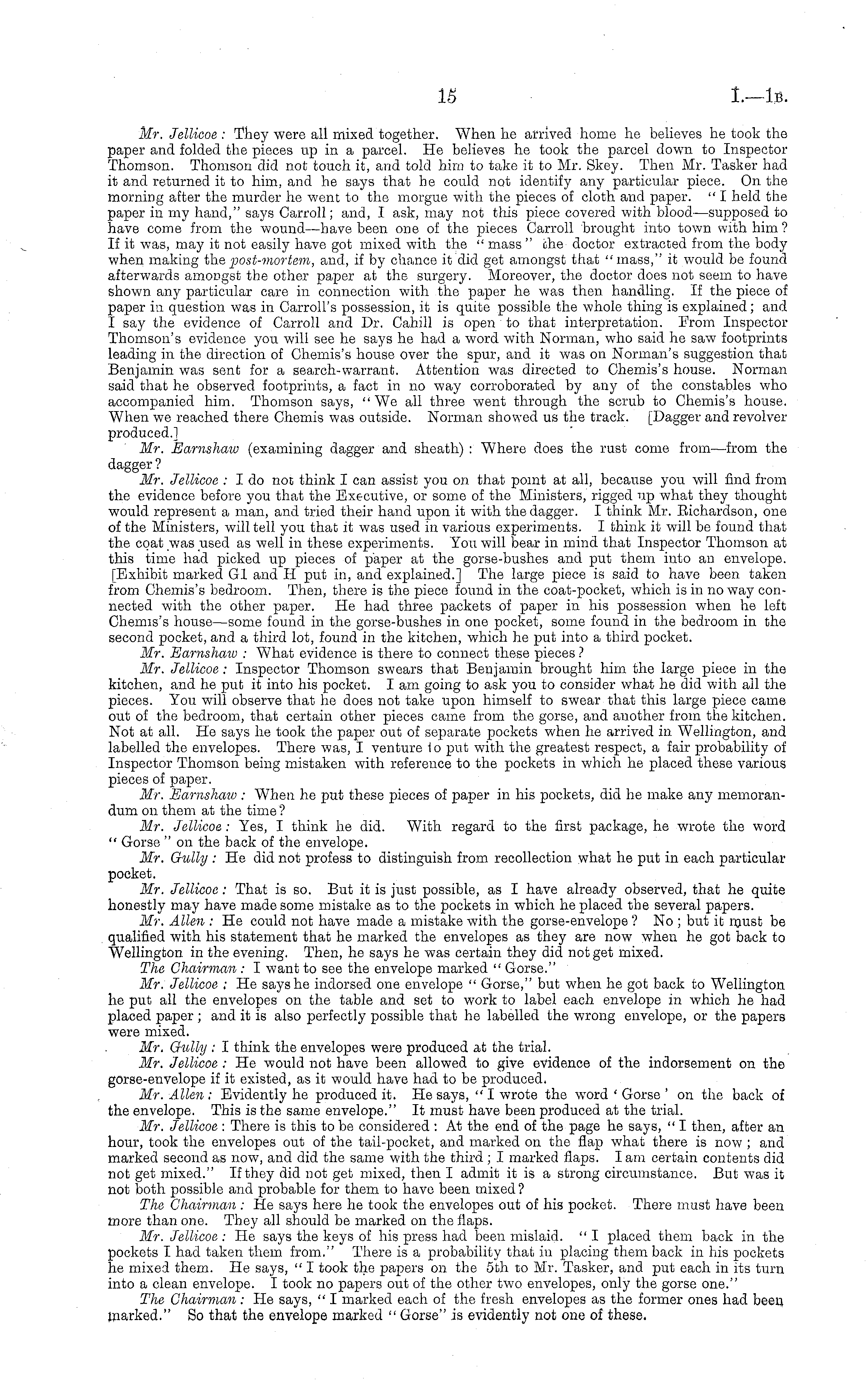 Mr. Jellicoe : They were ali mixed together. When he arrived home he believes he took the paper and folded the pieces up in a parcel. He believes he took the parcel down to Inspector Thomson. Thomson did not touch it, and told him to take it to Mr. Skey. Then Mr. Tasker had it and returned it to him, and he says that he could not identify any particular piece. On the morning after the murder he went to the morgue with the pieces of cloth and paper. " I held the paper in my hand," says Carroll; and, I ask, may not this piece covered with blood—supposed to have come from the wound—have been one of the pieces Carroll brought into town with him ? If it was, may it not easily have got mixed with the " mass " the doctor extracted from the body when making the post-mortem, and, if by chance it did get amongst that "mass," it would be found, afterwards amongst the other paper at the surgery. Moreover, the doctor does not seem to have shown any particular care in connection with the paper he was then handling. If the piece of paper in question was in Carroll's possession, it is quite possible the whole thing is explained; and I say the evidence of Carroll and Dr. Cahill is open to that interpretation. From Inspector Thomson's evidence you will see he says he had a word with Norman, who said he saw footprints leading in the direction of Chemis's house over the spur, and it was on Norman's suggestion that Benjamin was sent for a search-warrant. Attention was directed to Chemis's house. Norman said that he observed footprints, a fact in no way corroborated by any of the constables who accompanied him. Thomson says, "We all three went through the scrub to Chemis's house. When we reached there Chemis was outside. Norman showed us the track. [Dagger and revolver produced.] Mr. Earnshaiu (examining dagger and sheath) : Where does the rust come from—from the dagger ? Mr. Jellicoe : I do not think I can assist you on that point at all, because you will find from the evidence before you that the Executive, or some of the Ministers, rigged up what they thought would represent a man, and tried their hand upon it with the dagger. I think Mr. Eichardson, one of the Ministers, will tell you that it was used in various experiments. I think it will be found that the coat was used as well in these experiments. You will bear in mind that Inspector Thomson at this time had picked up pieces of paper at the gorse-bushes and put them into an envelope. [Exhibit marked Gl and H put in, and explained.] The large piece is said to have been taken from Chemis's bedroom. Then, there is the piece found in the coat-pocket, which is in noway connected with the other paper. He had three packets of paper in his possession when he left Chemis's house—some found in the gorse-bushes in one pocket, some found in the bedroom in the second pocket, and a third lot, found in the kitchen, which he put into a third pocket. Mr. Earnshaw : W T hat evidence is there to connect these pieces ? Mr. Jellicoe : Inspector Thomson swears that Benjamin brought him the large piece in the kitchen, and he put it into his pocket. lam going to ask you to consider what he did with ail the pieces. You will observe that he does not take upon himself to swear that this large piece came out of the bedroom, that certain other pieces came from the gorse, and another from the kitchen. Not at all. He says he took the paper out of separate pockets when he arrived in Wellington, and labelled the envelopes. There was, I venture 1o put with the greatest respect, a fair probability of Inspector Thomson being mistaken with reference to the pockets in which he placed these various pieces of paper. Mr. Earnshaio : When he put these pieces of paper in his pockets, did he make any memorandum on them at the time ? Mr. Jellicoe: Yes, I think he did. With regard to the first package, he wrote the word " Gorse " on the back of the envelope. Mr. Gully : He did not profess to distinguish from recollection what he put in each particular pocket. Mr. Jellicoe: That is so. But it is just possible, as I have already observed, that he quite honestly may have made some mistake as to the pockets in which he placed the several papers. Mr. Allen : He could not have made a mistake with the gorse-envelope ? No ; but it must be qualified with his statement that he marked the envelopes as they are now when he got back to Wellington in the evening. Then, he says he was certain they did not get mixed. The Chairman : I want to see the envelope marked " Gorse." Mr. Jellicoe ; He says he indorsed one envelope " Gorse," but when he got back to Wellington he put all the envelopes on the table and set to work to label each envelope in which he had placed paper ; and it is also perfectly possible that he labelled the wrong envelope, or the papers were mixed. Mr. Gully : I think the envelopes were produced at the trial. Mr. Jellicoe : He would not have been allowed to give evidence of the indorsement on the gorse-envelope if it existed, as it would have had to be produced. Mr. Allen; Evidently he produced it. He says, " I wrote the word ' Gorse 'on the back of the envelope. This is the same envelope." It must have been produced at the trial. Mr. Jellicoe : There is this to be considered : At the end of the page he says, " I then, after an hour, took the envelopes out of the tail-pocket, and marked on the flap what there is now ; and marked second as now, and did the same with the third ; I marked flaps. lam certain contents did not get mixed." If they did not get mixed, then I admit it is a strong circumstance. But was it not both possible and probable for them to have been mixed ? The Chairman : He says here he took the envelopes out of his pocket. There must have been more than one. They all should be marked on the flaps. Mr. Jellicoe: He says the keys of his press had been mislaid. "I placed them back in the pockets I had taken them from." There is a probability that in placing them back in hi