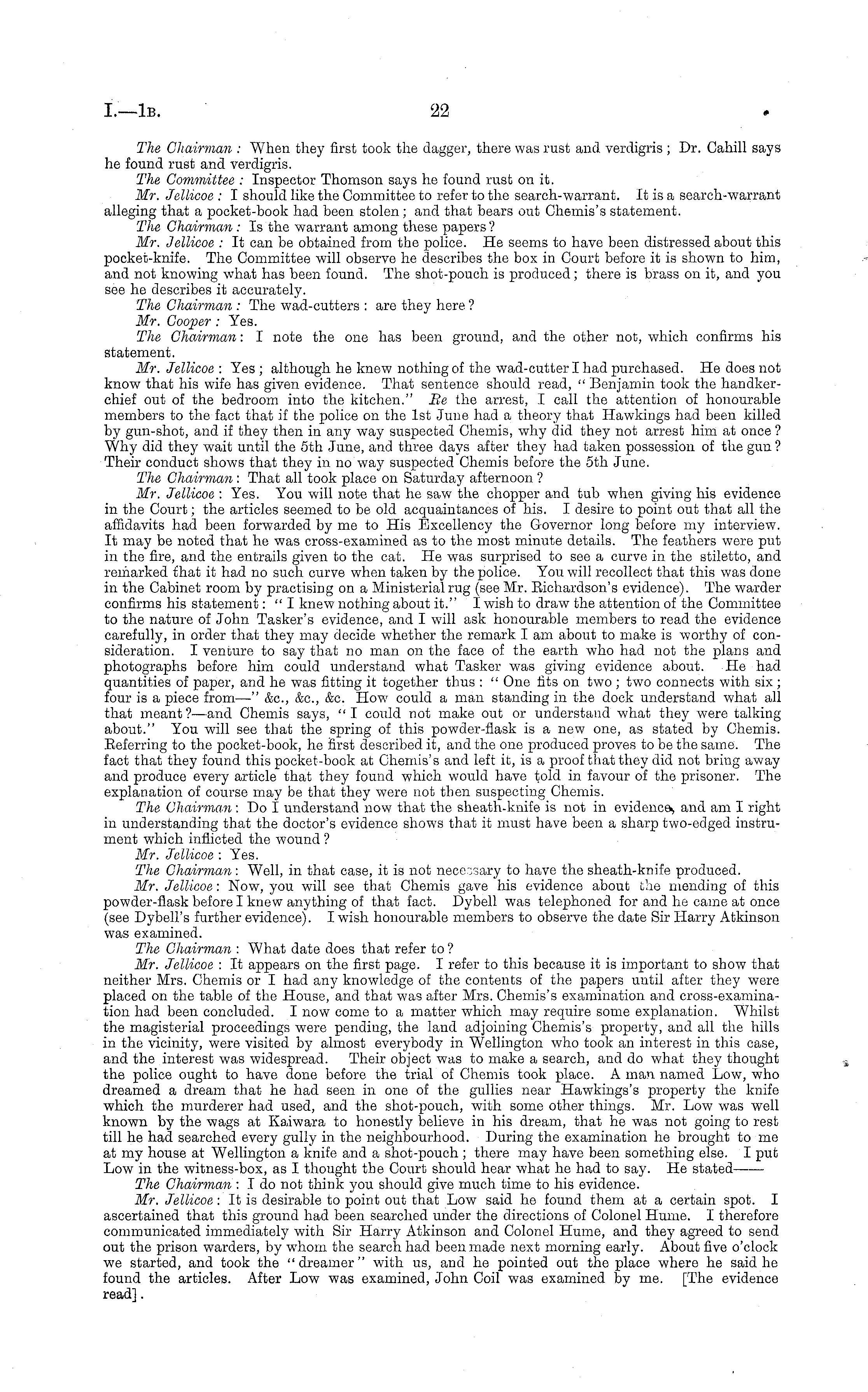 The Chairman : When they first took the dagger, there was rust and verdigris ; Dr. Cahill says he found rust and verdigris. The Committee : Inspector Thomson says he found rust on it. Mr. Jellicoe : I should like the Committee to refer to the search-warrant. It is a search-warrant alleging that a pocket-book had been stolen; and that bears out Chemis's statement. The Chairman : Is the warrant among these papers ? Mr. Jellicoe : It can be obtained from the police. He seems to have been distressed about this pocket-knife. The Committee will observe he describes the box in Court before it is shown to him, and not knowing what has been found. Tho shot-pouch is produced; there is brass on it, and you sec he describes it accurately. The Chairman : The wad-cutters : are they here ? Mr. Cooper : Yes. The Chairman : I note the one has been ground, and the other not, which confirms his statement. Mr. Jellicoe : Yes; although he knew nothing of the wad-cutter I had purchased. He does not know that his wife has given evidence. That sentence should read, " Benjamin took the handkerchief out of the bedroom into the kitchen." Be the arrest, I call the attention of honourable members to the fact that if the police on the Ist June had a theory that Hawkings had been killed by gun-shot, and if they then in any way suspected Chemis, why did they not arrest him at once ? Why did they wait until the sth June, and three days after they had taken possession of the gun ? Their conduct shows that they in no way suspected Chemis before the sth June. The Chairman : That all took place on Saturday afternoon ? Mr. Jellicoe : Yes. You will note that he saw the chopper and tub when giving his evidence in the Court; the articles seemed to be old acquaintances of his. I desire to point out that all the affidavits had been forwarded by me to His Excellency the Governor long before my interview. It may be noted that he was cross-examined as to the most minute details. The feathers were put in the fire, and the entrails given to the cat. He was surprised to see a curve in the stiletto, and remarked fhat it had no such curve when taken by the police. You will recollect that this was done in the Cabinet room by practising on a Ministerial rug (see Mr. Eichardson's evidence). The warder confirms his statement: " I knew nothing about it." I wish to draw the attention of the Committee to the nature of John Tasker's evidence, and I will ask honourable members to read the evidence carefully, in order that they may decide whether the remark I am about to make is worthy of consideration. I venture to say that no man on the face of the earth who had not the plans and photographs before him could understand what Tasker was giving evidence about. He had quantities of paper, and he was fitting it together thus : " One fits on two ; two connects with six ; four is a piece from—" &c, &c, &c. How could a man standing in the dock understand what all that meant? —and Chemis says, "I could not make out or understand what they were talking about." You will see that the spring of this powder-flask is a new one, as stated by Chemis. Eeferring to the pocket-book, he first described it, and the one produced proves to be the same. The fact that they found this pocket-book at Chemis's and left it, is a proof that they did not bring away and produce every article that they found which would have told in favour of the prisoner. The explanation of course may be that they were not then suspecting Chemis. The Chairman : Do I understand now that the sheath-knife is not in and am I right in understanding that the doctor's evidence shows that it must have been a sharp two-edged instrument which inflicted the wound ? Mr. Jellicoe : Yes. The Chairman : Well, in that case, it is not necessary to havo the sheath-knife produced. Mr. Jellicoe : Now, you will see that Chemis gave his evidence about Che mending of this powder-flask before I knew anything of that fact. Dybell was telephoned for and ho came at once (see Dybell's further evidence). I wish honourable members to observe the date Sir Harry Atkinson was examined. The Chairman : What date does that refer to ? Mr. Jellicoe :It appears on the first page. I refer to this because it is important to show that neither Mrs. Chemis or I had any knowledge of the contents of the papers until after they were placed on the table of the House, and that was after Mrs. Chemis's examination and cross-examina-tion had been concluded. I now come to a matter which may require some explanation. Whilst the magisterial proceedings were pending, the land adjoining Chemis's property, and all the hills in the vicinity, were visited by almost everybody in Wellington who took an interest in this case, and the interest was widespread. Their object was to make a search, and do what they thought the police ought to have done before the trial of Chemis took place. A man named Low, who dreamed a dream that he had seen in one of the gullies near Hawkings's property the knife which the murderer had used, and the shot-pouch, with some other things. Mr. Low was well known by the wags at Kaiwara to honestly believe in his dream, that he was not going to rest till he had. searched every gully in the neighbourhood. During the examination he brought to me at my house at Wellington a knife and a shot-pouch ; there may have been something else. I put Low in the witness-box, as I thought the Court should hear what he had to say. He stated The Chairman : I do not think you should give much time to his evidence. Mr. Jellicoe :It is desirable to point out that Low said he found them at a certain spot. I ascertained that this ground had been searched under the directions of Colonel Hume. I therefore communicated immediately with Sir Harry Atkinson and Colonel Hume, and they agreed to send out the prison warders, by whom the search had been made next morning early. About five o'clock we started, and took the "dreamer" with us, and he pointed out th