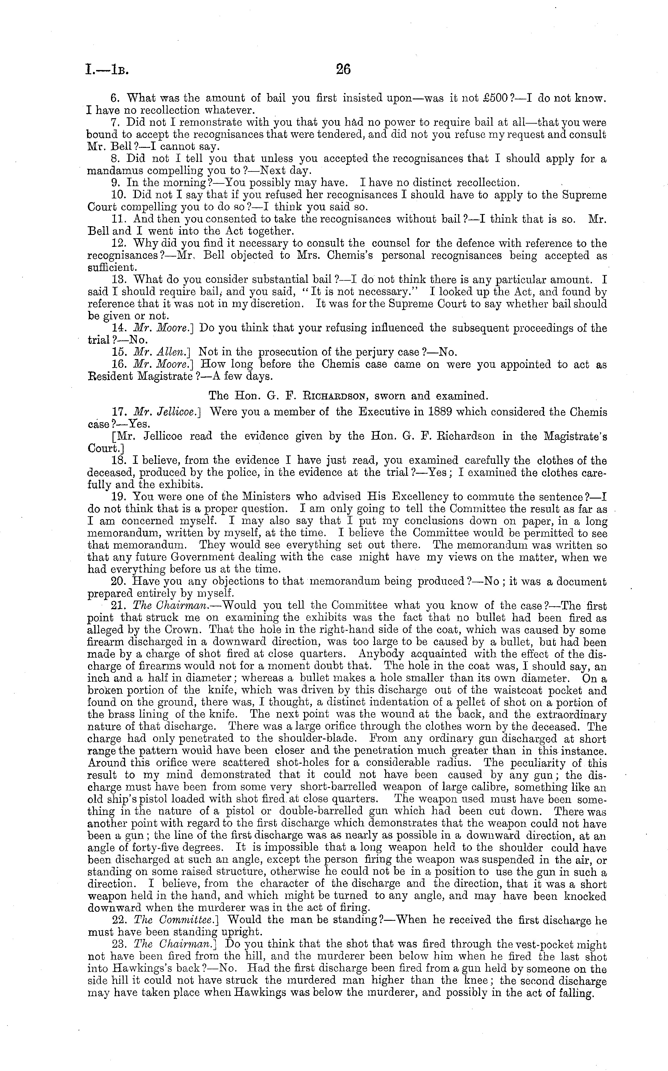 6. What was the amount of bail you first insisted upon—was it not £500 ?—I do not know. I have no recollection whatever. 7. Did not I remonstrate with you that you had no power to require bail at all—that you were bound to accept the recognisances that were tendered, and did not you refuse my request and consult Mr. Bell ?—I cannot say. 8. Did not I tell you that unless you accepted the recognisances that I should apply for a mandamus compelling you to ? —Next day. 9. In the morning?— You possibly may have. I have no distinct recollection. 10. Did not I say that if you refused her recognisances I should have to apply to the Supreme Court compelling you to do so ?—I think you said so. 11. And then you consented to take the recognisances without bail? —I think that is so. Mr. Bell and I went into the Act together. 12. Why did you find it necessary to consult the counsel for the defence with reference to the recognisances? —Mr. Bell objected to Mrs. Chemis's personal recognisances being accepted as sufficient. 13. What do you consider substantial bail ?—I do not think there is any particular amount. I said I should require bail, and you said, "It is not necessary." I looked up the Act, and found by reference that it was not in my discretion. It was for the Supreme Court to say whether bail should be given or not. 14. Mr. Moore.] Do you think that your refusing influenced the subsequent proceedings of the trial?— No. 15. Mr. Allen.] Not in the prosecution of the perjury case ? —No. 16. Mr. Moore.] How long before the Chemis case came on were you appointed to act as Eesident Magistrate ?—A few days. The Hon. G. F. Bichabdson, sworn and examined. 17. Mr. Jellicoe.] Were you a member of the Executive in 1889 which considered the Chemis case ?—Yes. [Mr. Jellicoe read the evidence given by the Hon. G. F. Eichardson in the Magistrate's Court.] 18. I believe, from the evidence I have just read, you examined carefully the clothes of the deceased, produced by the police, in the evidence at the trial ?—Yes; I examined the clothes carefully and the exhibits. 19. You were one of the Ministers who advised His Excellency to commute the sentence?—l do not think that is a proper question. lam only going to tell the Committee the result as far as I am concerned myself. I may also say that I put my conclusions down on paper, in a long memorandum, written by myself, at the time. I believe the Committee would be permitted to see that memorandum. They would see everything set out there. The memorandum was written so that any future Government dealing with the case might have my views on the matter, when we had everything before us at the time. 20. Have you any objections to that memorandum being produced ?—No ; it was a document prepared entirely by myself. 21. The Chairman. —Would you tell the Committee what you know of the case?— The first point that struck me on examining the exhibits was the fact that no bullet had been fired as alleged by the Crown. That the hole in the right-hand side of the coat, which was caused by some firearm discharged in a downward direction, was too large to be caused by a bullet, but had been made by a charge of shot fired at close quarters. Anybody acquainted with the effect of the discharge of firearms would not for a moment doubt that. The hole in the coat was, I should say, an inch and a half in diameter; whereas a bullet makes a hole smaller than its own diameter. On a broken portion of the knife, which was driven by this discharge out of the waistcoat pocket and found on the ground, there was, I thought, a distinct indentation of a pellet of shot on a portion of the brass lining of the knife. The next point was the wound at the back, and the extraordinary nature of that discharge. There was a large orifice through the clothes worn by the deceased. The charge had only penetrated to the shoulder-blade. From any ordinary gun discharged at short range the pattern would have been closer and the penetration much greater than in this instance. Around this orifice were scattered shot-holes for a considerable radius. The peculiarity of this result to my mind demonstrated that it could not have been caused by any gun; the discharge must have been from some very short-barrelled weapon of large calibre, something like an old ship's pistol loaded with shot fired at close quarters. The weapon used must have been something in the nature of a pistol or double-barrelled gun which had been cut down. There was another point with regard to the first discharge which demonstrates that the weapon could not have been a gun ; the line of the first discharge was as nearly as possible in a downward direction, at an angle of forty-five degrees. It is impossible that a long weapon held to the shoulder could have been discharged at such an angle, except the person firing the weapon was suspended in the air, or standing on some raised structure, otherwise he could not be in a position to use the gun in such a direction. I believe, from the character of the discharge and the direction, that it was a short weapon held in the hand, and which might be turned to any angle, and may have been knocked downward when the murderer was in the act of firing. 22. The Committee.] Would the man be standing?'—When he received the first discharge he must have been standing upright. 23. The Chairman.] Do you think that the shot that was fired through the vest-pocket might not have been fired from the hill, and the murderer been below him when he fired the last shot into Hawkings's back ?—No. Had the first discharge been fired from a gun held by someone on the side hill it could not have struck the murdered man higher than the knee; the second discharge may have taken place when Hawkings was below the murderer, and possibly in the act of falling.