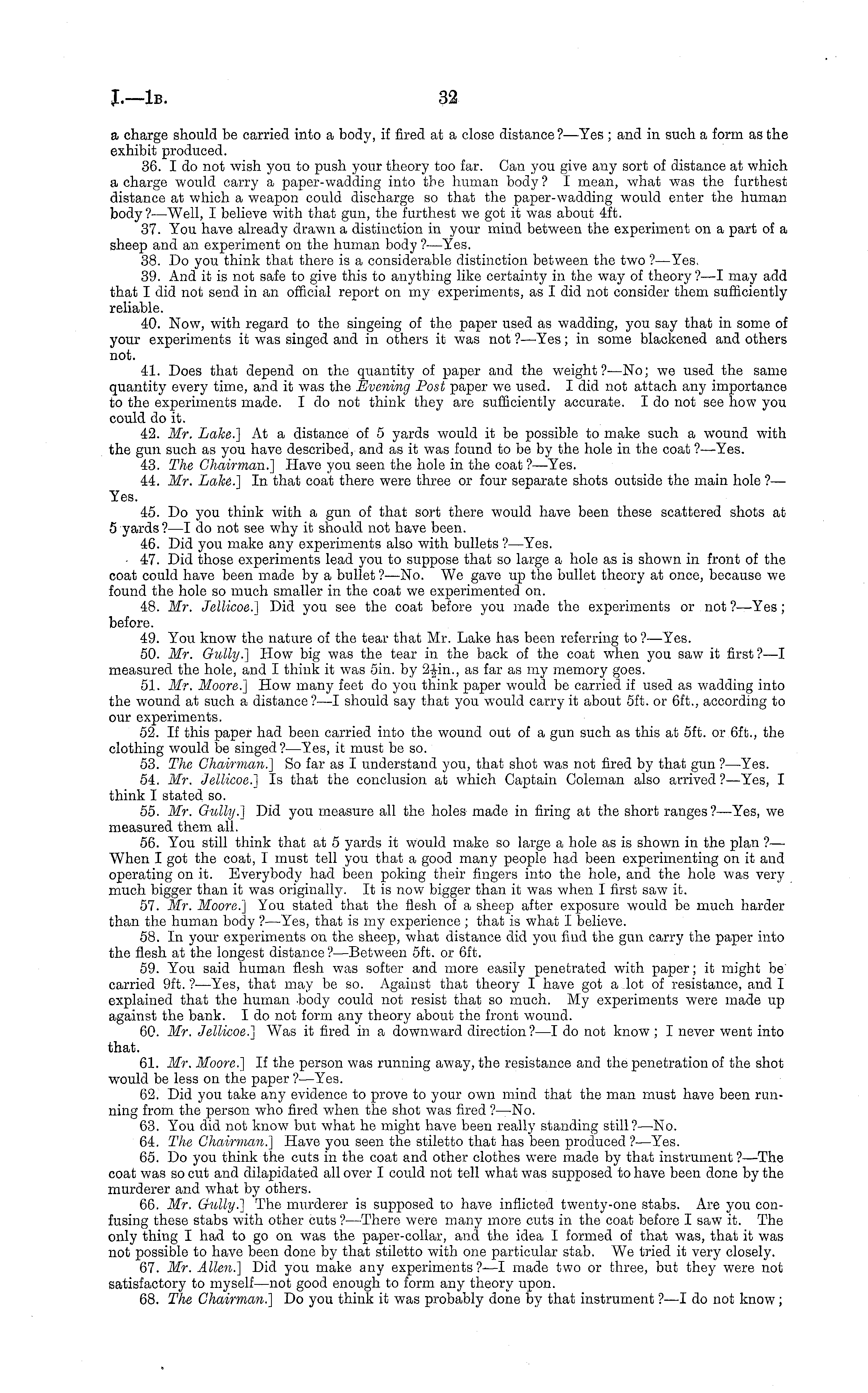 a charge should be carried into a body, if fired at a close distance? —Yes ; and in such a form as the exhibit produced. 36. Ido not wish you to push your theory too far. Can you give any sort of distance at which a charge would carry a paper-wadding into the human body? I mean, what was the furthest distance at which a weapon could discharge so that the paper-wadding would enter the human body?— Well, I believe with that gun, the furthest we got it was about 4ft. 37. You have already drawn a distinction in your mind between the experiment on a part of a sheep and an experiment on the human body ? —Yes. 38. Do you think that there is a considerable distinction between the two ?—Yes. 39. And it is not safe to give this to anything like certainty in the way of theory ?—I may add that I did not send in an official report on my experiments, as I did not consider them sufficiently reliable. 40. Now, with regard to the singeing of the paper used as wadding, you say that in some of your experiments it was singed and in others it was not ?—Yes; in some blackened and others not. 41. Does that depend on the quantity of paper and the weight? —No; we used the same quantity every time, and it was the Evening Post paper we used. I did not attach any importance to the experiments made. I do not think they are sufficiently accurate. Ido not see how you could do it. 42. Mr. Lake.] At a distance of 5 yards would it be possible to make such a wound with the gun such as you have described, and as it was found to be by the hole in the coat ?—Yes. 43. The Chairman.] Have you seen the hole in the coat ?—Yes. 44. Mr. Lake.] In that coat there were three or four separate shots outside the main hole ?—■ Yes. 45. Do you think with a gun of that sort there would have been these scattered shots at 5 yards? —I do not see why it should not have been. 46. Did you make any experiments also with bullets ?—Yes. ■ 47. Did those experiments lead you to suppose that so large a hole as is shown in front of the coat could have been made by a bullet ? —No. We gave up the bullet theory at once, because we found the hole so much smaller in the coat we experimented on. 48. Mr. Jellicoe.] Did you see the coat before you made the experiments or not ?—Yes; before. 49. You know the nature of the tear that Mr. Lake has been referring to ? —Yes. 50. Mr. Gully.] How big was the tear in the back of the coat when you saw it first?—l measured the hole, and I think it was sin. by 2-Jin., as far as my memory goes. 51. Mr. Moore.] How many feet do you think paper would be carried if used as wadding into the wound at such a distance ?—I should say that you would carry it about sft. or 6ft., according to our experiments. 52. If this paper had been carried into the wound out of a gun such as this at sft. or 6ft., the clothing would be singed ?—Yes, it must be so. 53. The Chairman.] So far as I understand you, that shot was not fired by that gun ? —Yes. 54. Mr. Jellicoe.] Is that the conclusion at which Captain Coleman also arrived ?—Yes, I think I stated so. 55. Mr. Gully.] Did you measure all the holes made in firing at the short ranges?— Yes, we measured them all. 56. You still think that at 5 yards it would make so large a hole as is shown in the plan ?— When I got the coat, I must tell you that a good many people had been experimenting on it and operating on it. Everybody had been poking their fingers into the hole, and the hole was very much bigger than it was originally. It is now bigger than it was when I first saw it. 57. Mr. Moore.] You stated that the flesh of a sheep after exposure would be much harder than the human body ?—Yes, that is my experience ; that is what I believe. 58. In your experiments on the sheep, what distance did you find the gun carry the paper into the flesh at the longest distance ?—Between sft. or 6ft. 59. You said human flesh was softer and more easily penetrated with paper; it might be carried 9ft. ?—Yes, that may be so. Against that theory I have got a lot of resistance, and I explained that the human body could not resist that so much. My experiments were made up against the bank. Ido not form any theory about the front wound. 60. Mr. Jellicoe.] Was it fired in a downward direction?—l do not know ; I never went into that. 61. Mr. Moore] If the person was running away, the resistance and the penetration of the shot would be less on the paper ?—Yes. 62. Did you take any evidence to prove to your own mind that the man must have been running from the person who fired when the shot was fired ?—No. 63. You did not know but what he might have been really standing still?— No. 64. The Chairman.] Have you seen the stiletto that has been produced ?—Yes. 65. Do you think the cuts in the coat and other clothes were made by that instrument ?—The coat was so cut and dilapidated all over I could not tell what was supposed to have been done by the murderer and what by others. 66. Mr. Gully.] The murderer is supposed to have inflicted twenty-one stabs. Are you confusing these stabs with other cuts ?—There were many more cuts in the coat before I saw it. The only thing I had to go on was the paper-collar, and the idea I formed of that was, that it was not possible to have been done by that stiletto with one particular stab. We tried it very closely. 67. Mr. Allen.] Did you make any experiments?—l made two or three, but they were not satisfactory to myself—not good enough to form any theory upon. 68. The Chairman.] Do you think it was probably done by that instrument ?—I do not know;
