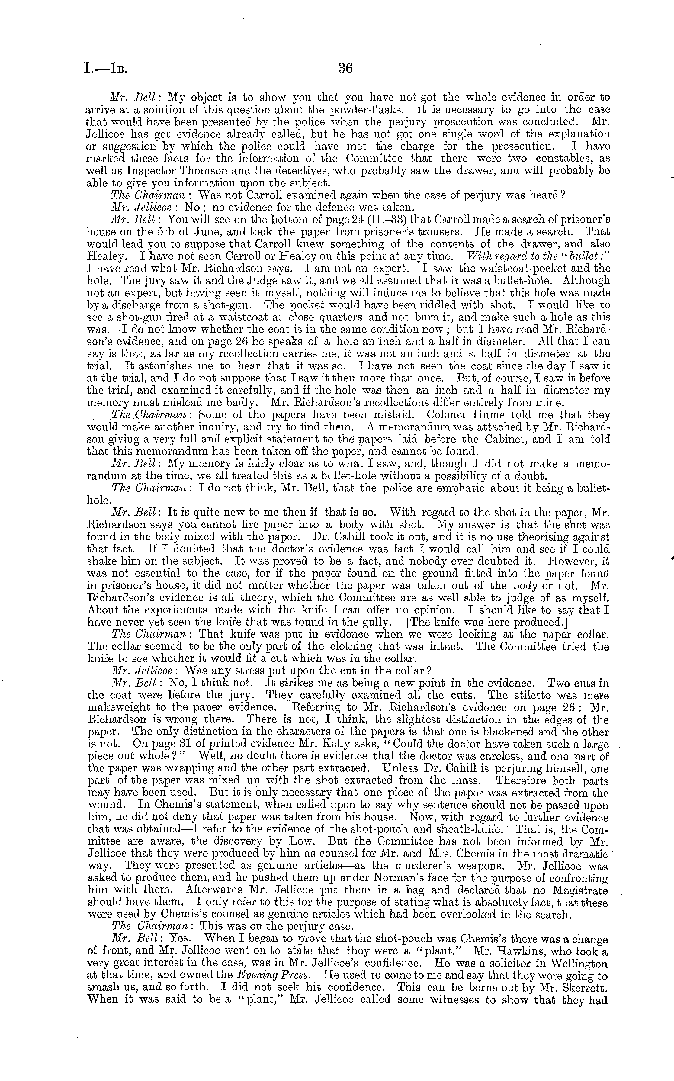 Mr. Bell: My object is to show you that you have not got the whole evidence in order to arrive at a solution of this question about the powder-flasks. It is necessary to go into the case that would have been presented by the police when the perjury prosecution was concluded. Mr. Jellicoe has got evidence already called, but he has not goo one single word of the explanation or suggestion by which the police could have met the charge for the prosecution. I have marked these facts for the information of the Committee that there were two constables, as well as Inspector Thomson and the detectives, who probably saw the drawer, and will probably be able to give you information upon the subject. The Chairman : Was not Carroll examined again when the case of perjury was heard ? Mr. Jellicoe : No ; no evidence for the defence was taken. Mr. Bell : You will see on the bottom of page 24 (H.-33) that Carroll made a search of prisoner's house on the sth of June, and took the paper from prisoner's trousers. He made a search. That would lead you to suppose that Carroll knew something of the contents of the drawer, and also Healey. I have not seen Carroll or Healey on this point at any time. With regard to the "bullet;" I have read what Mr. Eichardson says. lam not an expert. I saw the waistcoat-pocket and the hole. The jury saw it and the Judge saw it, and we all assumed that it was a bullet-hole. Although not an expert, but having seen it myself, nothing will induce me to believe that this hole was made by a discharge from a shot-gun. The pocket would have been riddled with shot. I would like to see a shot-gun fired at a waistcoat at close quarters and not burn it, and make such a hole as this was. Ido not know whether the coat is in the same condition now ; but I have read Mr. Bichardson's evidence, and on page 26 he speaks of a hole an inch and a half in diameter. All that I can say is that, as far as my recollection carries me, it was not an inch and a half in diameter at the trial. It astonishes me to hear that it was so. I have not seen the coat since the day I saw it at the trial, and Ido not suppose that I saw it then more than once. But, of course, I saw it before the trial, and examined it carefully, and if the hole was then an inch and a half in diameter my memory must mislead me badly. Mr. Eichardson's recollections differ entirely from mine. .The .Chairman : Some of the papers have been mislaid. Colonel Hume told me that they would make another inquiry, and try to find them. A memorandum was attached by Mr. Eichardson giving a very full and explicit statement to the papers laid before the Cabinet, and I am told that this memorandum has been taken off the paper, and cannot be found. Mr. Bell : My memory is fairly clear as to what I saw, and, though I did not make a memorandum at the time, we all treated this as a bullet-hole without a possibility of a doubt. The Chairman : I do not think, Mr. Bell, that the police are emphatic about it being a bullethole. Mr. Bell : It is quite new to me then if that is so. With regard to the shot in the paper, Mr. Eichardson says you cannot fire paper into a body with shot. My answer is that the shot was found in the body mixed with the paper. Dr. Cahill took it out, and it is no use theorising against that fact. If I doubted that the doctor's evidence was fact I would call him and see if I could shake him on the subject. It was proved to be a fact, and nobody ever doubted it. However, it was not essential to the case, for if the paper found on the ground fitted into the paper found in prisoner's house, it did not matter whether the paper was taken out of the body or not. Mr. Eichardson's evidence is all theory, which the Committee are as well able to judge of as myself. About the experiments made with the knife I can offer no opinion. I should like to say that I have never yet seen the knife that was found in the gully. [The knife was here produced.] The Chairman: That knife was put in evidence when we were looking at the paper collar. The collar seemed to be the only part of the clothing that was intact. The Committee tried the knife to see whether it would fit a cut which was in the collar. Mr. Jellicoe : Was any stress put upon the cut in the collar ? Mr. Bell : No, I think not. It strikes me as being a new point in the evidence. Two cuts in the coat were before the jury. They carefully examined all the cuts. The stiletto was mere makeweight to the paper evidence. Eeferring to Mr. Eichardson's evidence on page 26 : Mr. Eichardson is wrong there. There is not, I think, the slightest distinction in the edges of the paper. The only distinction in the characters of the papers is that one is blackened and the other is not. On page 31 of printed evidence Mr. Kelly asks, " Could the doctor have taken such a large piece out whole ? " Well, no doubt there is evidence that the doctor was careless, and one part of the paper was wrapping and the other part extracted. Unless Dr. Cahill is perjuring himself, one part of the paper was mixed up with the shot extracted from the mass. Therefore both parts may have been used. But it is only necessary that one piece of the paper was extracted from the wound. In Chemis's statement, when called upon to say why sentence should not be passed upon him, he did not deny that paper was taken from his house. Now, with regard to further evidence that was obtained—l refer to the evidence of the shot-pouch and sheath-knife. That is, the Committee are aware, the discovery by Low. But the Committee has not been informed by Mr. Jellicoe that they were produced by him as counsel for Mr. and Mrs. Chemis in the most dramatic way. They were presented as genuine articles—as the murderer's weapons. Mr. Jellicoe was asked to produce them, and he pushed them up under Norman's face for the purpose of confronting him with them. Afterwards Mr. Jellicoe put them in a bag and declared that no Magistrate should have them. I only refer to this for