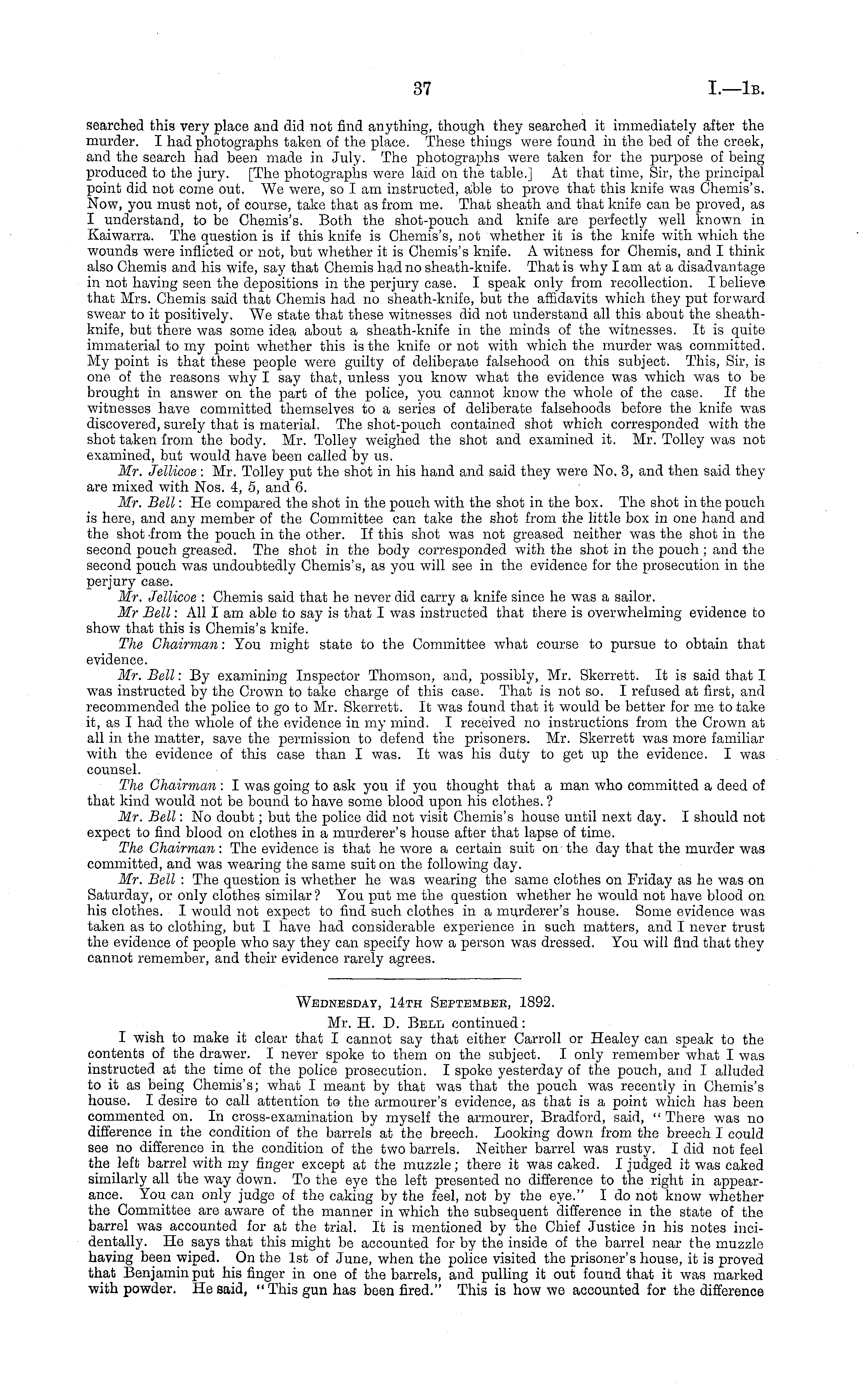 Wednesday, 14th September, 1892. Mr. H. D. Bell continued: I wish to make it clear that I cannot say that either Carroll or Healey can speak to the contents of the drawer. I never spoke to them on the subject. I only remember what I was instructed at the time of the police prosecution. I spoke yesterday of the pouch, and I alluded to it as being Chemis's; what I meant by that was that the pouch was recently in Chemis's house. I desire to call attention to the armourer's evidence, as that is a point which has been commented on. In cross-examination by myself the armourer, Bradford, said, " There was no difference in the condition of the barrels at the breech. Looking down from the breech I could see no difference in the condition of the two barrels. Neither barrel was rusty. I did not feel the left barrel with my finger except at the muzzle; there it was caked. I judged it was caked similarly all the way down. To the eye the left presented no difference to the right in appearance. You can only judge of the caking by the feel, not by the eye." I do not know whether the Committee are aware of the manner in which the subsequent difference in the state of the barrel was accounted for at the trial. It is mentioned by the Chief Justice in his notes incidentally. He says that this might be accounted for by the inside of the barrel near the muzzle having been wiped. On the Ist of June, when the police visited the prisoner's house, it is proved that Benjamin put his finger in one of the barrels, and pulling it out found that it was marked with powder. He said, "This gun has been fired." This is how we accounted for the difference