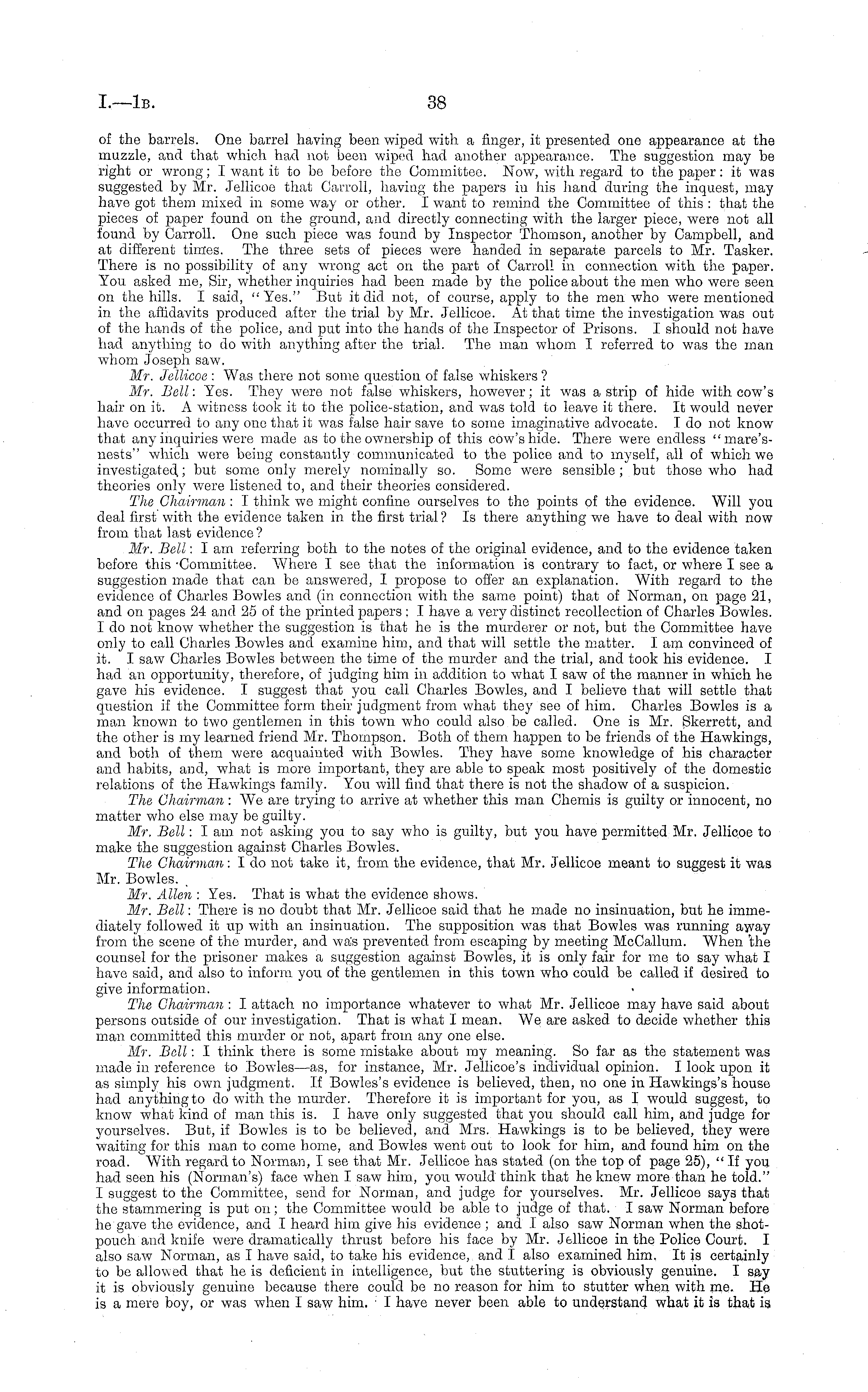 of the barrels. One barrel having been wiped with a finger, it presented one appearance at the muzzle, and that which had not been wiped had another appearance. The suggestion may be right or wrong; I want it to be before the Committee. Now, with regard to the paper: it was suggested by Mr. Jellicoo that Carroll, having the papers in his hand during the inquest, may have got them mixed in some way or other. I want to remind the Committee of this : that the pieces of paper found on the ground, and directly connecting with the larger piece, were not all found by Carroll. One such piece was found by Inspector Thomson, another by Campbell, and at different times. The three sets of pieces were handed in separate parcels to Mr. Tasker. There is no possibility of any wrong act on the part of Carroll in connection with the paper. You asked me, Sir, whether inquiries had been made by the police about the men who were seen on the hills. I said, "Yes." But it did not, of course, apply to the men who were mentioned in the affidavits produced after the trial by Mr. Jellicoe. At that time the investigation was out of the hands of the police, and put into the hands of the Inspector of Prisons. I should not have had anything to do with anything after the trial. The man whom I referred to was the man whom Joseph saw. Mr. Jellicoe : Was there not some question of false whiskers ? Mr. Bell: Yes. They were not false whiskers, however; it was a strip of hide with cow's hair on it. A witness took it to the police-station, and was told to leave it there. It would never have occurred to any one that it was false hair save to some imaginative advocate. Ido not know that any inquiries were made as to the ownership of this cow's hide. There were endless "mare'snests" which were being constantly communicated to the police and to myself, all of which we investigated,; but some only merely nominally so. Some were sensible; but those who had theories only were listened to, and their theories considered. The Chairman : I think we might confine ourselves to the points of the evidence. Will you deal first with the evidence taken in the first trial ? Is there anything we have to deal with now from that last evidence ? Mr. Bell : lam referring both to the notes of the original evidence, and to the evidence taken before this -Committee. Where I see that the information is contrary to fact, or where I see a suggestion made that can bo answered, I propose to offer an explanation. With regard to the evidence of Charles Bowles and (in connection with the same point) that of Norman, on page 21, and on pages 24 and 25 of the printed papers : I have a very distinct recollection of Charles Bowles. I do not know whether the suggestion is that he is the murderer or not, but the Committee have only to call Charles Bowles and examine him, and that will settle the matter. lam convinced of it. I saw Charles Bowles between the time of the murder and the trial, and took his evidence. I had an opportunity, therefore, of judging him in addition to what I saw of the manner in which he gave his evidence. I suggest that you call Charles Bowles, and I believe that will settle that question if the Committee form their judgment from what they see of him. Charles Bowles is a man known to two gentlemen in this town who could also be called. One is Mr. Skerrett, and the other is my learned friend Mr. Thompson. Both of them happen to be friends of the Hawkings, and both of them were acquainted with Bowles. They have some knowledge of his character and habits, and, what is more important, they are able to speak most positively of the domestic relations of the Hawkings family. You will find that there is not the shadow of a suspicion. The Chairman : We are trying to arrive at whether this man Chemis is guilty or innocent, no matter who else may be guilty. Mr. Bell: lam not asking you to say who is guilty, but you have permitted Mr. Jellicoe to make the suggestion against Charles Bowles. The Chairman : Ido not take it, from the evidence, that Mr. Jellicoe meant to suggest it was Mr. Bowles. Mr. Allen : Yes. That is what the evidence shows. Mr. Bell : There is no doubt that Mr. Jellicoe said that he made no insinuation, but he immediately followed it up with an insinuation. The supposition was that Bowles was running away from the scene of the murder, and was prevented from escaping by meeting McCallum. When 'the counsel for the prisoner makes a suggestion against Bowles, it is only fair for me to say what I have said, and also to inform you of the gentlemen in this town who could be called if desired to give information. The Chairman : I attach no importance whatever to what Mr. Jeilicoe may have said about persons outside of our investigation. That is what I mean. We are asked to decide whether this man committed this murder or not, apart from any one else. Mr. Bell: I think there is some mistake about my meaning. So far as the statement was made in reference to Bowles —as, for instance, Mr. Jellicoe's individual opinion. I look upon it as simply his own judgment. If Bowles's evidence is believed, then, no one in Hawkings's house had anything to do with the murder. Therefore it is important for you, as I would suggest, to know what kind of man this is. I have only suggested that you should call him, and judge for yourselves. But, if Bowles is to be believed, and Mrs. Hawkings is to be believed, they were waiting for this man to come home, and Bowles went out to look for him, and found him on the road. With regard to Norman, I see that Mr. Jellicoe has stated (on the top of page 25), "If you had seen his (Norman's) face when I saw him, you would think that he knew more than he told." I suggest to the Committee, send for Norman, and judge for yourselves. Mr. Jellicoe says that the stammering is put on; the Committee would be able to judge of that. I saw Norman before he gave the evidence, and I heard him give his evidence ; and I also saw Norman when th