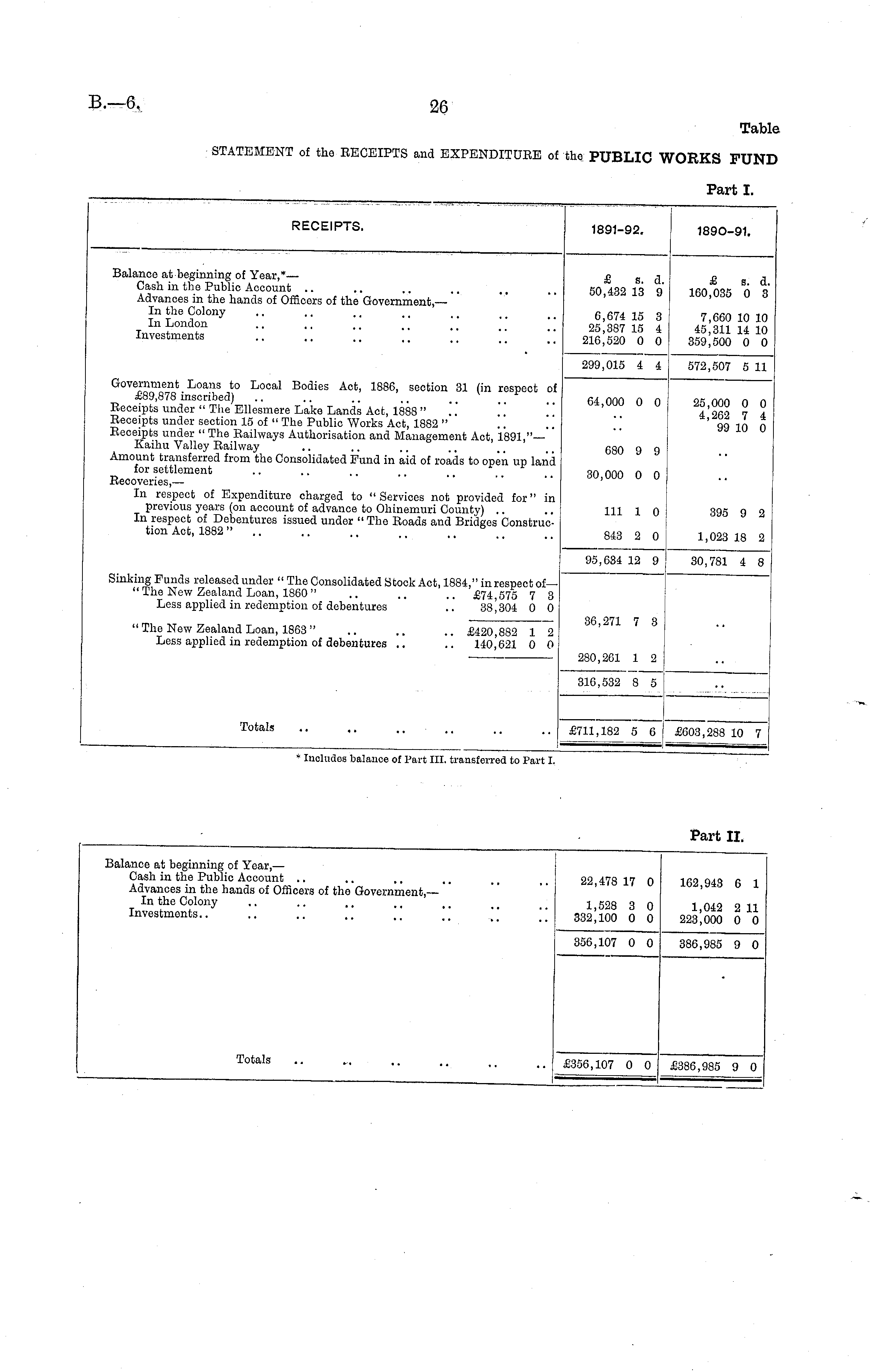 RECEIPTS. 1891-92. 1890-91. Balance at beginning of Year,* — Cash in the Public Account Advances in the hancls of Officers of the Government,— In the Colony In London Investments £ s. d. 50,432 13 9 6,674 15 3 25,387 15 4 216,520 0 0 £ s. d. 160,035 0 3 7,660 10 10 45,311 14 10 359,500 0 0 Government Loans to Local Bodies Act, 1886, section 31 (in respect of £89,878 inscribed) .. .. .. .. .... Eeceipts under " The Bllesmere Lake Lands Act, 1888 " Beceipts under section 15 of " The Public Works Act, 1882 " !. Eeceipts under " The Eailways Authorisation and Management Act, 1891,"—'' Kaihu Valley Eailway Amount transferred from the Consolidated Fund in aid of roads to open up land for settlement Eecoveries, — In respect of Expenditure charged to " Services not provided for" in previous years (on account of advance to Ohinemuri County) In respect of Debentures issued under " The Eoads and Bridges Construction Act, 1882 " .. .. .. .. .. .. 299,015 4 4 572,507 5 11 64,000 0 0 25,000 0 0 4,262 7 4 99 10 0 680 9 9 30,000 0 0 111 1 0 395 9 2 843 2 0 1,023 18 2 Sinking Funds released under " The Consolidated Stock Act, 1884," in respect of— " The New Zealand Loan, 1860 " .. .. .. £74,575 7 3 Less applied in redemption of debentures .. 38 ] 304 0 0 95,634 12 9 30,781 4 8 " The New Zealand Loan, 1863" .. .. .. £420,882 1 2 Less applied in redemption of debentures .. .. 140,'621 0 0 36,271 7 3 280,261 1 2 316,532 8 5 Totals .. ,. .... £711,182 5 6 £603,288 10 7 ♦ Includes balance of Part III. transferred to Part I. Part II. ialance at beginning of Year, — Cash in the Public Account Advances in the hands of Officers of the Government,— In the Colony Investments.. .. .. .. ., " 22,478 17 0 1,528 3 0 332,100 0 0 162,943 6 1 1,042 2 11 223,000 0 0 356,107 0 0 386,985 9 0 Totals £356,107 0 0 £386,985 9 0