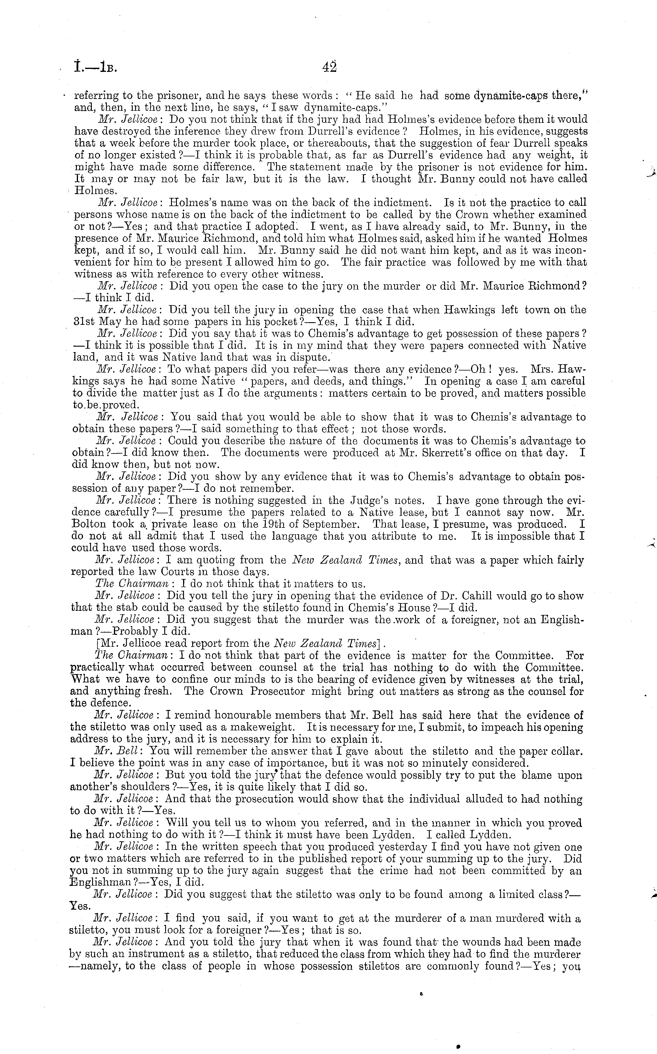 referring to the prisoner, and he says these words : " He said he had some dynamite-caps there,' , and, then, in the next line, he says, " I saw dynamite-caps." Mr. Jellicoe : Do you not think that if the jury had had Holmes's evidence before them it would have destroyed the inference the}' drew from Durrell's evidence ? Holmes, in his evidence, suggests that a week before the murder took place, or thereabouts, that the suggestion of fear Durrell speaks of no longer existed ?—I think it is probable that, as far as Durrell's evidence had any weight, it might have made some difference. The statement made by the prisoner is not evidence for him. It may or may not be fair law, but it is the law. I thought Mr. Bunny could not have called Holmes. Mr. Jellicoe : Holmes's name was on the back of the indictment. Is it not the practice to call persons whose name is on the back of the indictment to be called by the Crown whether examined or not?— Yes; and that practice I adopted. I went, as I have already said, to Mr. Bunny, in the presence of Mr. Maurice Eichmond, and told him what Holmes said, asked him if he wanted Holmes kept, and if so, I would call him. Mr. Bunny said he did not want him kept, and as it was inconvenient for him to be present I allowed him to go. The fair practice was followed by me with that witness as with reference to every other witness. Mr. Jellicoe : Did you open the case to the jury on the murder or did Mr. Maurice Eichmond? —I think I did. Mr. Jellicoe : Did you tell the jury in opening the case that when Hawkings left town on the 31st May he had some papers in his pocket ?—Yes, I think I did. Mr. Jellicoe : Did you say that it was to Chemis's advantage to get possession of these papers ? —I think it is possible that I did. It is in my mind that they were papers connected with Native land, and it was Native land that was in dispute. Mr. Jellicoe :To what papers did you refer—was there any evidence ?—Oh ! yes. Mrs. Hawkings says he had some Native " papers, and deeds, and things." In opening a case lam careful to divide the matter just as I do the arguments : matters certain to be proved, and matters possible to.be.proved. Mr. Jellicoe : You said that you would be able to show that it was to Chemis's advantage to obtain these papers ?—I said something to that effect; not those words. Mr. Jellicoe : Could you describe the nature of the documents it was to Chemis's advantage to obtain ?—I did know then. The documents were produced at Mr. Skerrett's office on that day. I did know then, but not now. Mr. Jellicoe : Did you show by any evidence that it was to Chemis's advantage to obtain possession of any paper?—l do not remember. Mr. Jellicoe : There is nothing suggested in the Judge's notes. I have gone through the evidence carefully ?—I presume the papers related to a Native lease, but I cannot say now. Mr. Bolton took a, private lease on the 19th of September. That lease, I presume, was produced. I do not at all admit that I used the language that you attribute to me. It is impossible that I could have used those words. Mr. Jellicoe : I am quoting from the New Zealand Times, and that was a paper which fairly reported the law Courts in those days. The Chairman : I do not think that it matters to us. Mr. Jellicoe : Did you tell the jury in opening that the evidence of Dr. Cahill would go to show that the stab could be caused by the stiletto found in Chemis's House?—l did. Mr. Jellicoe : Did you suggest that the murder was the .work of a foreigner, not an Englishman ?—Probably I did. [Mr. Jellicoe read report from the New Zealand Times]. The Chairman : Ido not think that part of the evidence is matter for the Committee. For practically what occurred between counsel at the trial has nothing to do with the Committee. What we have to confine our minds to is the bearing of evidence given by witnesses at the trial, and anything fresh. The Crown Prosecutor might bring out matters as strong as the counsel for the defence. Mr. Jellicoe : I remind honourable members that Mr. Bell has said here that the evidence of the stiletto was only used as a makeweight. It is necessary for me, I submit, to impeach his opening address to the jury, and it is necessary for him to explain it. Mr. Bell: You will remember the answer that I gave about the stiletto and the paper collar. I believe the point was in any case of importance, but it was not so minutely considered. Mr. Jellicoe : But you told the jury* that the defence would possibly try to put the blame upon another's shoulders ?—Yes, it is quite likely that I did so. Mr. Jellicoe : And that the prosecution would show that the individual alluded to had nothing to do with it ?—Yes. Mr. Jellicoe : Will you tell us to whom you referred, and in the manner in which you proved he had nothing to do with it ?—I think it must have been Lydden. I called Lydden. Mr. Jellicoe : In the written speech that you produced yesterday I find you have not given one or two matters which are referred to in the published report of your summing up to the jury. Did you not in summing up to the jury again suggest that the crime had not been committed by an Englishman?— Yes, I did. Mr. Jellicoe : Did you suggest that the stiletto was only to be found among a limited class ?— Yes. Mr. Jellicoe: I find you said, if you want to get at the murderer of a man murdered with a stiletto, you must look for a foreigner ?—Yes ; that is so. Mr. Jellicoe : And you told the jury that when it was found that the wounds had been made by such an instrument as a stiletto, that reduced the class from which they had to find the murderer ■ —namely, to the class of people in whose possession stilettos are commonly found ? —Yes; you •
