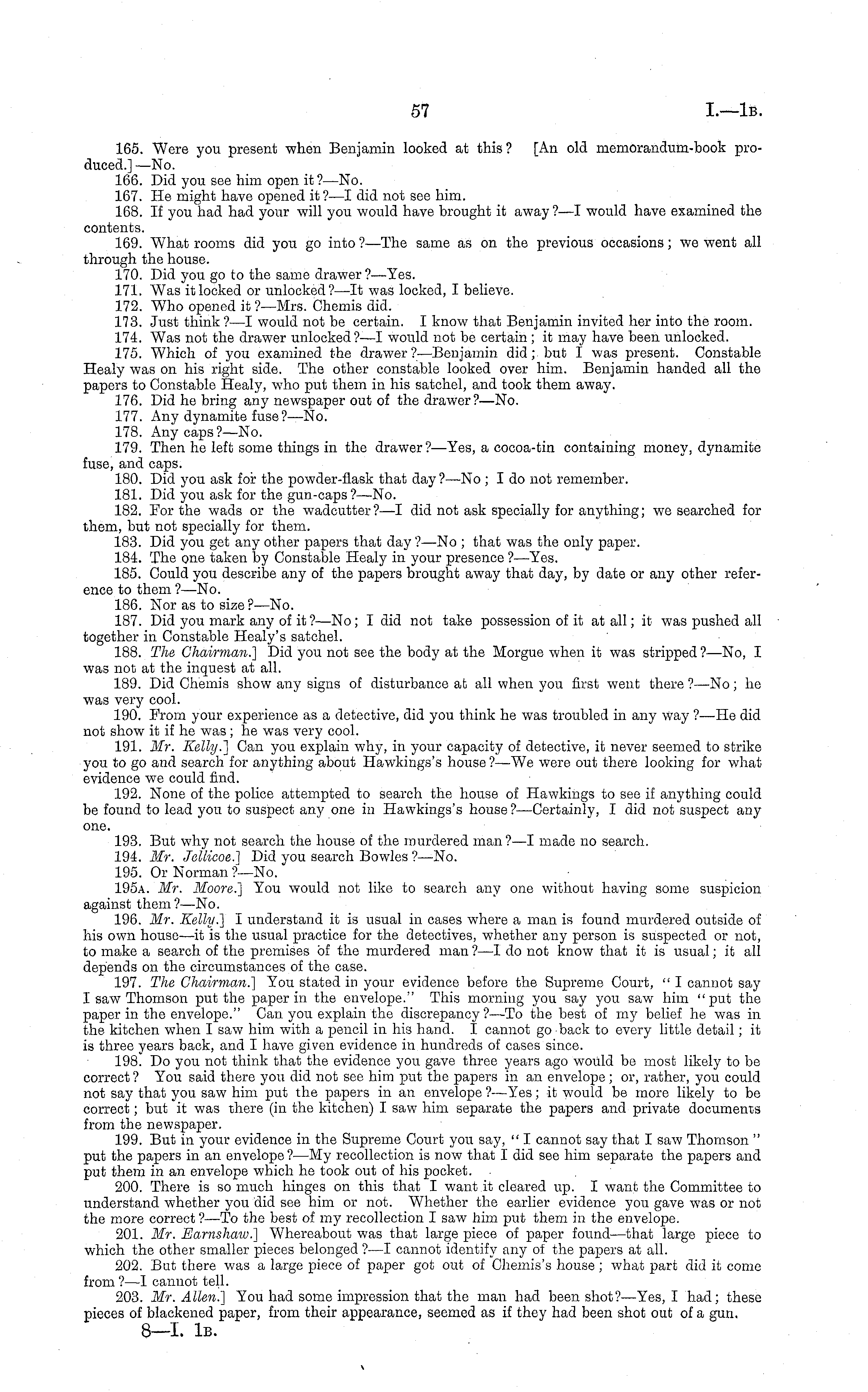 165. Were you present when Benjamin looked at this? [An old memorandum-book produced.] —No. 166. Did you see him open it? —No. 167. He might have opened it ? —I did not see him. 168. If you had had your will you would have brought it away ?—I would have examined the contents. 169. What rooms did you go into ?—The same as on the previous occasions; we went all through the house. 170. Did you go to the same drawer ?—Yes. 171. Was it locked or unlocked?—lt was locked, I believe. 172. Who opened it ?—Mrs. Chemis did. 173. Just think ?—I would not be certain. I know that Benjamin invited her into the room. 174. Was not the drawer unlocked? —I would not be certain; it may have been unlocked. 175. Which of you examined the drawer? —Benjamin did; but I was present. Constable Healy was on his right side. The other constable looked over him. Benjamin handed all the papers to Constable Healy, who put them in his satchel, and took them away. 176. Did he bring any newspaper out of the drawer?— No. 177. Any dynamite fuse ? —No. 178. Any caps ?—No. 179. Then he left some things in the drawer?— Yes, a cocoa-tin containing money, dynamite fuse, and caps. 180. Did you ask for the powder-flask that day?—No ; I do not remember. 181. Did you ask for the gun-caps? —No. 182. For the wads or the wadcutter?—l did not ask specially for anything; we searched for them, but not specially for them. 183. Did you get any other papers that day ?—No ; that was the only paper. 184. The one taken by Constable Healy in your presence ?—Yes. 185. Could you describe any of the papers brought away that day, by date or any other reference to them ?—No. 186. Nor as to size ?—No. 187. Did you mark any of it?—No; I did not take possession of it at all; it was pushed all together in Constable Healy's satchel. 188. The Chairman.'] Did you not see the body at the Morgue when it was stripped?—No, I was not at the inquest at all. 189. Did Chemis show any signs of disturbance at all when you first went there ? —No; he was very cool. 190. From your experience as a detective, did you think he was troubled in any way ?—He did not show it if he was; he was very cool. 191. Mr. Kelly.'] Can you explain why, in your capacity of detective, it never seemed to strike you to go and search for anything about Hawkings's house?—We were out there looking for what evidence we could find. 192. None of the police attempted to search the house of Hawkings to see if anything could be found to lead you to suspect any one in Hawkings's house ?—Certainly, I did not suspect any one. 193. But why not search the house of the murdered man?—l made no search. 194. Mr. Jellicoe.] Did you search Bowles ?—No. 195. Or Norman ?—No. 195 a. Mr. Moore.] You would not like to search any one without having some suspicion against them?— No. 196. Mr. Kelly.] I understand it is usual in cases where a man is found murdered outside of his own house—it is the usual practice for the detectives, whether any person is suspected or not, to make a search of the premises of the murdered man ?—I do not know that it is usual; it all depends on the circumstances of the case. 197. The Chairman.] You stated in your evidence before the Supreme Court, " I cannot say I saw Thomson put the paper in the envelope.'' This morning you say you saw him "put the paper in the envelope." Can you explain the discrepancy?—To the best of my belief he was in the kitchen when I saw him with a pencil in his hand. I cannot go back to every little detail; it is three years back, and I have given evidence in hundreds of cases since. 198. Do you not think that the evidence you gave three years ago would be most likely to be correct ? You said there you did not see him put the papers in an envelope ; or, rather, you could not say that you saw him put the papers in an envelope ?—Yes; it would be more likely to be correct; but it was there (in the kitchen) I saw him separate the papers and private documents from the newspaper. 199. But in your evidence in the Supreme Court you say, " I cannot say that I saw Thomson " put the papers in an envelope ? —My recollection is now that I did see him separate the papers and put them in an envelope which he took out of his pocket. 200. There is so much hinges on this that I want it cleared up. I want the Committee to understand whether you did see him or not. Whether the earlier evidence you gave was or not the more correct ?—To the best of my recollection I saw him put them in the envelope. 201. Mr. Earnshaw.] Whereabout was that large piece of paper found—that large piece to which the other smaller pieces belonged ? —I cannot identify any of the papers at all. 202. But there was a large piece of paper got out of Chemis's house; what part did it come from? —I cannot tell. 203. Mr. Allen.] You had some impression that the man had been shot?— Yes, I had; these pieces of blackened paper, from their appearance, seemed as if they had been shot out of a gun. B—l. Iβ.