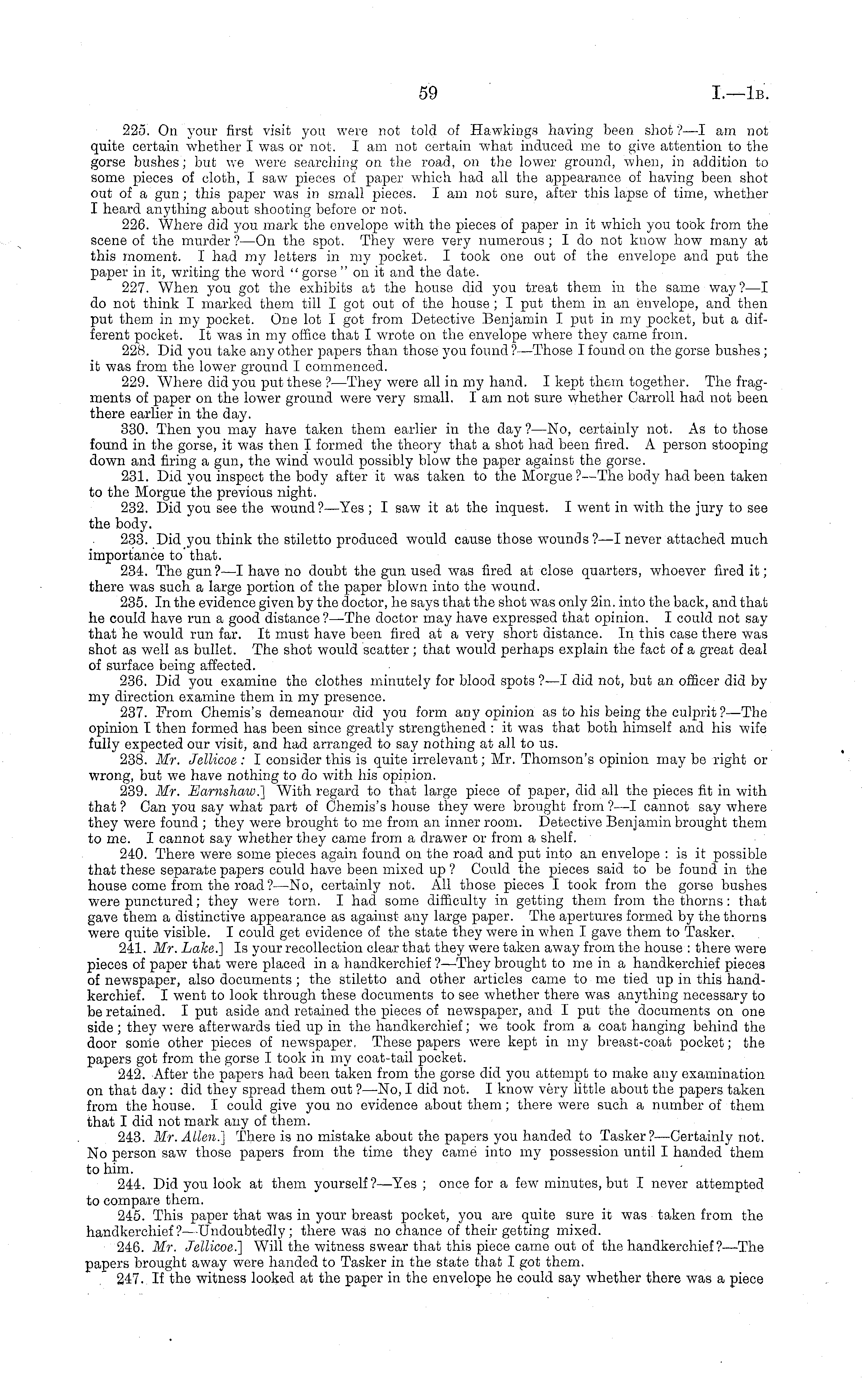 225. On your first visit you were not told of Hawkings having been shot ? —I am not quite certain whether I was or not. I am not certain what induced me to give attention to the gorse bushes; but we were searching on the road, on the lower ground, when, in addition to some pieces of cloth, I saw pieces of paper which had all the appearance of having been shot out of a gun; this paper was in small pieces. I am not sure, after this lapse of time, whether I heard anything about shooting before or not. 226. Where did you mark the envelope with the pieces of paper in it which you took from the scene of the murder ?—On the spot. They were very numerous ; I do not know how many at this moment. I had my letters in my pocket. I took one out of the envelope and put the paper in it, writing the word " gorse " on it and the date. 227. When you got the exhibits at the house did you treat them in the same way? —I do not think I marked them till I got out of the house ; I put them in an envelope, and then put them in my pocket. One lot I got from Detective Benjamin I put in my pocket, but a different pocket. It was in my office that I wrote on the envelope where they came from. 228. Did you take any other papers than those you found ?—Those I found on the gorse bushes ; it was from the lower ground I commenced. 229. Where did you put these ? —They were all in my hand. I kept them together. The fragments of paper on the lower ground were very small. lam not sure whether Carroll had not been there earlier in the day. 330. Then you may have taken them earlier in the day?—No, certainly not. As to those found in the gorse, it was then I formed the theory that a shot had been fired. A person stooping down and firing a gun, the wind would possibly blow the paper against the gorse. 231. Did you inspect the body after it was taken to the Morgue?— The body had been taken to the Morgue the previous night. 232. Did you see the wound? —Yes ; I saw it at the inquest. I went in with the jury to see the body. 233. Did you think the stiletto produced would cause those wounds? —I never attached much importance to that. 234. The gun?—l have no doubt the gun used was fired at close quarters, whoever fired it; there was such a large portion of the paper blown into the wound. 235. In the evidence given by the doctor, he says that the shot was only 2in. into the back, and that he could have run a good distance ?—The doctor may have expressed that opinion. I could not say that he would run far. It must have been fired at a very short distance. In this case there was shot as well as bullet. The shot would scatter ; that would perhaps explain the fact of a great deal of surface being affected. 236. Did you examine the clothes minutely for blood spots ?—I did not, but an officer did by my direction examine them in my presence. 237. From Chemis's demeanour did you form any opinion as to his being the culprit ? —The opinion I then formed has been since greatly strengthened : it was that both himself and his wife fully expected our visit, and had arranged to say nothing at all to us. 238. Mr. Jellicoe : I consider this is quite irrelevant; Mr. Thomson's opinion may be right or wrong, but we have nothing to do with his opinion. 239. Mr. Earnshaw.] With regard to that large piece of paper, did all the pieces fit in with that ? Can you say what part of Chemis's house they were brought from ?—I cannot say where they were found ; they were brought to me from an inner room. Detective Benjamin brought them to me. I cannot say whether they came from a drawer or from a shelf. 240. There were some pieces again found on the road and put into an envelope : is it possible that these separate papers could have been mixed up ? Could the pieces said to be found in the house come from the road ?—No, certainly not. All those pieces I took from the gorse bushes were punctured; they were torn. I had some difficulty in getting them from the thorns : that gave them a distinctive appearance as against any large paper. The apertures formed by the thorns were quite visible. I could get evidence of the state they were in when I gave them to Tasker. 241. Mr. Lake.] Is your recollection clear that they were taken away from the house : there were pieces of paper that were placed in a handkerchief ? —They brought to me in a handkerchief pieces of newspaper, also documents ; the stiletto and other articles came to me tied up in this handkerchief. I went to look through these documents to see whether there was anything necessary to be retained. I put aside and retained the pieces of newspaper, and I put the documents on one side ; they were afterwards tied up in the handkerchief; we took from a coat hanging behind the door sonic other pieces of newspaper, These papers were kept in my breast-coat pocket; the papers got from the gorse I took in my coat-tail pocket. 242. After the papers had been taken from the gorse did you attempt to make any examination on that day : did they spread them out ? —No, I did not. I know very little about the papers taken from the house. I could give you no evidence about them ; there were such a number of them that I did not mark any of them. 243. Mr. Allen.'] There is no mistake about the papers you handed to Tasker?—Certainly not. No person saw those papers from the time they came into my possession until I handed them to him. 244. Did you look at them yourself?— Yes ; once for a few minutes, but I never attempted to compare them. 245. This paper that was in your breast pocket, you are quite sure it was taken from the handkerchief? —Undoubtedly; there was no chance of their getting mixed. 246. Mr. Jellicoe.] Will the witness swear that this piece came out of the handkerchief?— The papers brought away were handed to Tasker in the state that I got them. 247. If the witness looked at the paper in the envelope he could say whether there was a piece