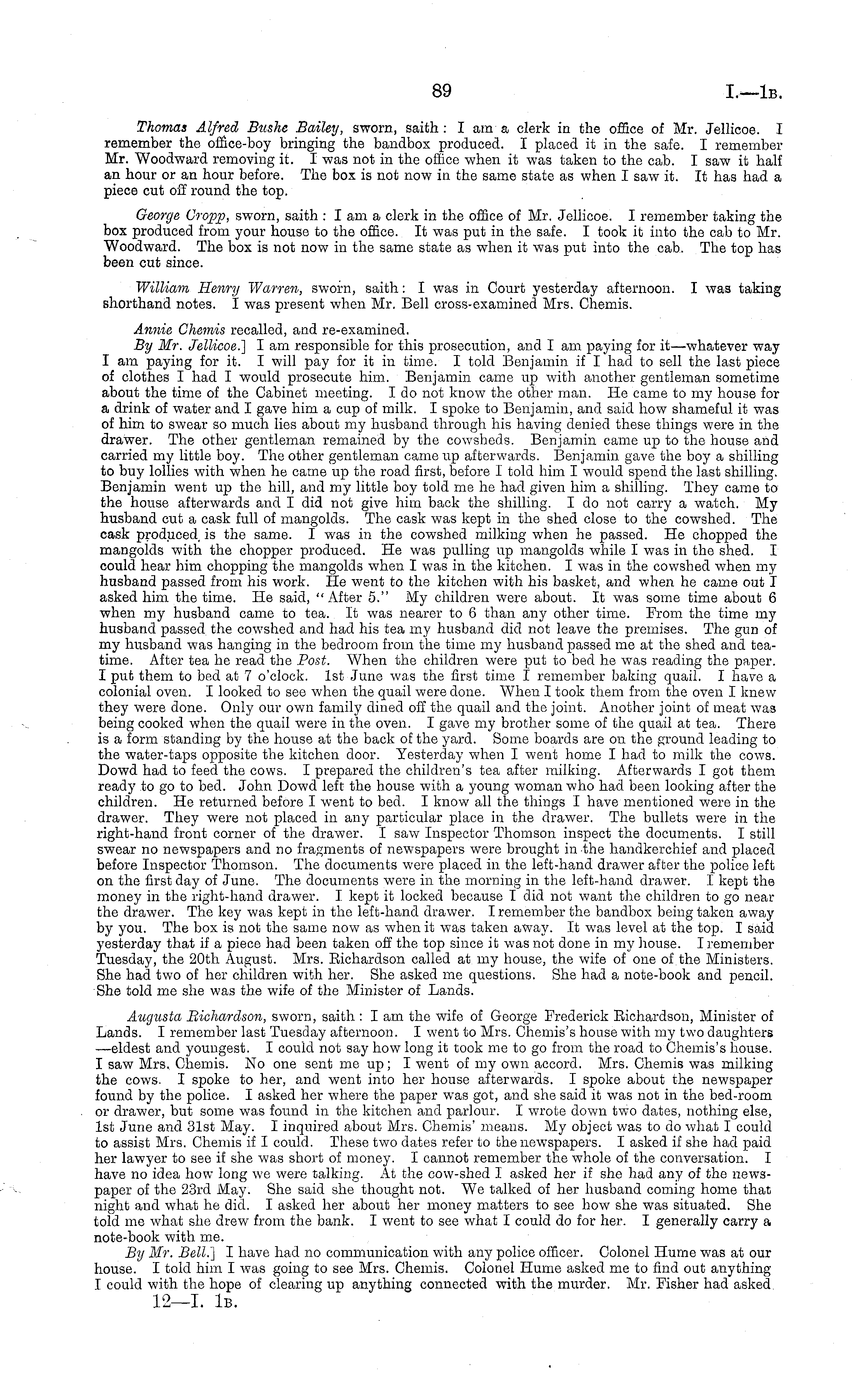 Thomas Alfred Bushe Bailey, sworn, saith : I am a clerk in the office of Mr. Jellicoe. I remember the office-boy bringing the bandbox produced. I placed it in the safe. I remember Mr. Woodward removing it. I was not in the office when it was taken to the cab. I saw it half an hour or an hour before. The box is not now in the same state as when I saw it. It has had a piece cut off round the top. George Gropp, sworn, saith :lam a clerk in the office of Mr. Jellicoe. I remember taking the box produced from your house to the office. It was put in the safe. I took it into the cab to Mr. Woodward. The box is not now in the same state as when it was put into the cab. The top has been cut since. William Henry Warren, sworn, saith: I was in Court yesterday afternoon. I was taking shorthand notes. I was present when Mr. Bell cross-examined Mrs. Chernis. Annie Chemis recalled, and re-examined. By Mr. Jellicoe.] lam responsible for this prosecution, and I am paying for it—whatever way I am paying for it. I will pay for it in time. I told Benjamin if I had to sell the last piece of clothes I had I would prosecute him. Benjamin came up with another gentleman sometime about the time of the Cabinet meeting. Ido not know the other man. He came to my house for a drink of water and I gave him a cup of milk. I spoke to Benjamin, and said how shameful it was of him to swear so much lies about my husband through his having denied these things were in the drawer. The other gentleman remained by the cowsheds. Benjamin came up to the house and carried my little boy. The other gentleman came up afterwards. Benjamin gave the boy a shilling to buy lollies with when he came up the road first, before I told him I would spend the last shilling. Benjamin went up the hill, and my little boy told me he had given him a shilling. They came to the house afterwards and I did not give him back the shilling. I do not carry a watch. My husband cut a cask full of mangolds. The cask was kept in the shed close to the cowshed. The cask prodμced, is the same. I was in the cowshed milking when he passed. He chopped the mangolds with the chopper produced. He was pulling up mangolds while I was in the shed. I could hear him chopping the mangolds when I was in the kitchen. I was in the cowshed when my husband passed from his work. He went to the kitchen with his basket, and when he came out I asked him the time. He said, "After 5." My children were about. It was some time about 6 when my husband came to tea. It was nearer to 6 than any other time. From the time my husband passed the cowshed and had his tea my husband did not leave the premises. The gun of my husband was hanging in the bedroom from the time my husband passed me at the shed and teatime. After tea he read the Post. When the children wore put to bod he was reading the paper. I put them to bed at 7 o'clock. Ist June was the first time I remember baking quail. I have a colonial oven. I looked to see when the quail were done. When I took them from the oven I knew they were done. Only our own family dined off the quail and the joint. Another joint of meat was being cooked when the quail were in the oven. I gave my brother some of the quail at tea. There is a form standing by the house at the back of the yard. Some boards are on the ground leading to the water-taps opposite the kitchen door. Yesterday when I went home I had to milk the cows. Dowd had to feed the cows. I prepared the children's tea after milking. Afterwards I got them ready to go to bed. John Dowd left the house with a young woman who had been looking after the children. He returned before I went to bed. I know all the things I have mentioned were in the drawer. They were not placed in any particular place in the drawer. The bullets were in the right-hand front corner of the drawer. I saw Inspector Thomson inspect the documents. I still swear no newspapers and no fragments of newspapers were brought in the handkerchief and placed before Inspector Thomson. The documents were placed in the left-hand drawer after the police left on the first day of June. The documents were in the morning in the left-hand drawer. I kept the money in the right-hand drawer. I kept it locked because 1 did not want the children to go near the drawer. The key was kept in the left-hand drawer. I remember the bandbox being taken away by you. The box is not the same now as when it was taken away. It was level at the top. I said yesterday that if a piece had been taken off the top since it was not done in my house. I remember Tuesday, the 20th August. Mrs. Eichardson called at my house, the wife of one of the Ministers. She had two of her children with her. She asked me questions. She had a, note-book and pencil. She told me she was the wife of the Minister of Lands. Augusta Richardson, sworn, saith : I am the wife of George Frederick Eichardson, Minister of Lands. I remember last Tuesday afternoon. I went to Mrs. Chemis's house with my two daughters —eldest and youngest. I could not say how long it took me to go from the road to Chemis's house. I saw Mrs. Chemis. No one sent me up; I went of my own accord. Mrs. Chemis was milking the cows. I spoke to her, and went into her house afterwards. I spoke about the newspaper found by the police. I asked her where the paper was got, and she said it was not in the bed-room or drawer, but some was found in the kitchen and parlour. I wrote down two dates, nothing else, Ist June and 31st May. I inquired about Mrs. Chemis' means. My object was to do what I could to assist Mrs. Chemis if I could. These two dates refer to the newspapers. I asked if she had paid her lawyer to see if she was short of money. I cannot remember the whole of the conversation. I have no idea how long we were talking. At the cow-shed I asked her if she had any of the newspaper of the 23rd May. She said she thought not. We talked of her husband coming home that night and what he did. I asked her about her money matters to see 