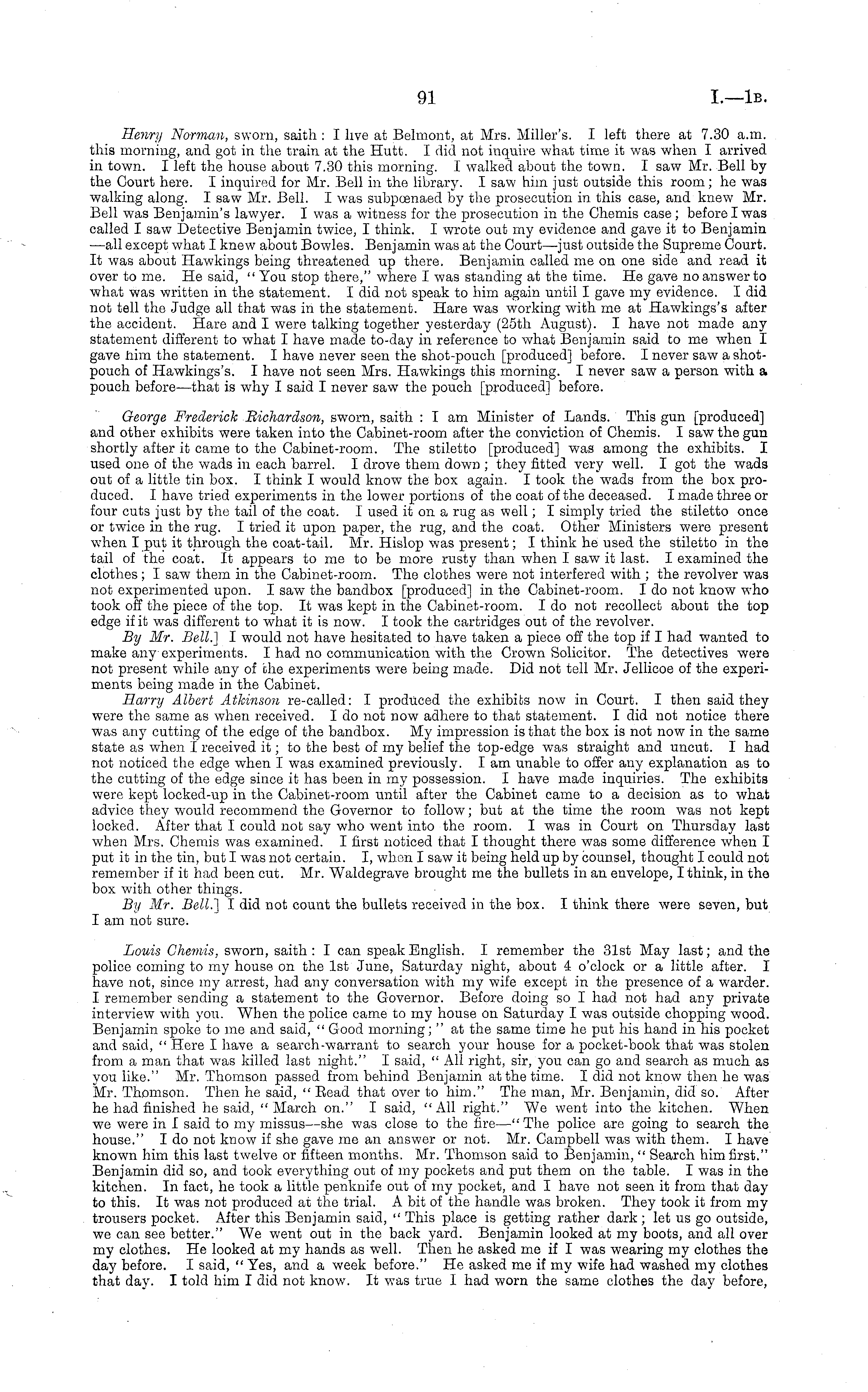 Henry Norman, sworn, saith : I live at Belmont, at Mrs. Miller's. I left there at 7.30 a.m. this morning, and got in the train at the Hutt. I did not inquire what time it was when I arrived in town. I left the house about 7.30 this morning. I walked about the town. I saw Mr. Bell by the Court here. I inquired for Mr. Bell in the library. I saw him just outside this room; he was walking along. I saw Mr. Bell. I was subpoenaed by the prosecution in this case, and knew Mr. Bell was Benjamin's lawyer. I was a witness for the prosecution in the Chemis case ; before I was called I saw Detective Benjamin twice, I think. I wrote out my evidence and gave it to Benjamin —all except what I knew about Bowles. Benjamin was at the Court—just outside the Supreme Court. It was about Hawkings being threatened up there. Benjamin called me on one side and read it over to me. He said, "You stop there," where I was standing at the time. He gave no answer to what was written in the statement. I did not speak to him again until I gave my evidence. I did not tell the Judge all that was in the statement. Hare was working with me at Hawkings's after the accident. Hare and I were talking together yesterday (25th August). I have not made any statement different to what I have made to-day in reference to what Benjamin said to me when I gave nim the statement. I have never seen the shot-pouch [produced] before. I never saw a shotpouch of Hawkings's. I have not seen Mrs. Hawkings this morning. I never saw a person with a pouch before—that is why I said I never saw the pouch [produced] before. George Frederick Bichardson, sworn, saith : I am Minister of Lands. This gun [produced] and other exhibits were taken into the Cabinet-room after the conviction of Chemis. I saw the gun shortly after it came to the Cabinet-room. The stiletto [produced] was among the exhibits. I used one of the wads in each barrel. I drove them down ; they fitted very well. I got the wads out of a little tin box. I think I would know the box again. I took the wads from the box produced. I have tried experiments in the lower portions of the coat of the deceased. I made three or four cuts just by the tail of the coat. I used it on a rug as well; I simply tried the stiletto once or twice in the rug. I tried it upon paper, the rug, and the coat. Other Ministers were present when I put it through the coat-tail. Mr. Hislop was present; I think he used the stiletto in the tail of the coat. It appears to me to be more rusty than when I saw it last. I examined the clothes ; I saw them in the Cabinet-room. The clothes were not interfered with ; the revolver was not experimented upon. I saw the bandbox [produced] in the Cabinet-room. Ido not know who took off the piece of the top. It was kept in the Cabinet-room. Ido not recollect about the top edge if it was different to what it is now. I took the cartridges out of the revolver. By Mr. Bell.} I would not have hesitated to have taken a piece off the top if I had wanted to make any experiments. I had no communication with the Crown Solicitor. The detectives were not present while any of the experiments were being made. Did not tell Mr. Jellicoe of the experiments being made in the Cabinet. Harry Albert Atkinson re-called: I produced the exhibits now in Court. I then said they were the same as when received. Ido not now adhere to that statement. I did not notice there was any cutting of the edge of the bandbox. My impression is that the box is not now in the same state as when I received it; to the best of my belief the top-edge was straight and uncut. I had not noticed the edge when I was examined previously. lam unable to offer any explanation as to the cutting of the edge since it has been in my possession. I have made inquiries. The exhibits were kept locked-up in the Cabinet-room until after the Cabinet came to a decision as to what advice they would recommend the Governor to follow; but at the time the room was not kept locked. After that I could not say who went into the room. I was in Court on Thursday last when Mrs. Chemis was examined. I first noticed that I thought there was some difference when I put it in the tin, but I was not certain. I, whim I saw it being held up by counsel, thought I could not remember if it had been cut. Mr. Waldegrave brought me the bullets in an envelope, I think, in the box with other things. By Mr. Bell.] I did not count the bullets received in the box. I think there were seven, but I am not sure. Louis Chemis, sworn, saith: I can speak English. I remember the 31st May last; and the police coming to my house on the Ist June, Saturday night, about 4 o'clock or a little after. I have not, since my arrest, had any conversation with my wife except in the presence of a warder. I remember sending a statement to the Governor. Before doing so I had not had any private interview with you. When the police came to my house on Saturday I was outside chopping wood. Benjamin spoke to me and said, " Good morning; " at the same time he put his hand in his pocket and said, " Here I have a search-warrant to search your house for a pocket-book that was stolen from a man that was killed last night." I said, " All right, sir, you can go and search as much as you like." Mr. Thomson passed from behind Benjamin at the time. I did not know then he was Mr. Thomson. Then he said, " Eead that over to him." The man, Mr. Benjamin, did so. After he had finished he said, "March on." I said, "All right." We went into the kitchen. When we were in I said to my missus—she was close to the fire—"The police are going to search the house." Ido not know if she gave me an answer or not. Mr. Campbell was with them. I have known him this last twelve or fifteen months. Mr. Thomson said to Benjamin, " Search him first." Benjamin did so, and took everything out of my pockets and put them on the table. I was in the kitchen. In fact, he took a little penknife out of my pocket, and I have not seen it from tha