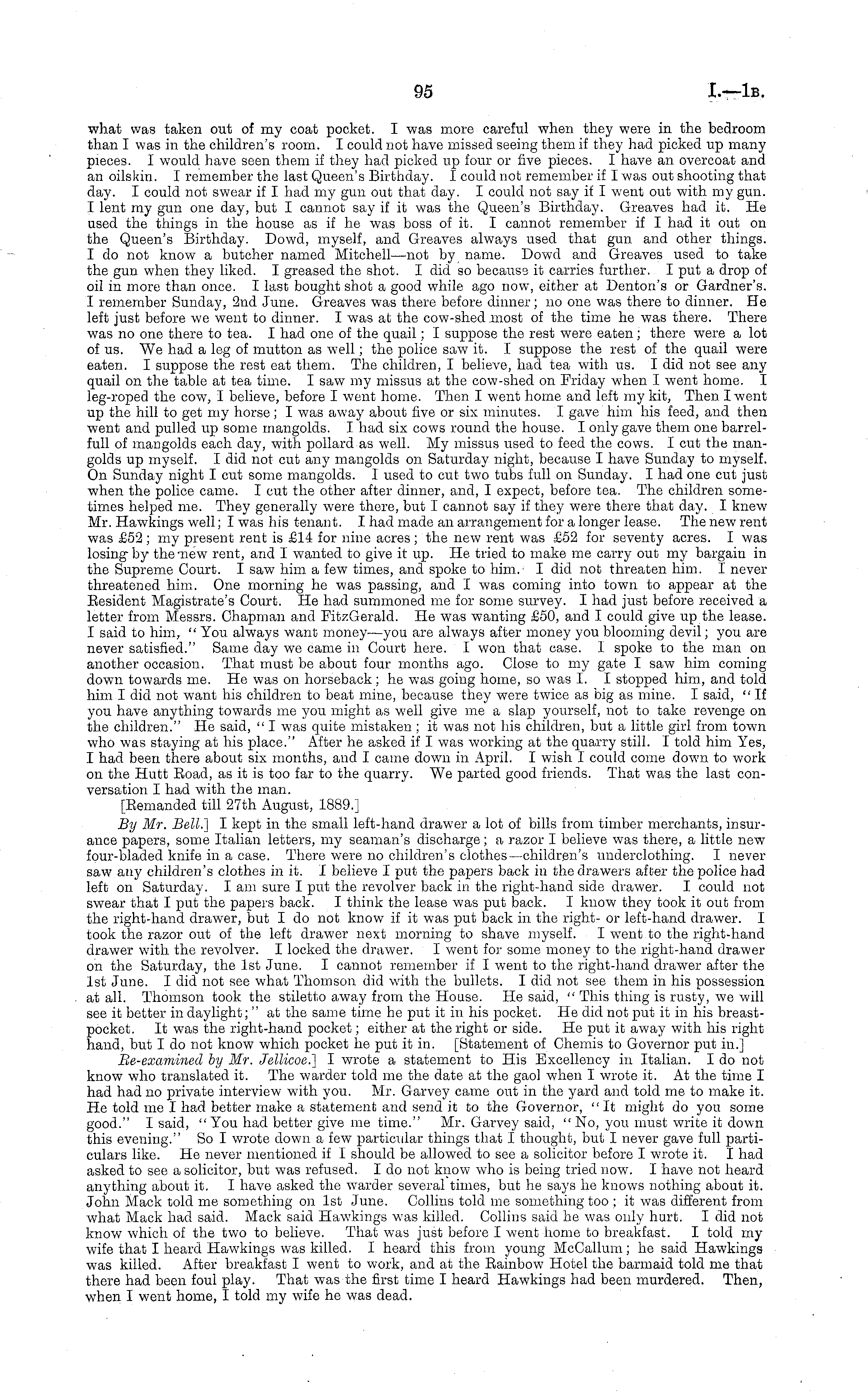 what was taken out of my coat pocket. I was more careful when they were in the bedroom than I was in the children's room. I could not have missed seeing them if they had picked up many pieces. I would have seen them if they had picked up four or five pieces. I have an overcoat and an oilskin. I remember the last Queen's Birthday. I could not remember if I was out shooting that day. I could not swear if I had my gun out that day. I could not say if I went out with my gun. I lent my gun one day, but I cannot say if it was the Queen's Birthday. Greaves had it. He used the things in the house as if he was boss of it. I cannot remember if I had it out on the Queen's Birthday. Dowd, myself, and Greaves always used that gun and other things. I do not know a butcher named Mitchell—not by name. Dowd and Greaves used to take the gun when they liked. I greased the shot. I did so because it carries further, I put a drop of oil in more than once. I last bought shot a good while ago now, either at Denton's or Gardner's. I remember Sunday, 2nd June. Greaves was there before dinner; no one was there to dinner. He left just before we went to dinner. I was at the cow-shed most of the time he was there. There was no one there to tea. I had one of the quail; I suppose the rest were eaten; there were a lot of us. We had a leg of mutton as well; the police saw it. I suppose the rest of the quail were eaten. I suppose the rest eat them. The children, I believe, had tea with us. I did not see any quail on the table at tea time. I saw my missus at the cow-shed on Friday when I went home. I leg-roped the cow, I believe, before I went home. Then I went home and left my kit, Then I went up the hill to get my horse; I was away about five or six minutes. I gave him his feed, and then went and pulled up some mangolds. I had six cows round the house. I only gave them one barrelfull of mangolds each day, with pollard as well. My missus used to feed the cows. I cut the mangolds up myself. I did not cut any mangolds on Saturday night, because I have Sunday to myself. On Sunday night I cut some mangolds. I used to cut two tubs full on Sunday. I had one cut just when the police came. I cut the other after dinner, and, I expect, before tea. The children sometimes helped me. They generally were there, but I cannot say if they were there that day. I knew Mr. Hawkings well; I was his tenant. I had made an arrangement for a longer lease. The new rent was £52 ; my present rent is £14 for nine acres ; the new rent was £52 for seventy acres. I was losing-by the-new rent, and I wanted to give it up. He tried to make me carry out my bargain in the Supreme Court. I saw him a few times, and spoke to him. I did not threaten him. I never threatened him. One morning he was passing, and I was coming into town to appear at the Resident Magistrate's Court. He had summoned me for some survey. I had just before received a letter from Messrs. Chapman and EitzGerald. He was wanting £50, and I could give up the lease. I said to him, " You always want money—you are always after money you blooming devil; you are never satisfied." Same day we came in Court here. I won that case. I spoke to the man on another occasion. That must be about four months ago. Close to my gate I saw him coming down towards me. He was on horseback ; he was going home, so was I. I stopped him, and told him I did not want his children to beat mine, because they were twice as big as mine. I said, "If you have anything towards me you might as well give me a slap yourself, not to take revenge on the children." He said, " I was quite mistaken ;it was not his children, but a little girl from town who was staying at his place." After he asked if I was working at the quarry still. I told him Yes, I had been there about six months, and I came down in April. I wish I could come down to work on the Hutt Eoad, as it is too far to the quarry. We parted good friends. That was the last conversation I had with the man. [Eemanded till 27th August, 1889. J By Mr. Bell.] I kept in the small left-hand drawer a lot of bills from timber merchants, insurance papers, some Italian letters, my seaman's discharge; a razor I believe was there, a little new four-bladed knife in a case. There were no children's clothes —children's underclothing. I never saw any children's clothes in it. I believe I put the papers back in the drawers after the police had left on Saturday. lam sure I put the revolver back in the right-hand side drawer. I could not swear that I put the papers back. I think the lease was put back. I know they took it out from the right-hand drawer, but I do not know if it was put back in the right- or left-hand drawer. I took the razor out of the left drawer next morning to shave myself. I went to the right-hand drawer with the revolver. I locked the drawer. I went for some money to the right-hand drawer on the Saturday, the Ist June. I cannot remember if I went to the right-hand drawer after the Ist June. I did not see what Thomson did with the bullets. I did not see them in his possession at all. Thomson took the stiletto away from the House. He said, " This thing is rusty, we will see it better in daylight; " at the same time he put it in his pocket. He did not put it in his breastpocket. It was the right-hand pocket; either at the right or side. He put it away with his right hand, but Ido not know which pocket he put it in. [Statement of Chemis to Governor put hi.] Be-examined by Mr. Jellicoe.] I wrote a statement to His Excellency in Italian. Ido not know who translated it. The warder told me the date at the gaol when I wrote it. At the time I had had no private interview with you. Mr. Garvey came out in the yard and told me to make it. He told me I had better make a statement and send it to the Governor, "It might do you some good." I said, " You had better give me time." Mr. Garvey said, " No, you must write it down this evening." So I wrote down a few particular things that